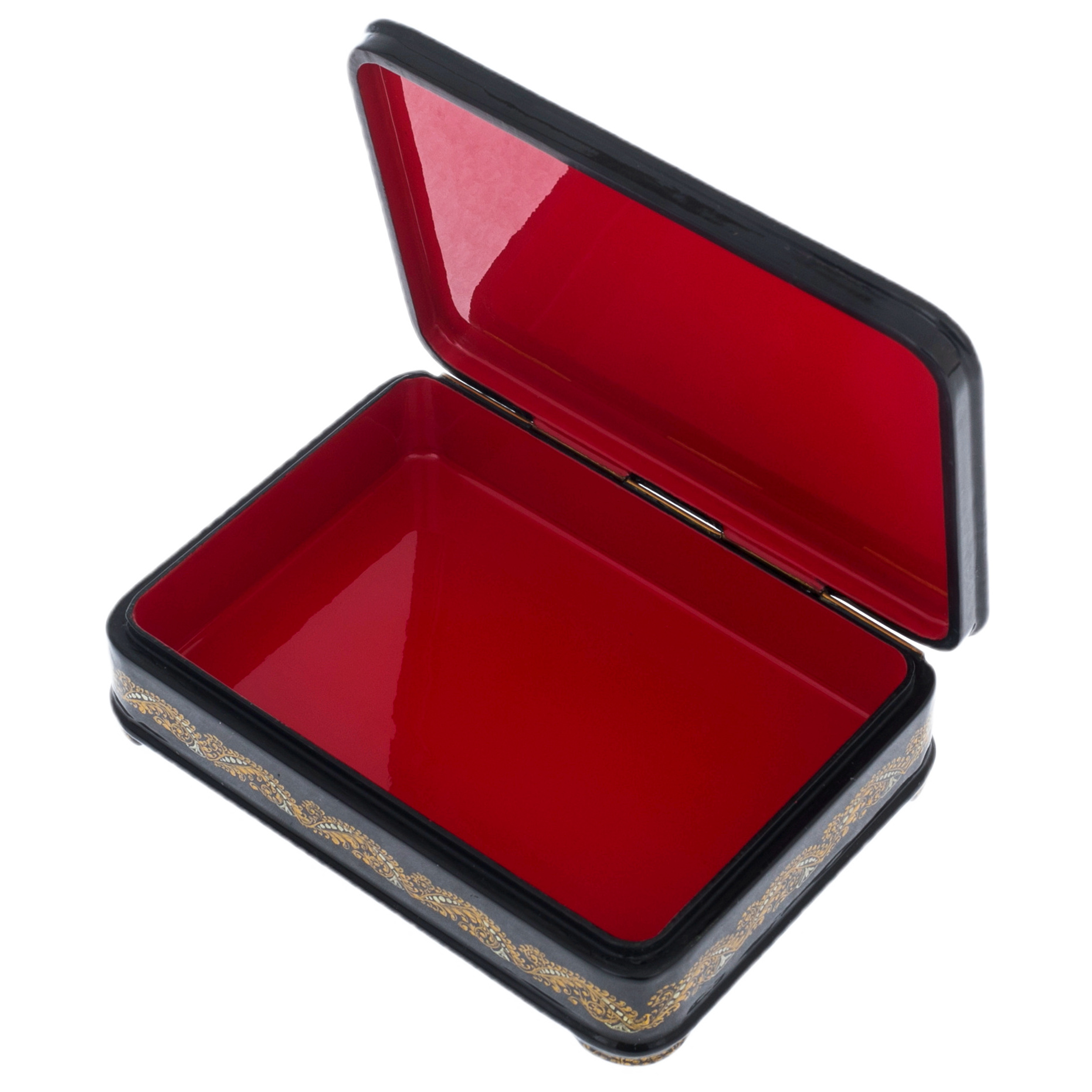 Внутри шкатулки — яркое красное покрытие, словно солнечный свет, пробивающийся сквозь тучи. Это пространство готово хранить драгоценности, секреты и воспоминания, превращая каждую мелочь в нечто значимое. Открывая ее, ощущаешь, как время замирает, а мир вокруг наполняется загадочностью и очарованием.