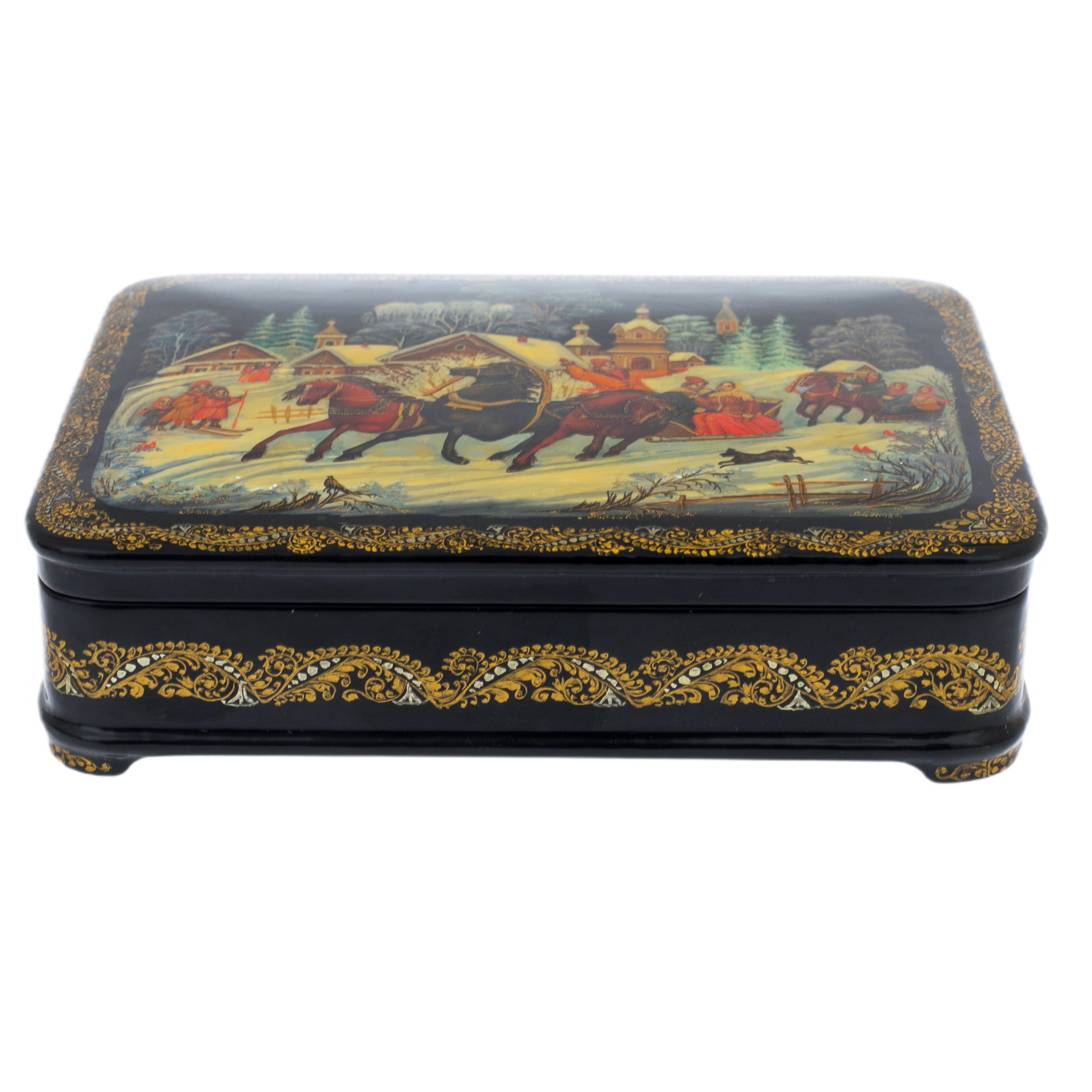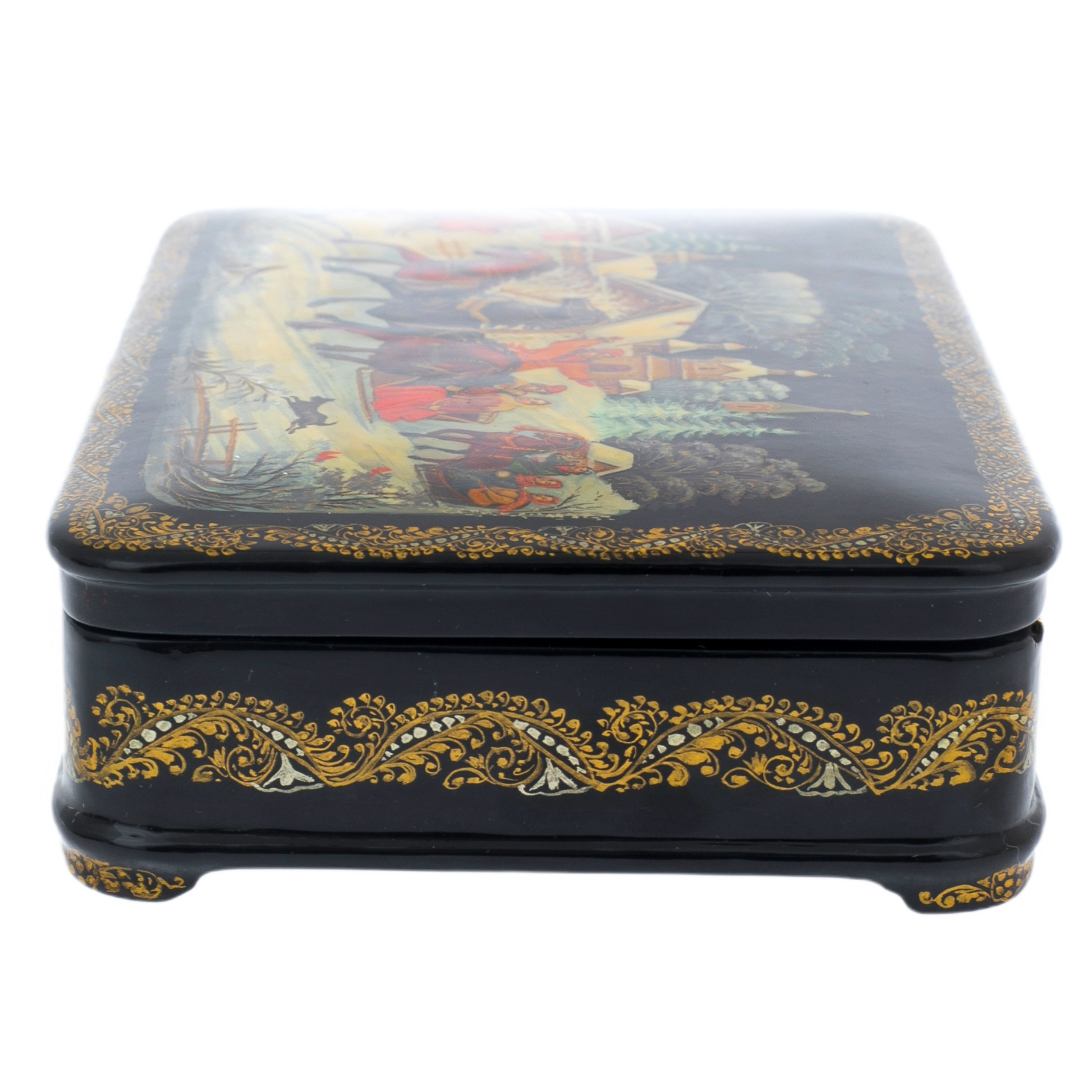 Мастера, вложившие свою душу в создание этой шкатулки, передали дыхание истории, запечатлев в ней дух русской культуры и традиций. Черный лак, словно ночное небо, обрамляет яркие сцены, создавая контраст, который захватывает дух и притягивает взгляд.