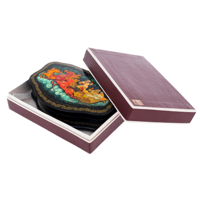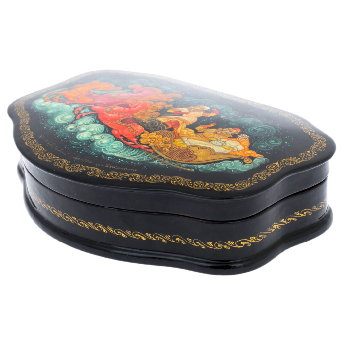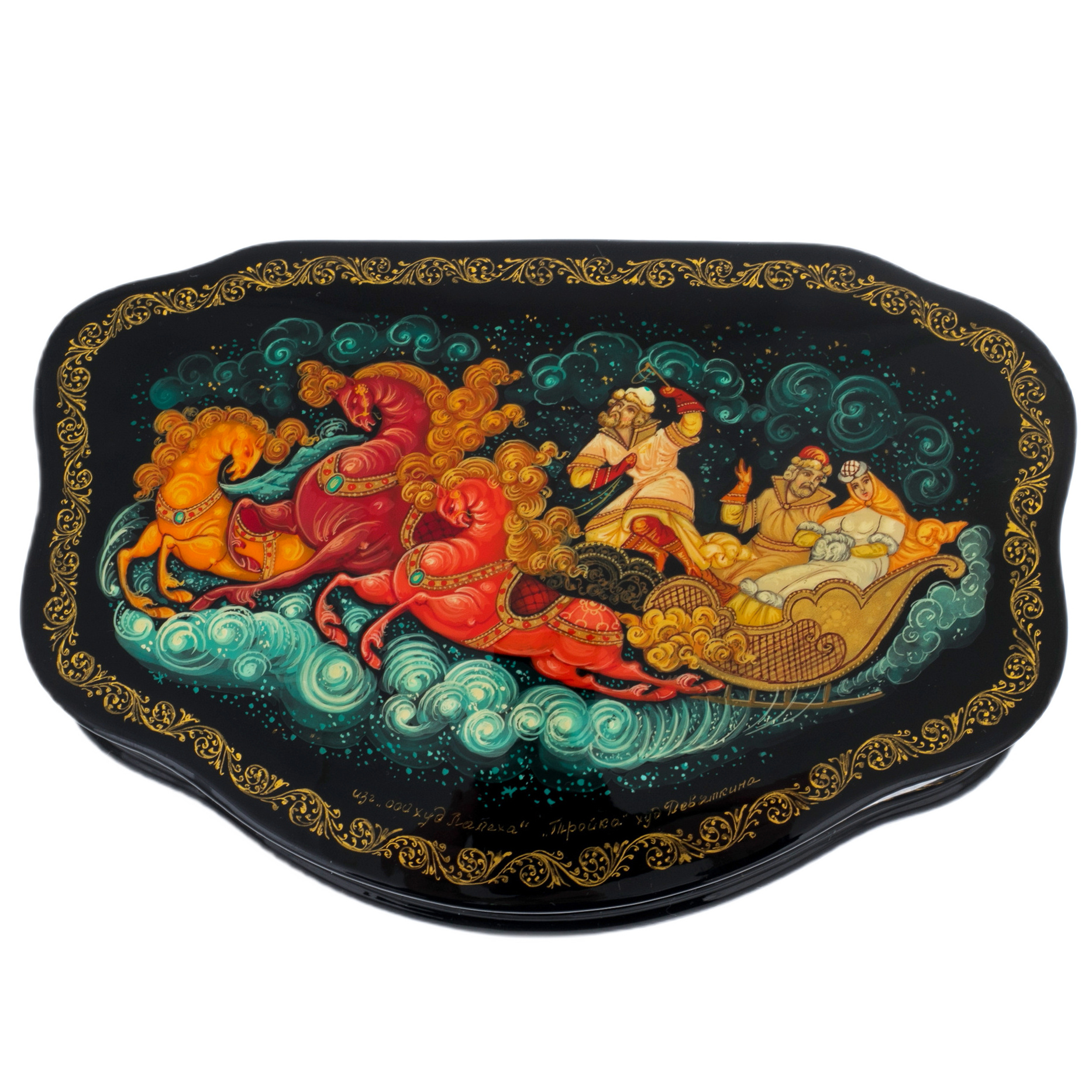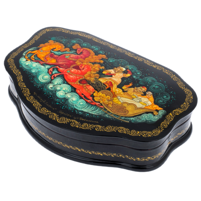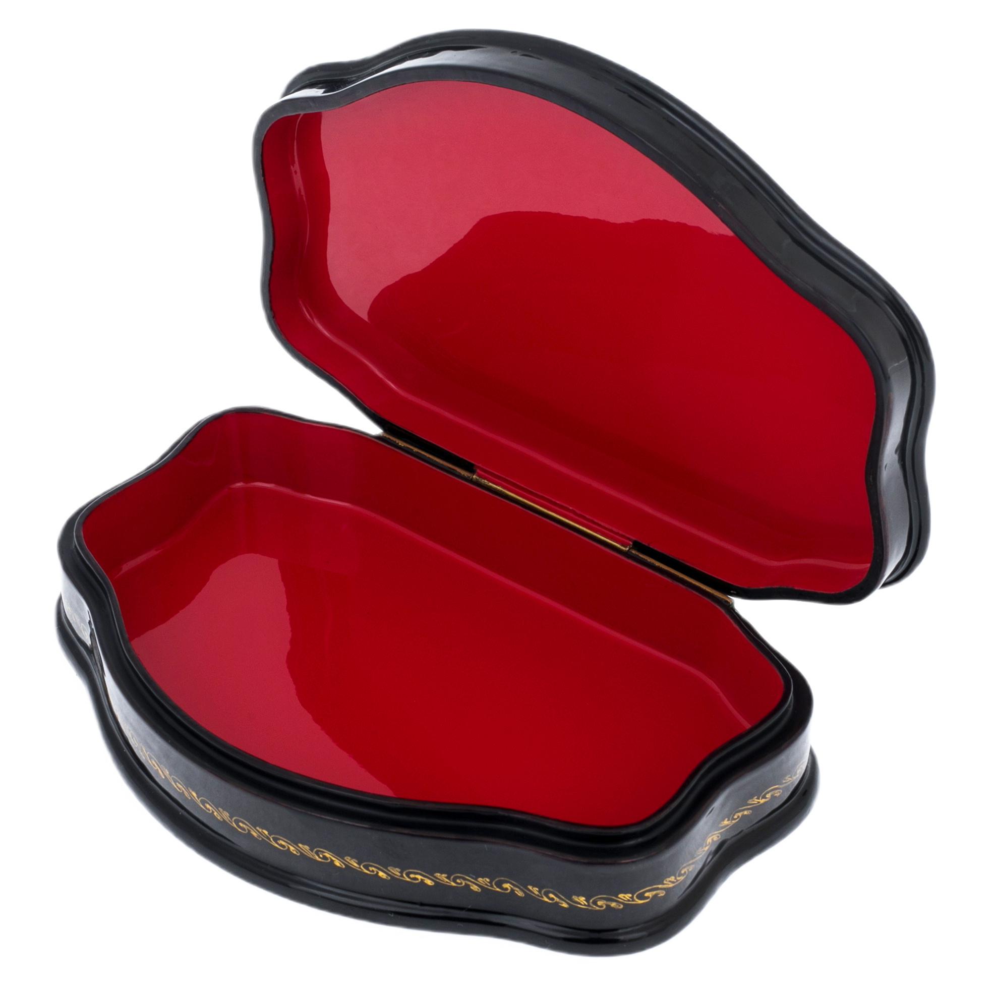 Это произведение палехских мастеров, выполненное в технике традиционной лаковой миниатюры, изначально создававшейся для самых взыскательных ценителей русского искусства. Корпус шкатулки формируется из прочной папье-маше, проходящего многоступенчатую сушку и покрываемого глубоким чёрным лаком, создающим эффект бездонной глянцевой поверхности. Внутреннее пространство выстлано густым красным лаком, контрастирующим с тёмным внешним блеском и подчёркивающим ощущение камерной драгоценности.