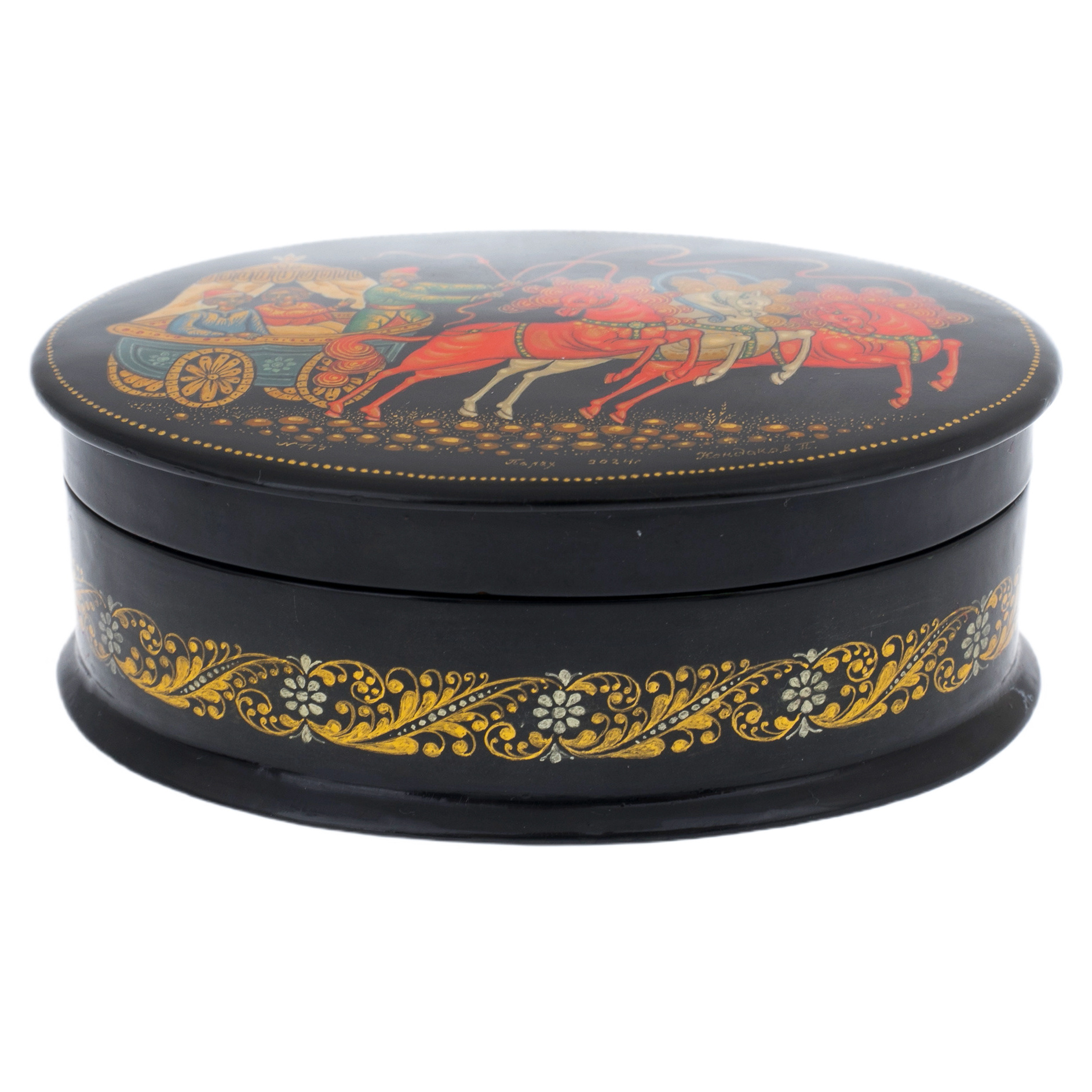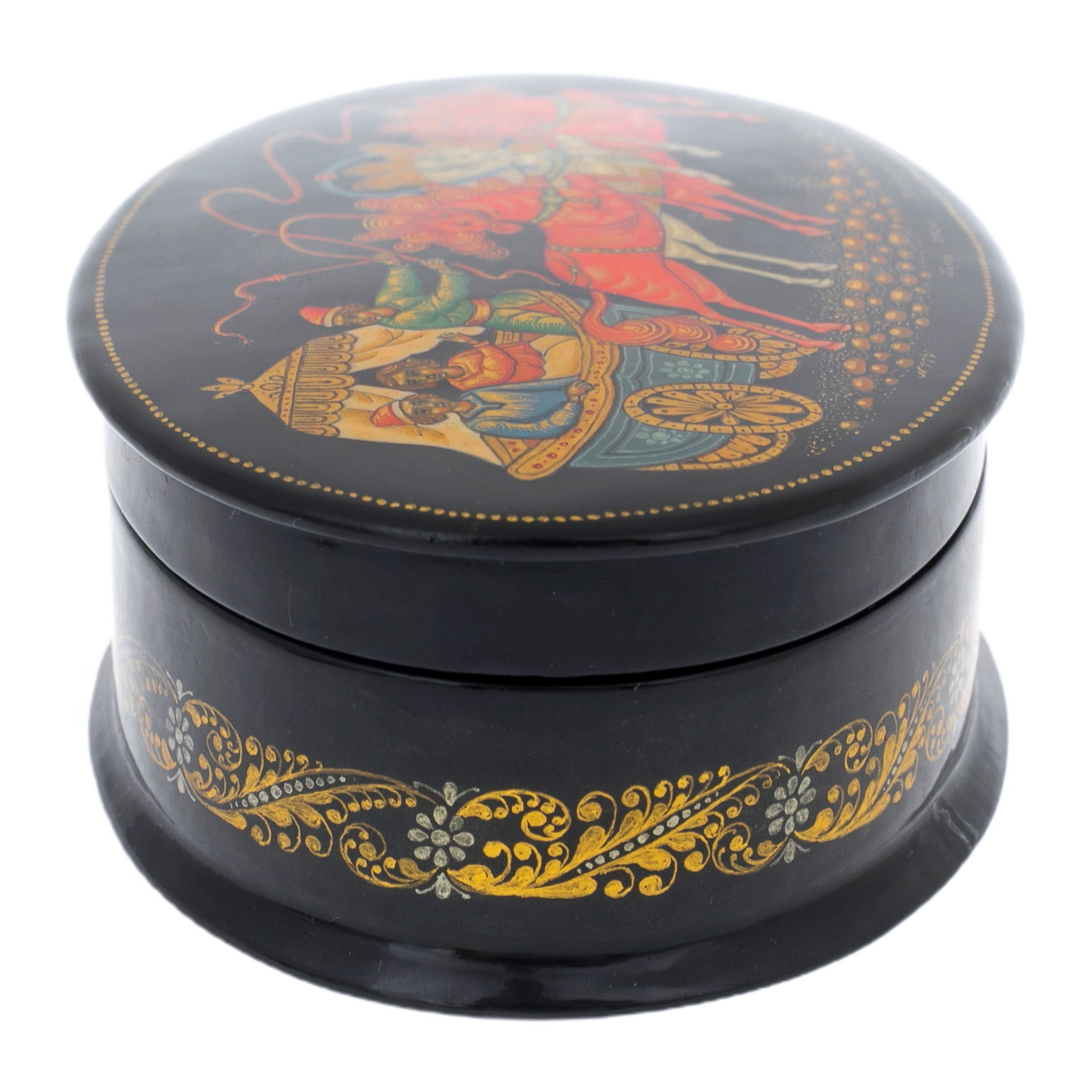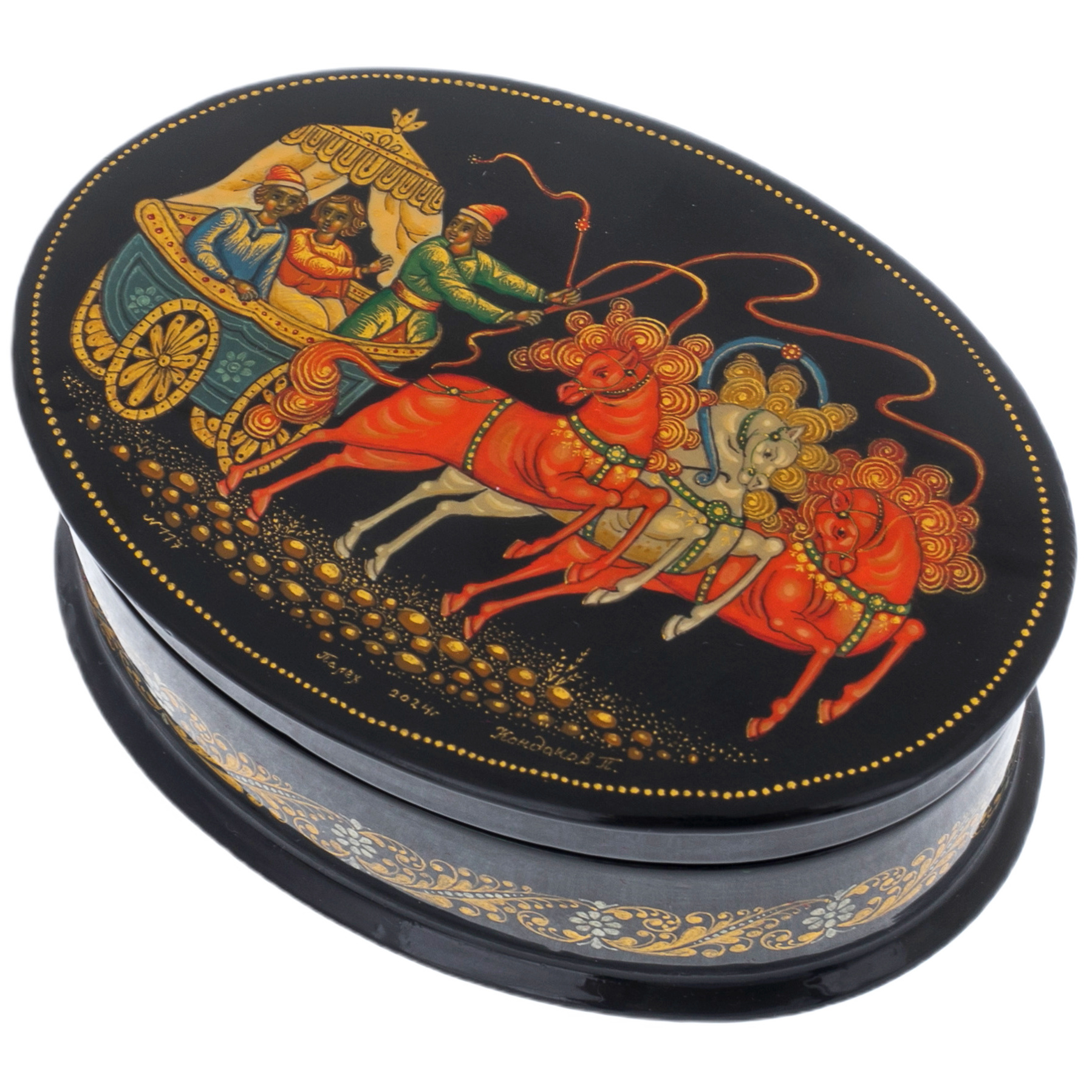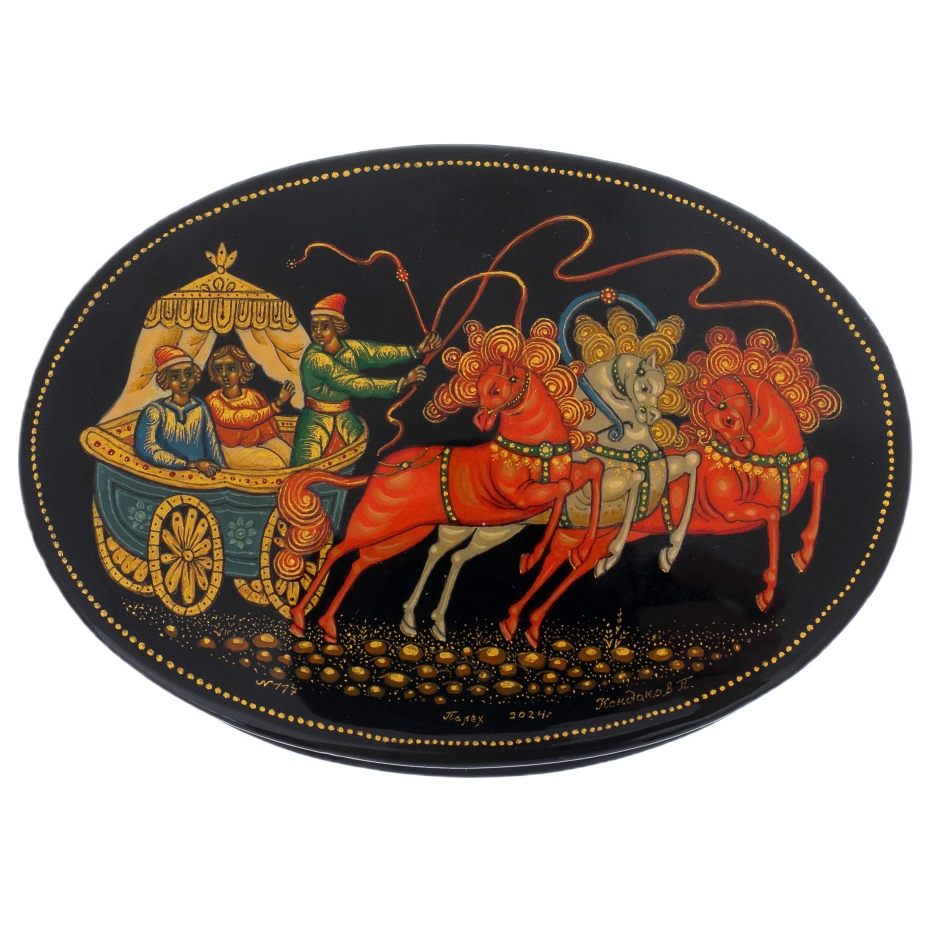 Шкатулка "Тройка" — это не просто предмет интерьера, а истинный символ искусства и мастерства, воплощённый в каждом штрихе. Изготовленная из прессованного высококачественного древесного картона (папье-маше), пропитанного горячим льняным маслом, она представляет собой воплощение многовековых традиций русского искусства. Грунт, состоящий из льняного масла, сажи и глины, создаёт идеальную основу для великолепной миниатюрной живописи, выполненной темперными яичными красками. Поверхность, покрытая черным масляным лаком, сверкает на свету, подчеркивая каждую деталь, а орнамент, выполненный сусальным золотом с добавлением вишневой смолы, придаёт изделию особый шарм и роскошь.