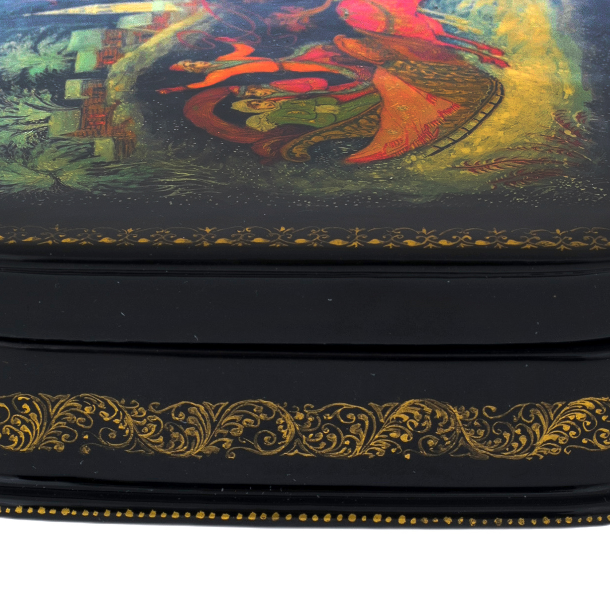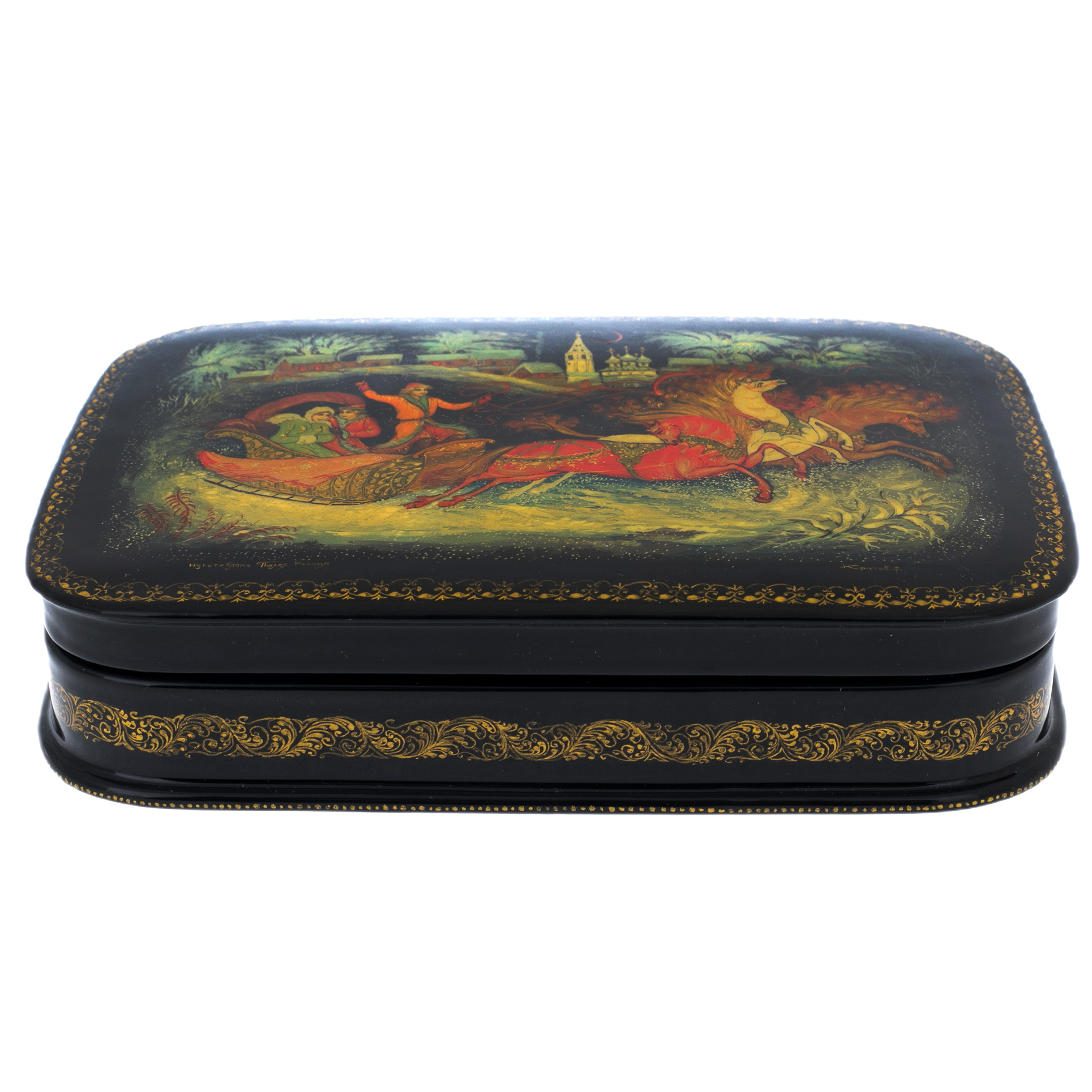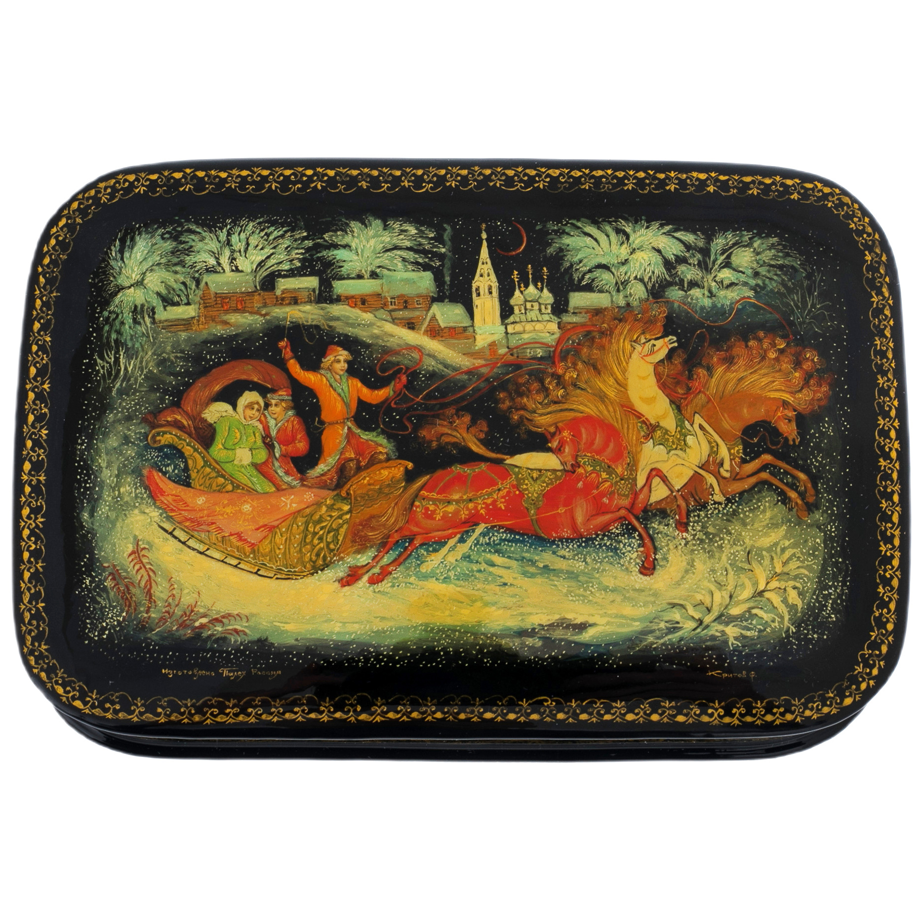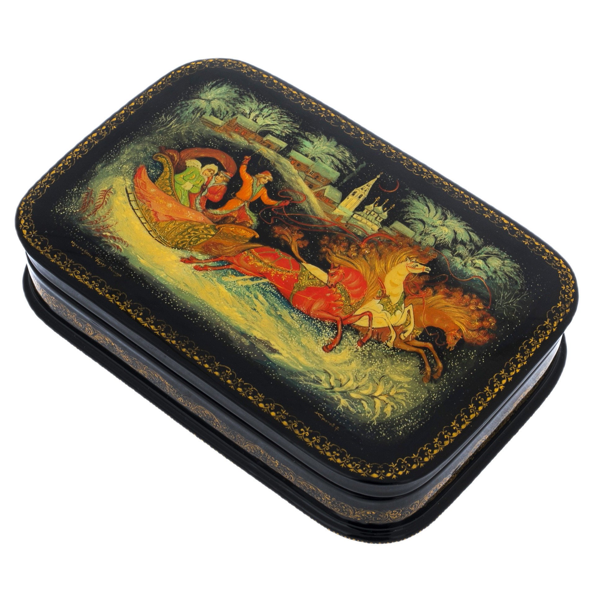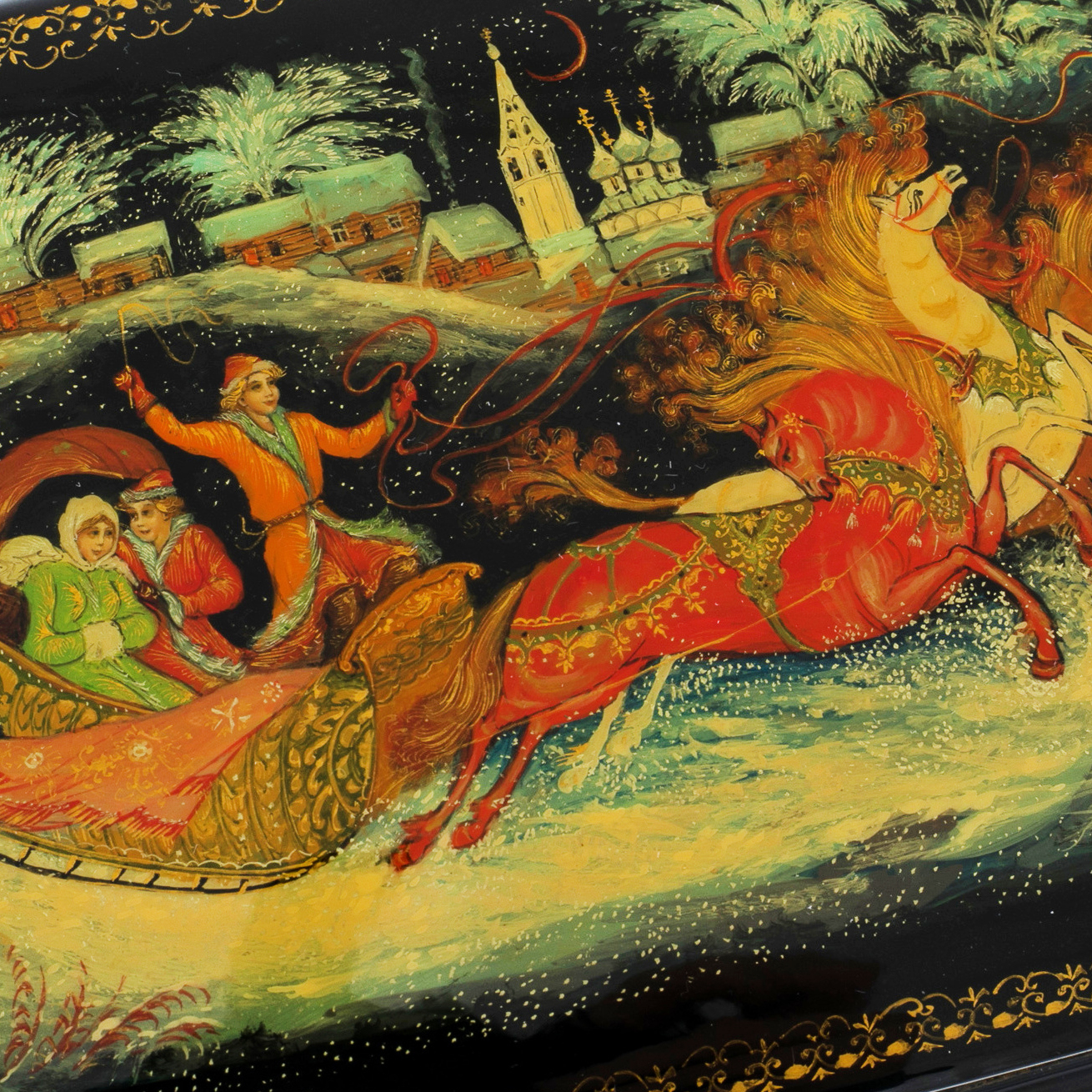 Шкатулка "Тройка" — это не просто предмет интерьера, а истинный символ искусства и мастерства, воплощённый в каждом штрихе. Изготовленная из прессованного высококачественного древесного картона (папье-маше), пропитанного горячим льняным маслом, она представляет собой воплощение многовековых традиций русского искусства. Грунт, состоящий из льняного масла, сажи и глины, создаёт идеальную основу для великолепной миниатюрной живописи, выполненной темперными яичными красками. Поверхность, покрытая черным масляным лаком, сверкает на свету, подчеркивая каждую деталь, а орнамент, выполненный сусальным золотом с добавлением вишневой смолы, придаёт изделию особый шарм и роскошь.