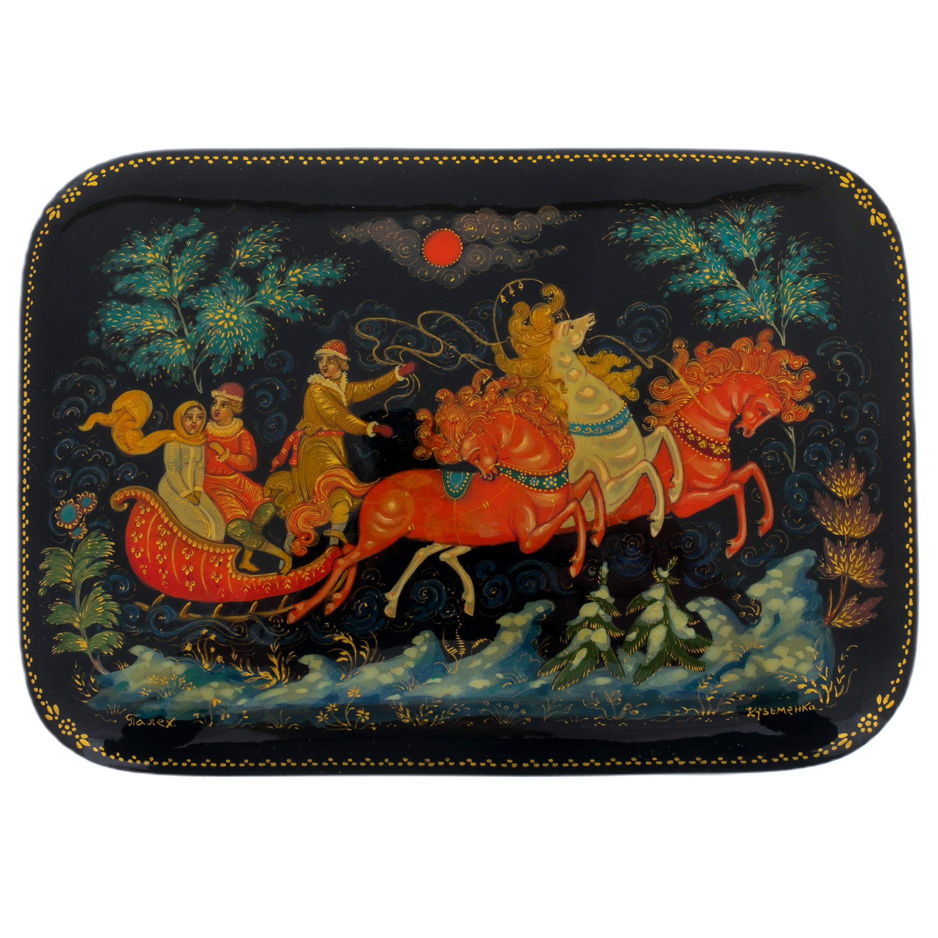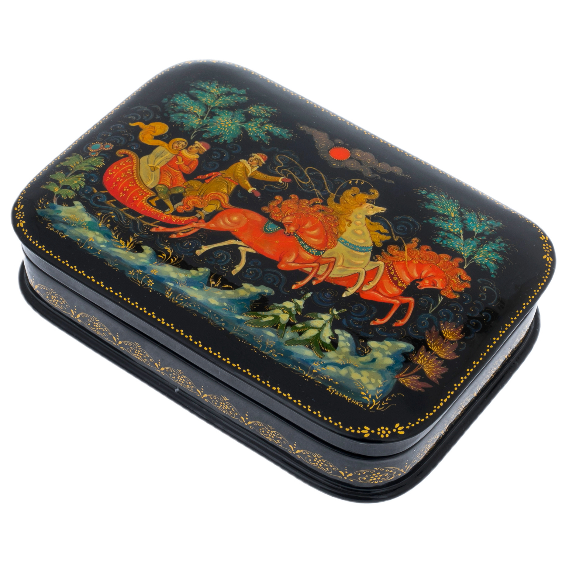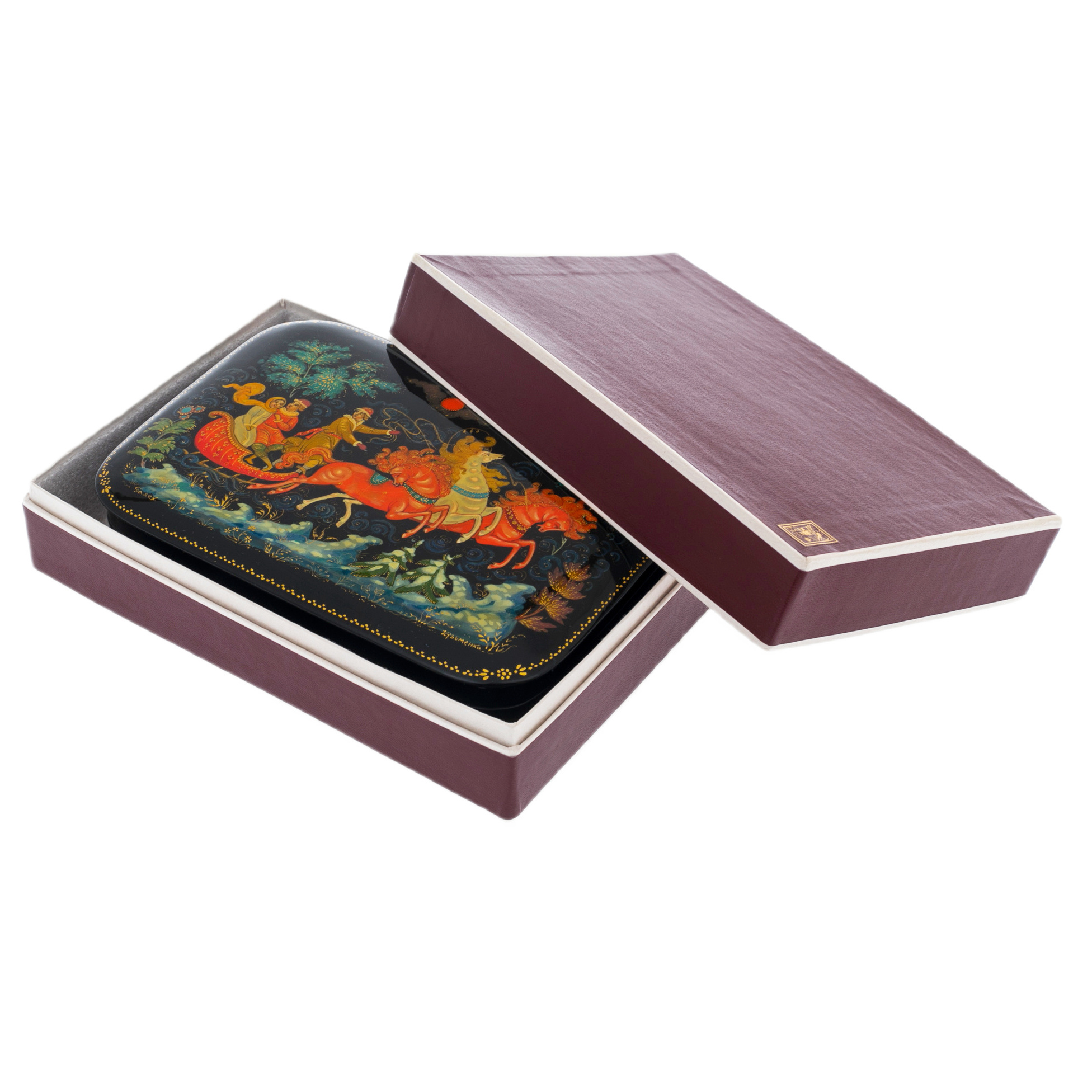Изысканная шкатулка "Тройка" от палехских мастеров — истинный артефакт, способный перенести в мир русских сказок и легенд. Словно волшебный портал, она открывает двери в эпоху, когда смелые богатырские подвиги и яркие эмоции переплетались в едином танце жизни. Изящные линии, плавно извивающиеся по поверхности, создают ощущение движения, будто тройка мчится по снежным просторам, оставляя за собой искристые следы.