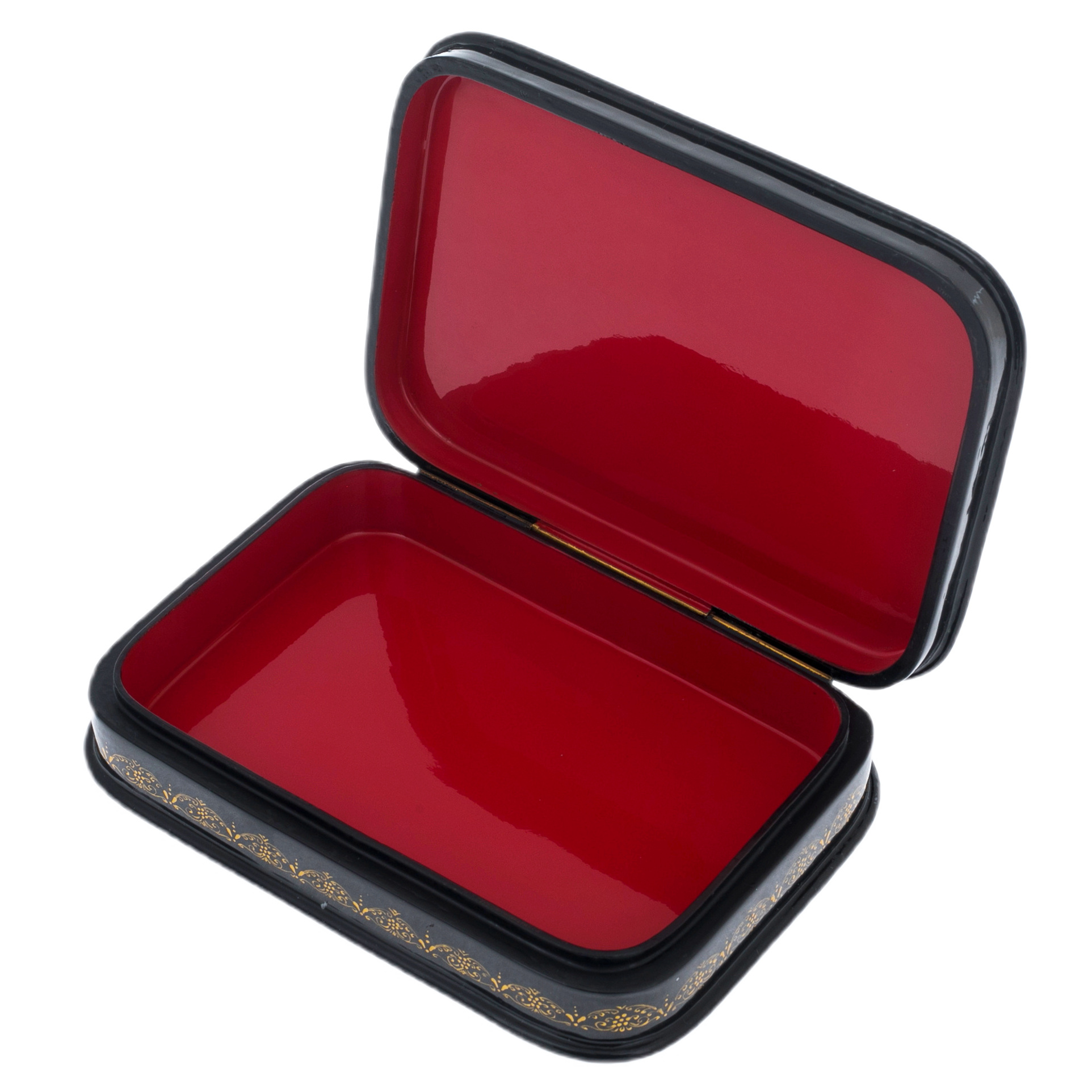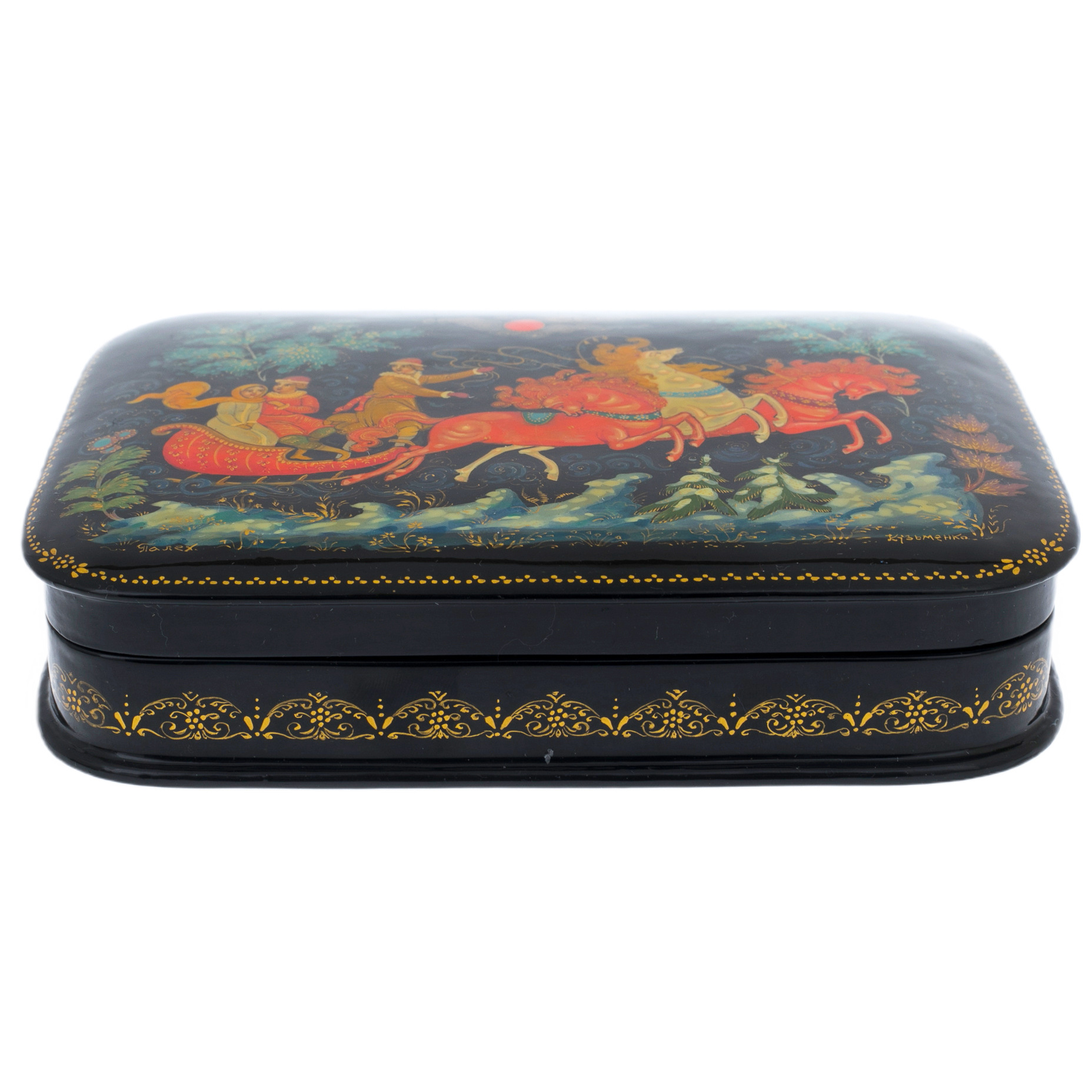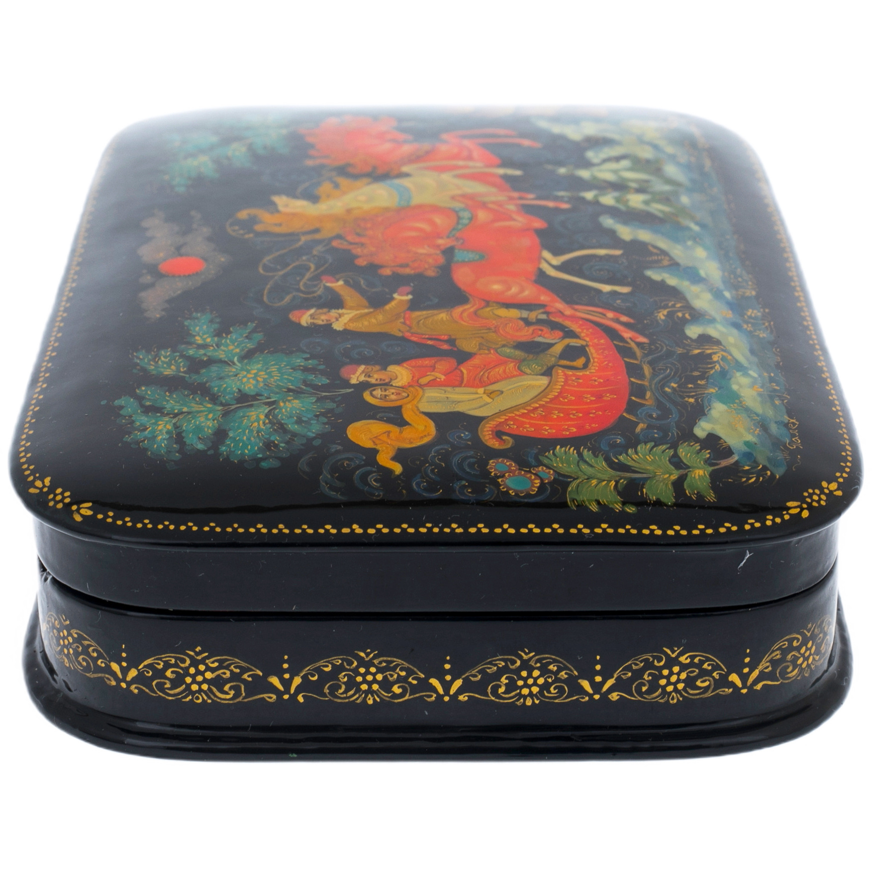 Мастера, вложившие свою душу в создание этой шкатулки, передали дыхание истории, запечатлев в ней дух русской культуры и традиций. Черный лак, словно ночное небо, обрамляет яркие сцены, создавая контраст, который захватывает дух и притягивает взгляд.