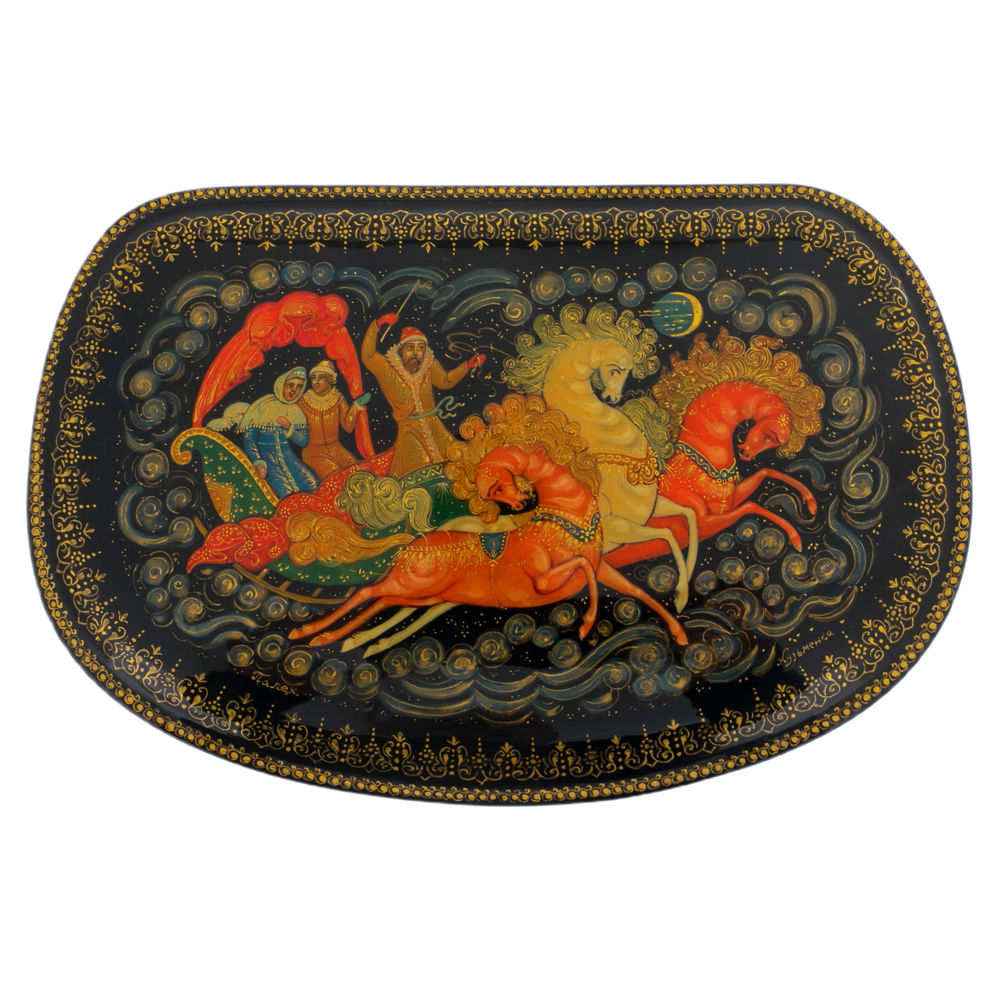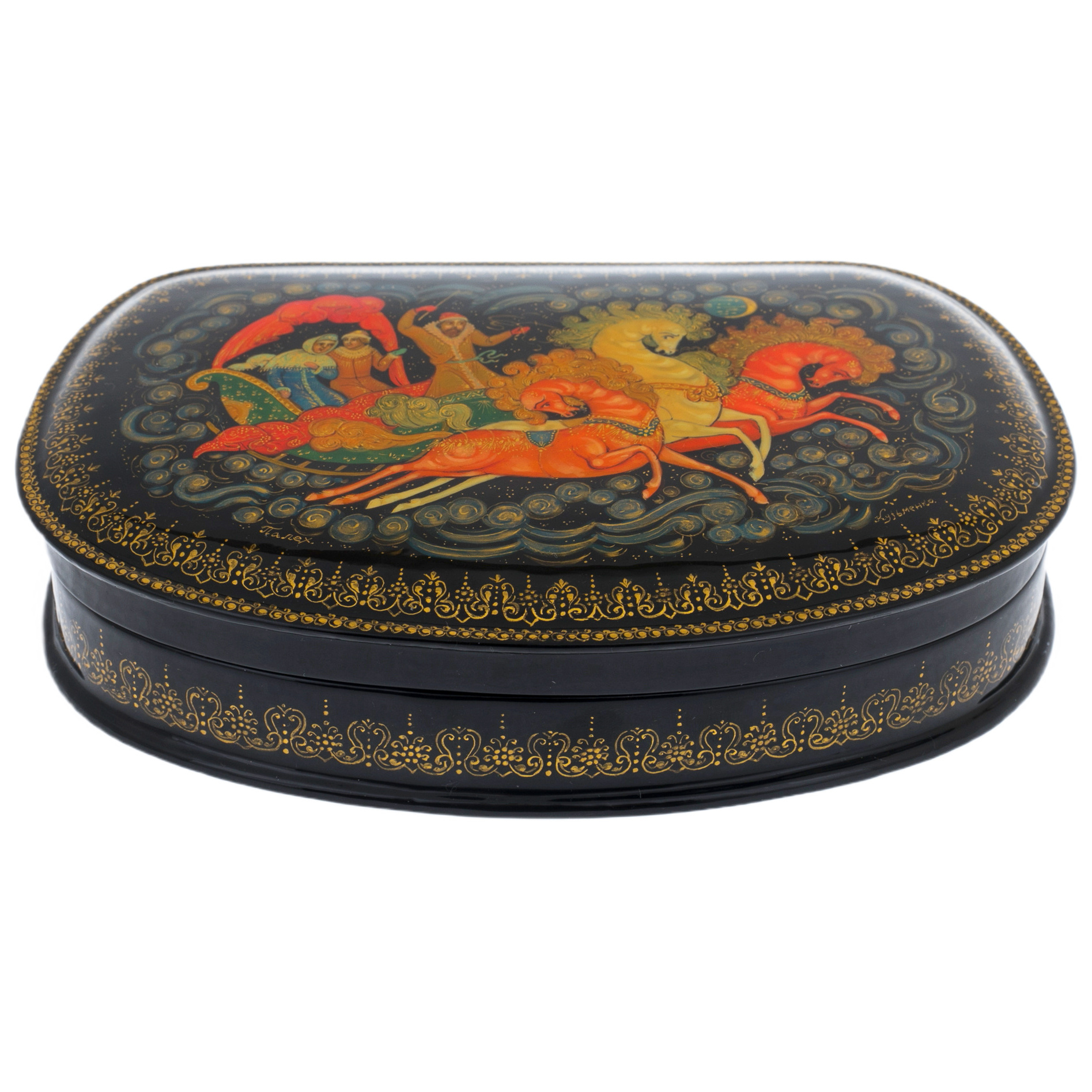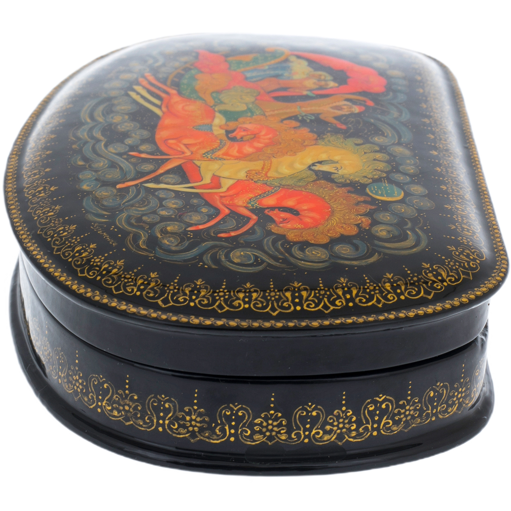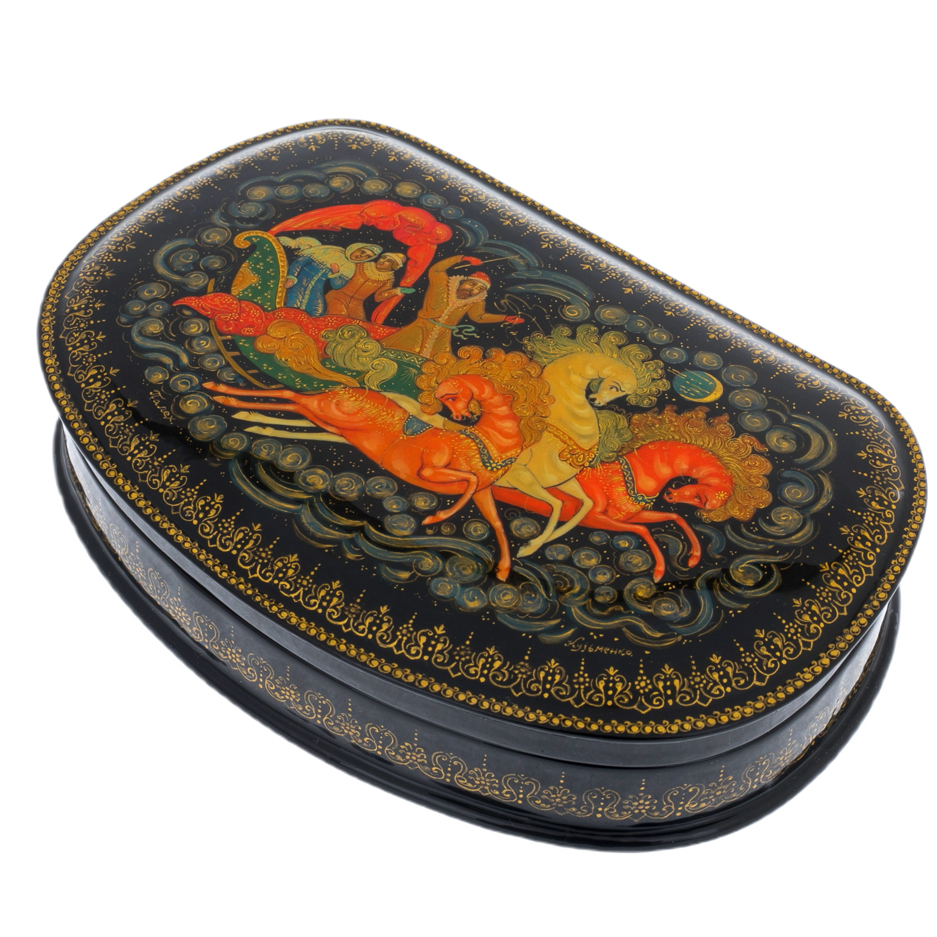 Шкатулка "Тройка" — это не просто предмет интерьера, а истинный символ искусства и мастерства, воплощённый в каждом штрихе. Изготовленная из прессованного высококачественного древесного картона (папье-маше), пропитанного горячим льняным маслом, она представляет собой воплощение многовековых традиций русского искусства. Грунт, состоящий из льняного масла, сажи и глины, создаёт идеальную основу для великолепной миниатюрной живописи, выполненной темперными яичными красками. Поверхность, покрытая черным масляным лаком, сверкает на свету, подчеркивая каждую деталь, а орнамент, выполненный сусальным золотом с добавлением вишневой смолы, придаёт изделию особый шарм и роскошь.