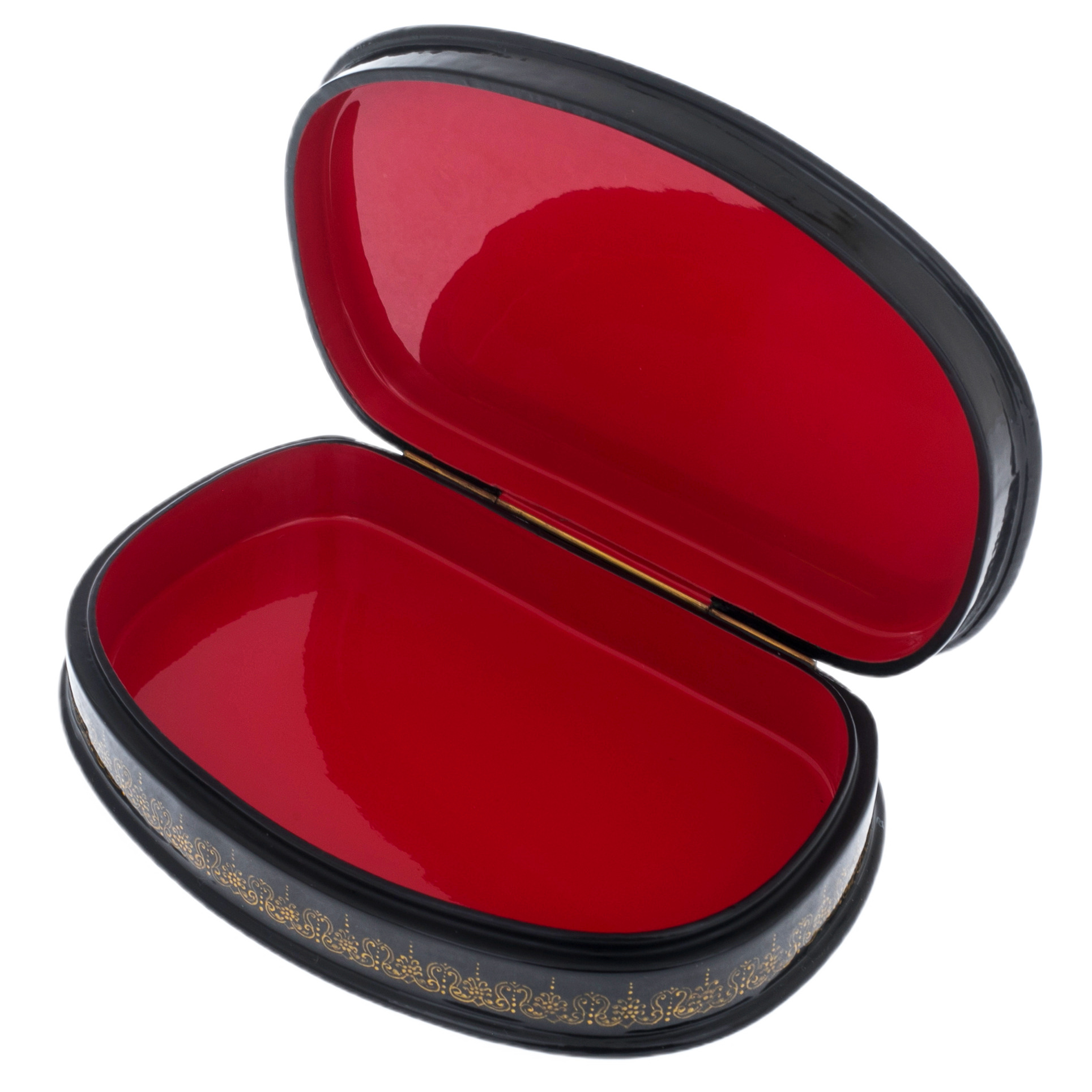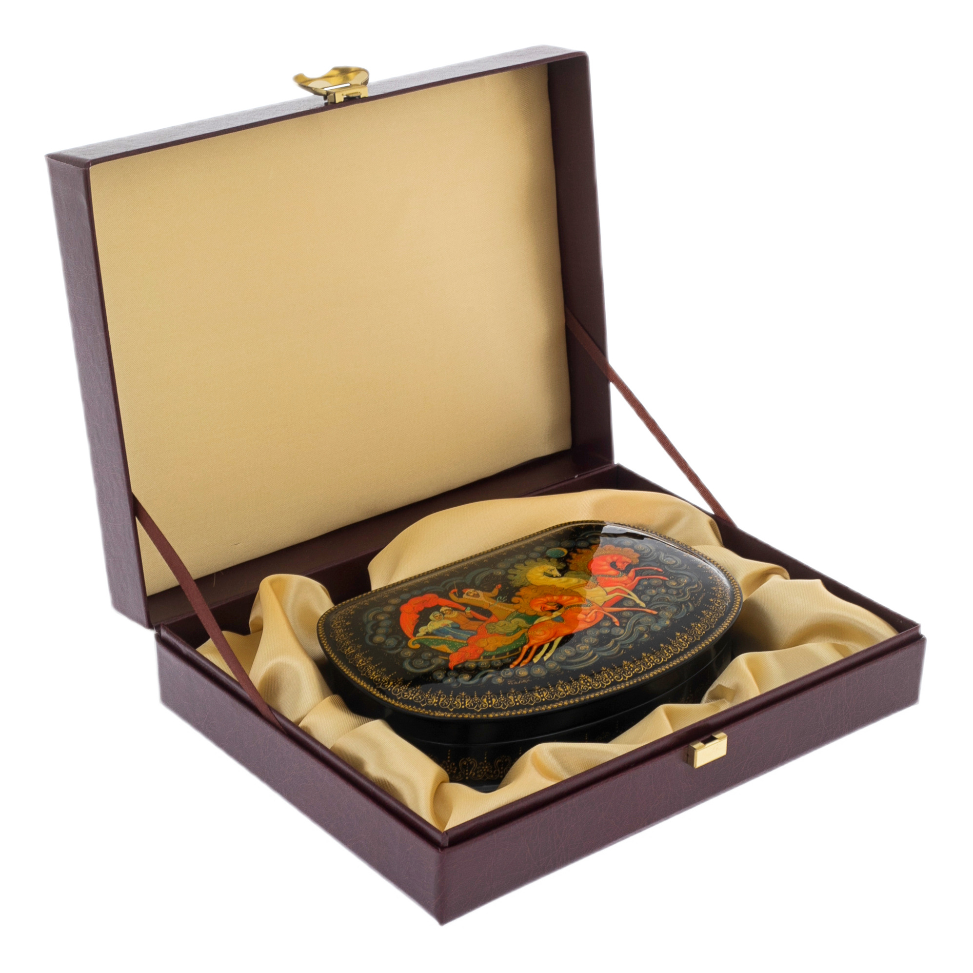 Каждая шкатулка покрыта восемью слоями масляного лака, что обеспечивает ей долговечность и блеск, отражающий свет и создающий игру оттенков. Упакованная в элегантный футляр, она становится идеальным подарком для ценителей прекрасного, желающих окружить себя искусством и вдохновением.