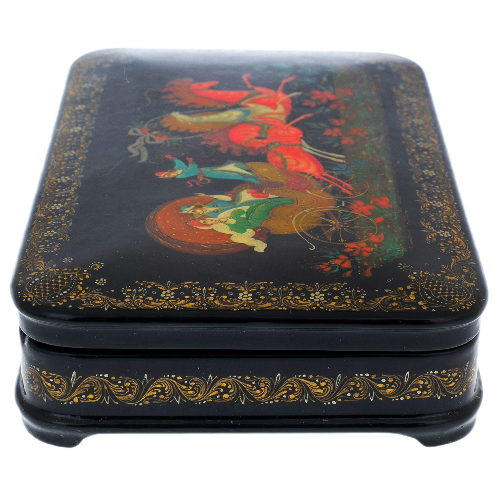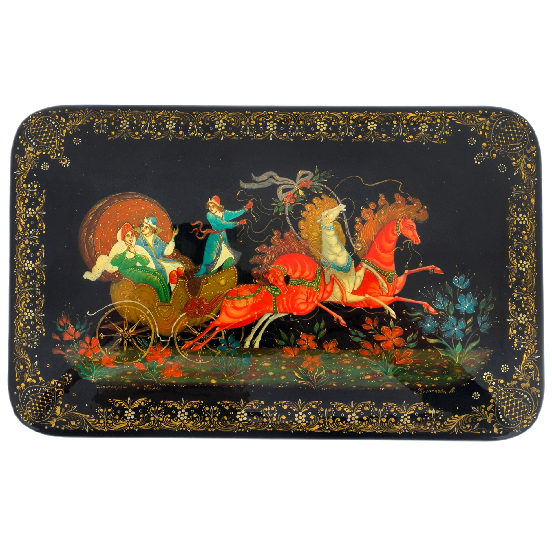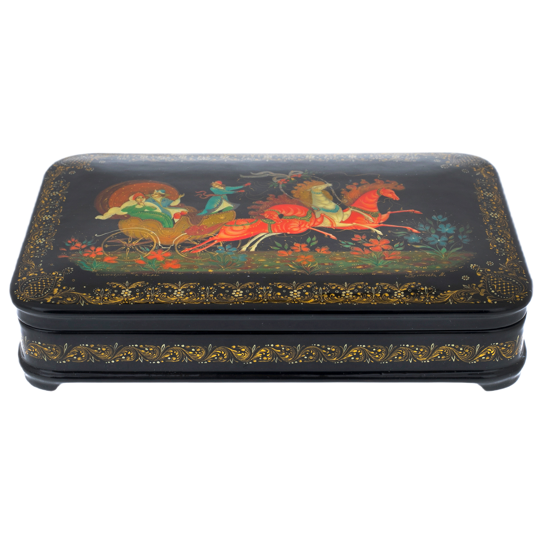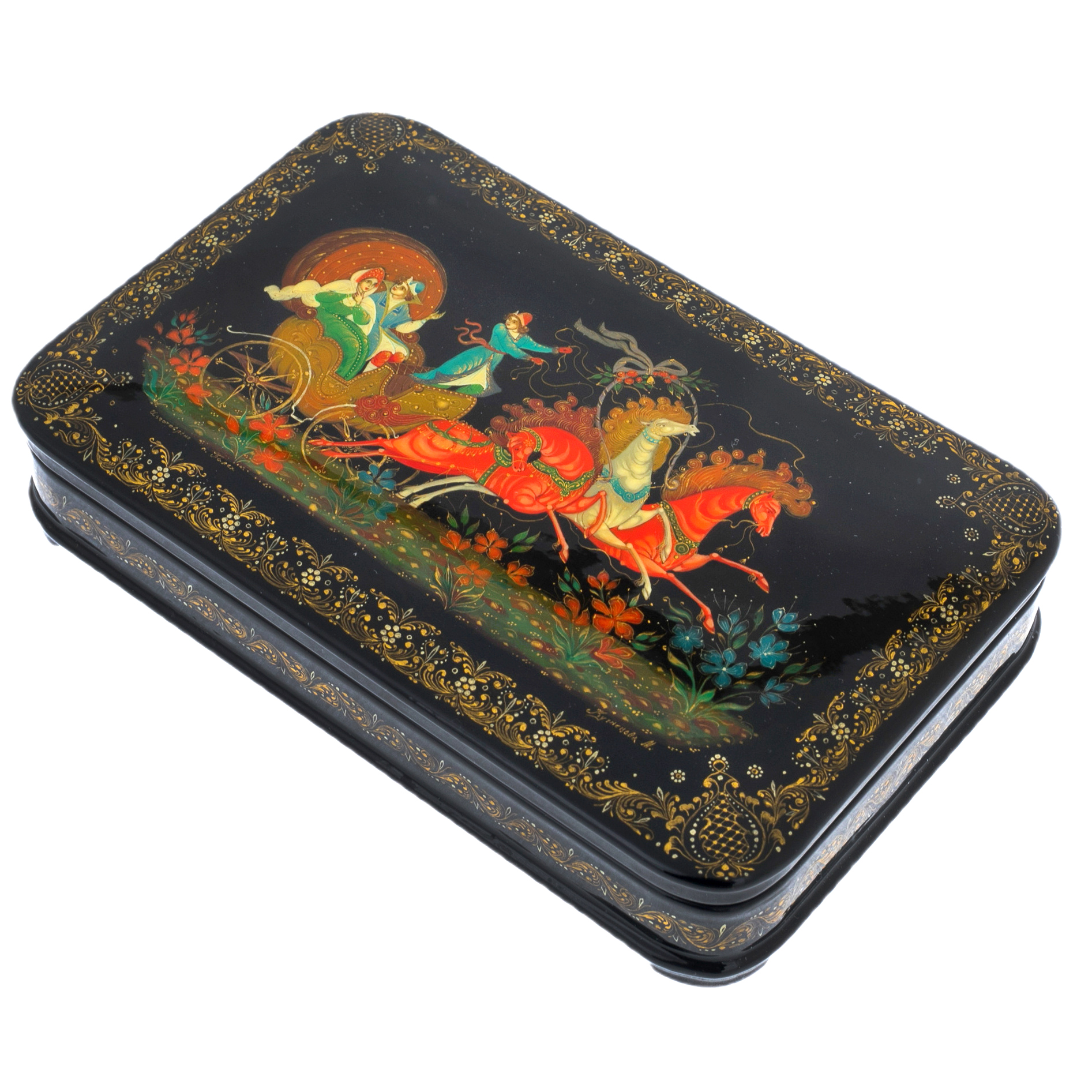 Шкатулка "Тройка" — это не просто предмет интерьера, а истинный символ искусства и мастерства, воплощённый в каждом штрихе. Изготовленная из прессованного высококачественного древесного картона (папье-маше), пропитанного горячим льняным маслом, она представляет собой воплощение многовековых традиций русского искусства. Грунт, состоящий из льняного масла, сажи и глины, создаёт идеальную основу для великолепной миниатюрной живописи, выполненной темперными яичными красками. Поверхность, покрытая черным масляным лаком, сверкает на свету, подчеркивая каждую деталь, а орнамент, выполненный сусальным золотом с добавлением вишневой смолы, придаёт изделию особый шарм и роскошь.