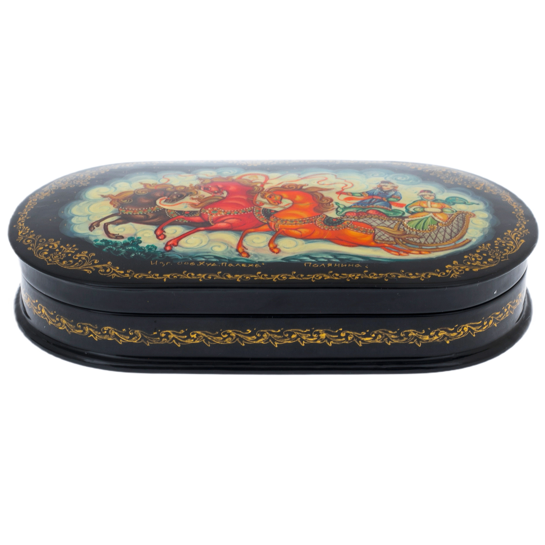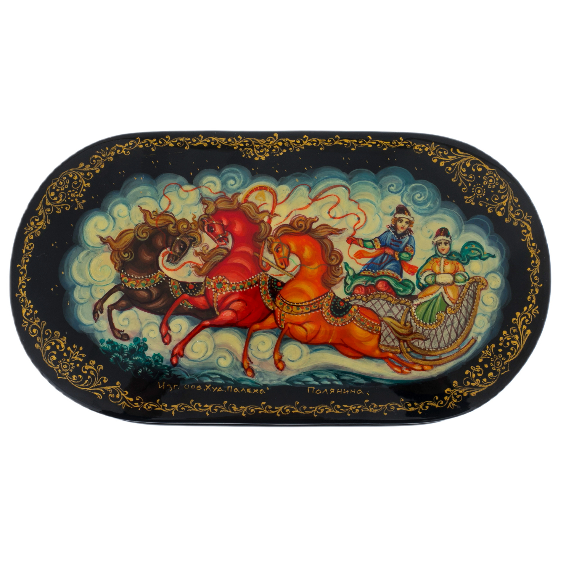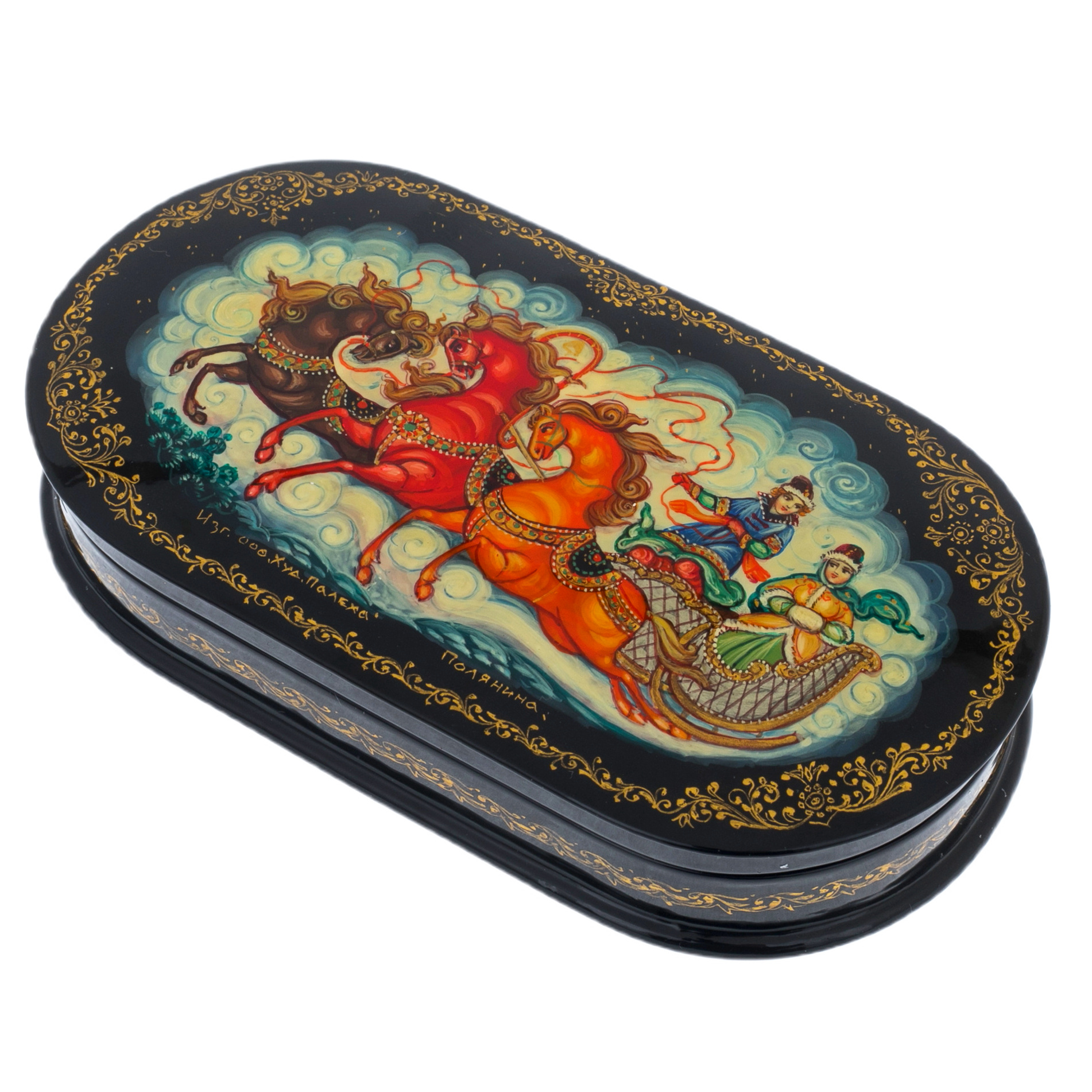 Изысканная шкатулка "Тройка" от палехских мастеров — истинный артефакт, способный перенести в мир русских сказок и легенд. Словно волшебный портал, она открывает двери в эпоху, когда смелые богатырские подвиги и яркие эмоции переплетались в едином танце жизни. Изящные линии, плавно извивающиеся по поверхности, создают ощущение движения, будто тройка мчится по снежным просторам, оставляя за собой искристые следы.
