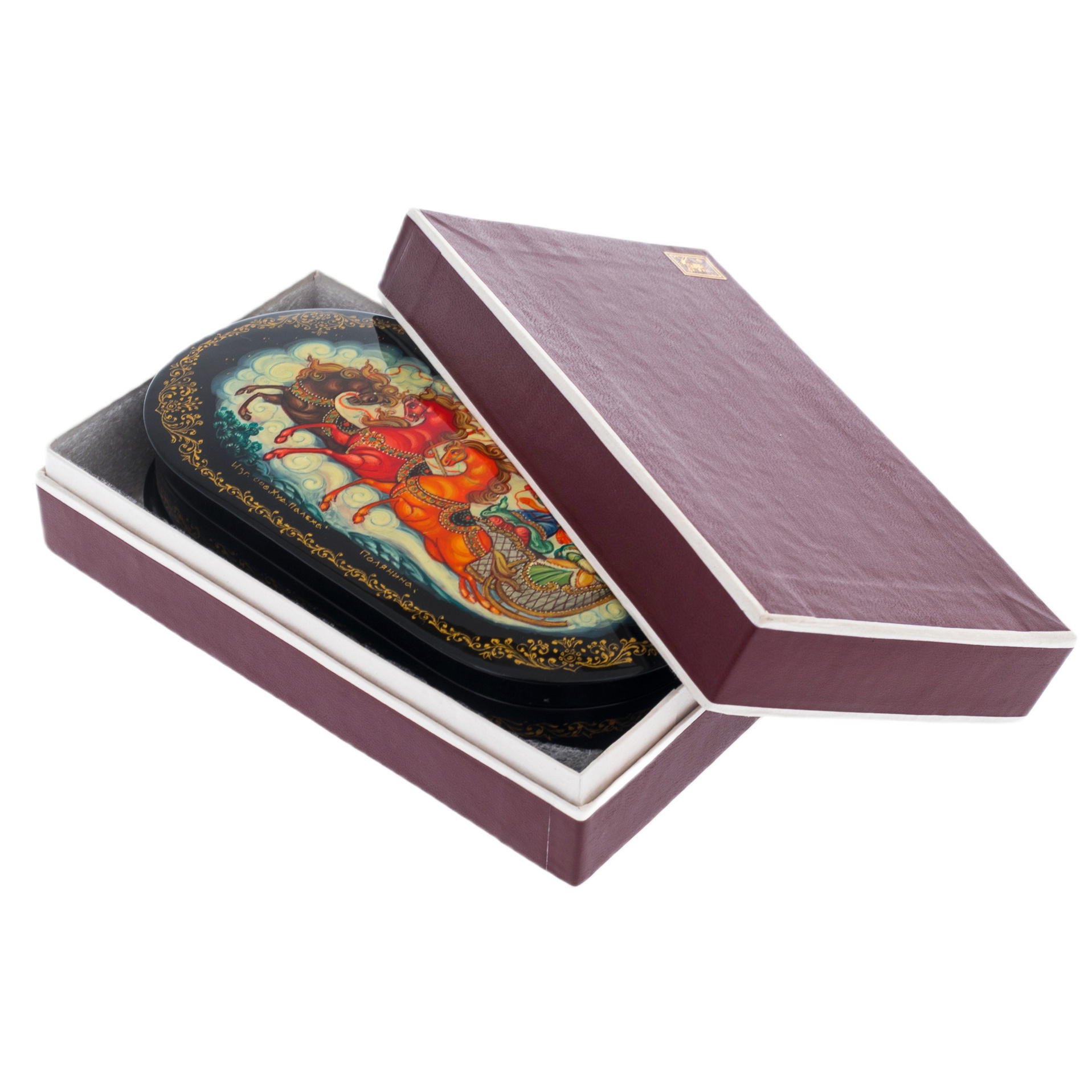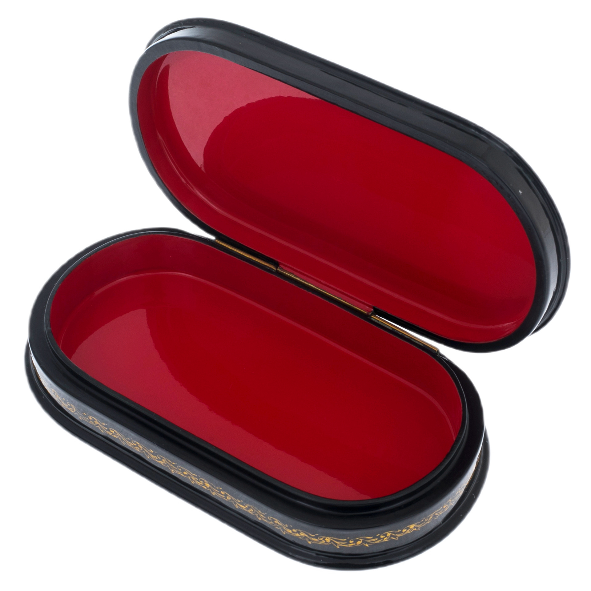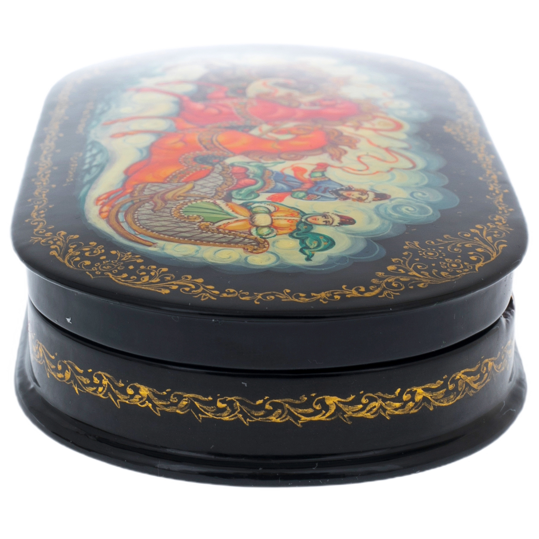Мастера, вложившие свою душу в создание этой шкатулки, передали дыхание истории, запечатлев в ней дух русской культуры и традиций. Черный лак, словно ночное небо, обрамляет яркие сцены, создавая контраст, который захватывает дух и притягивает взгляд.