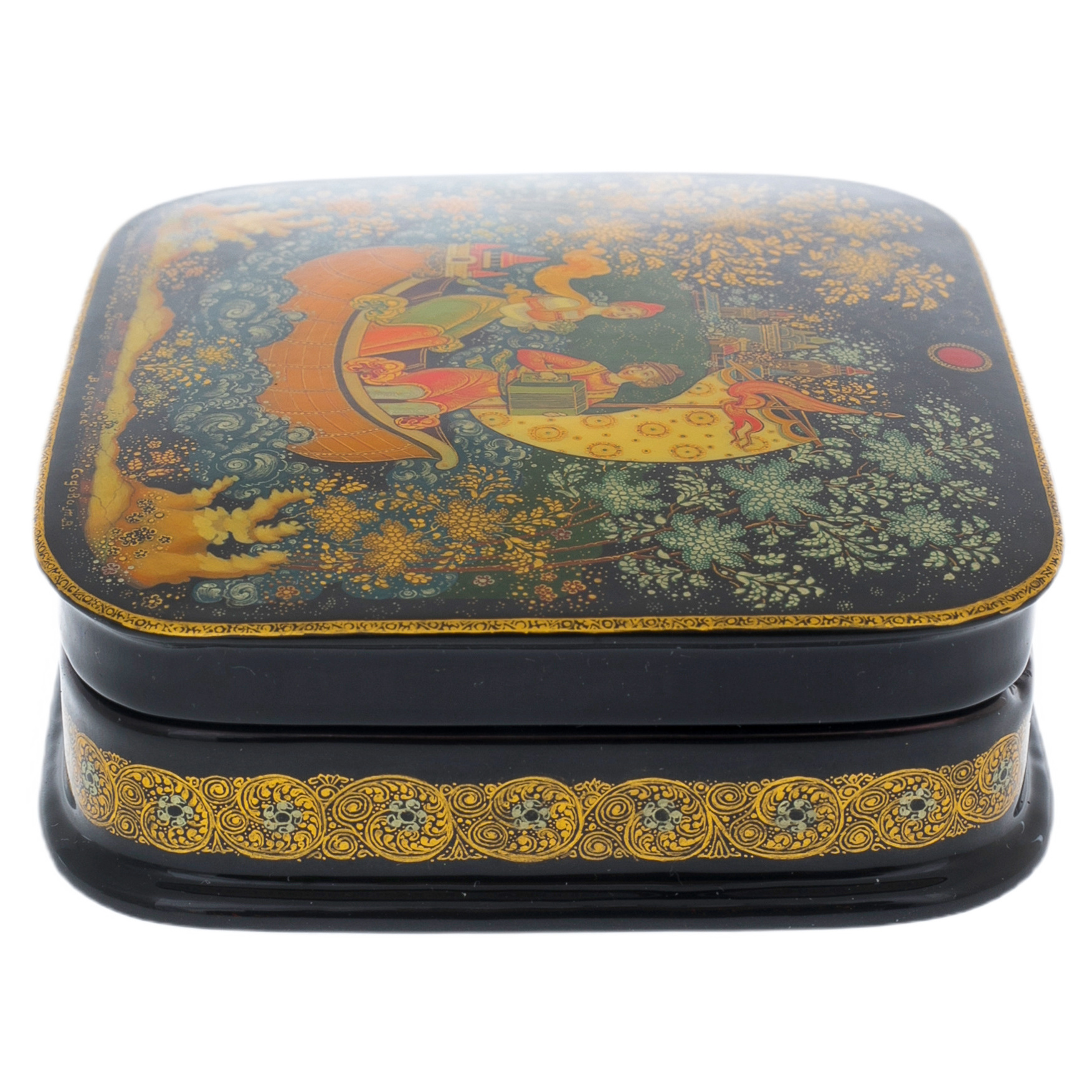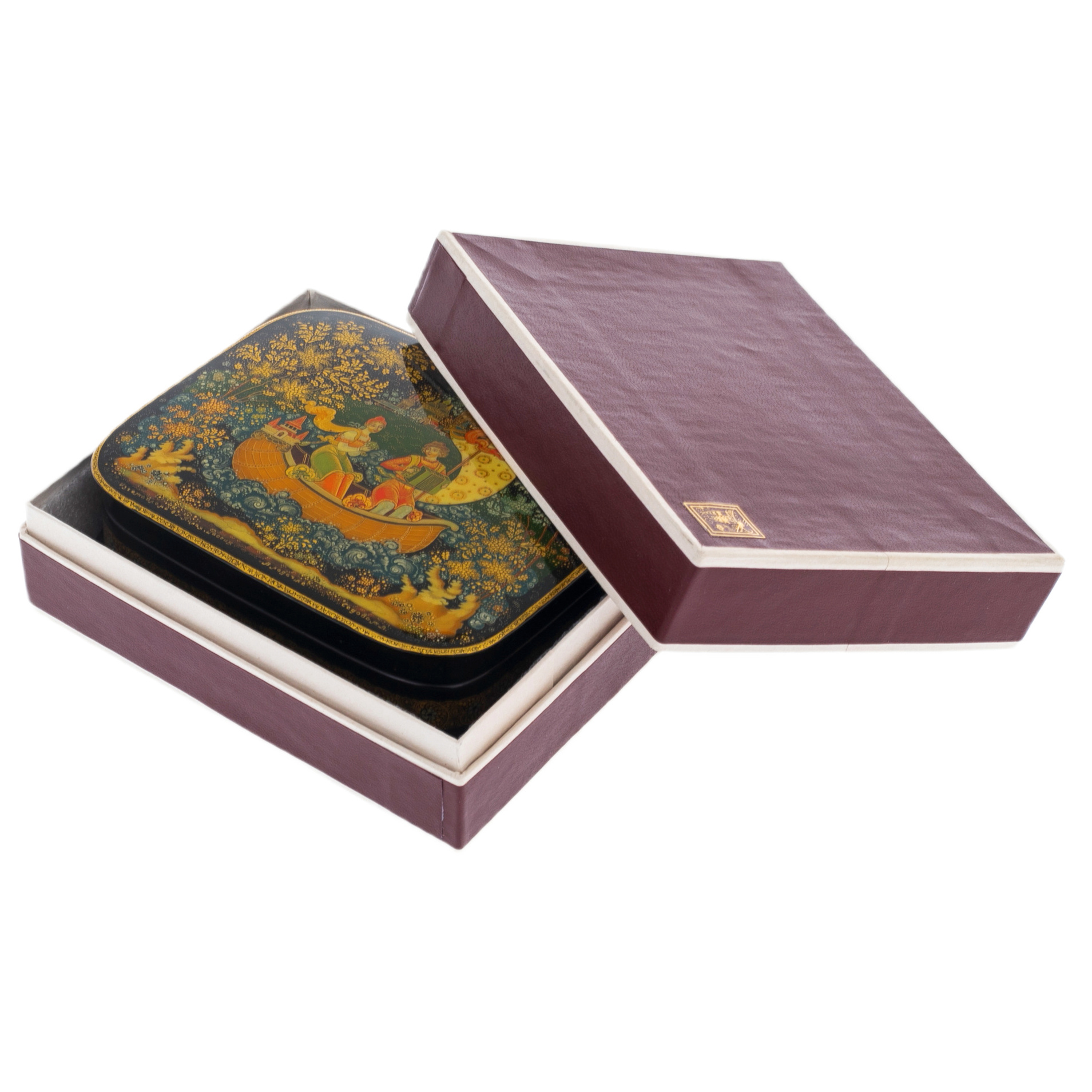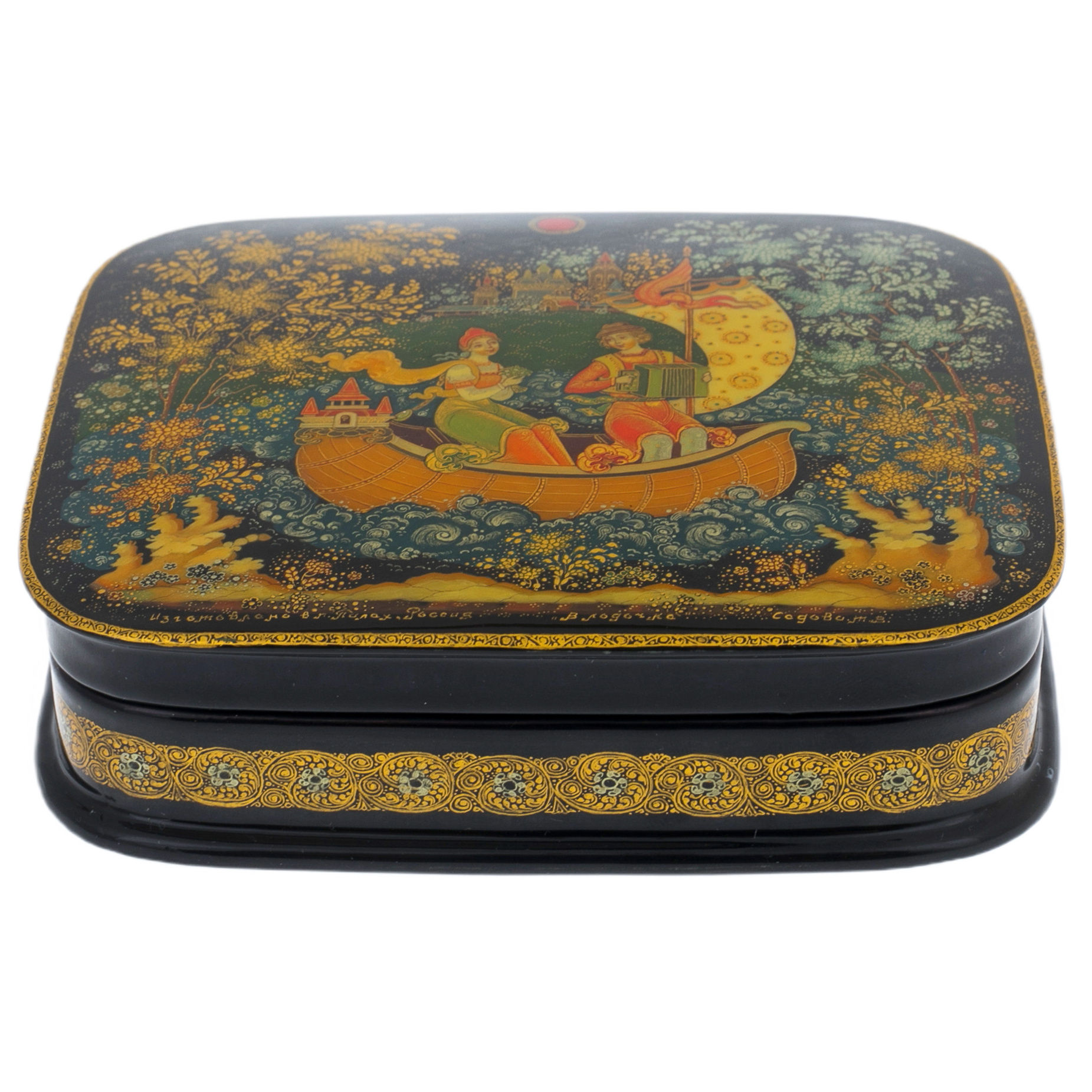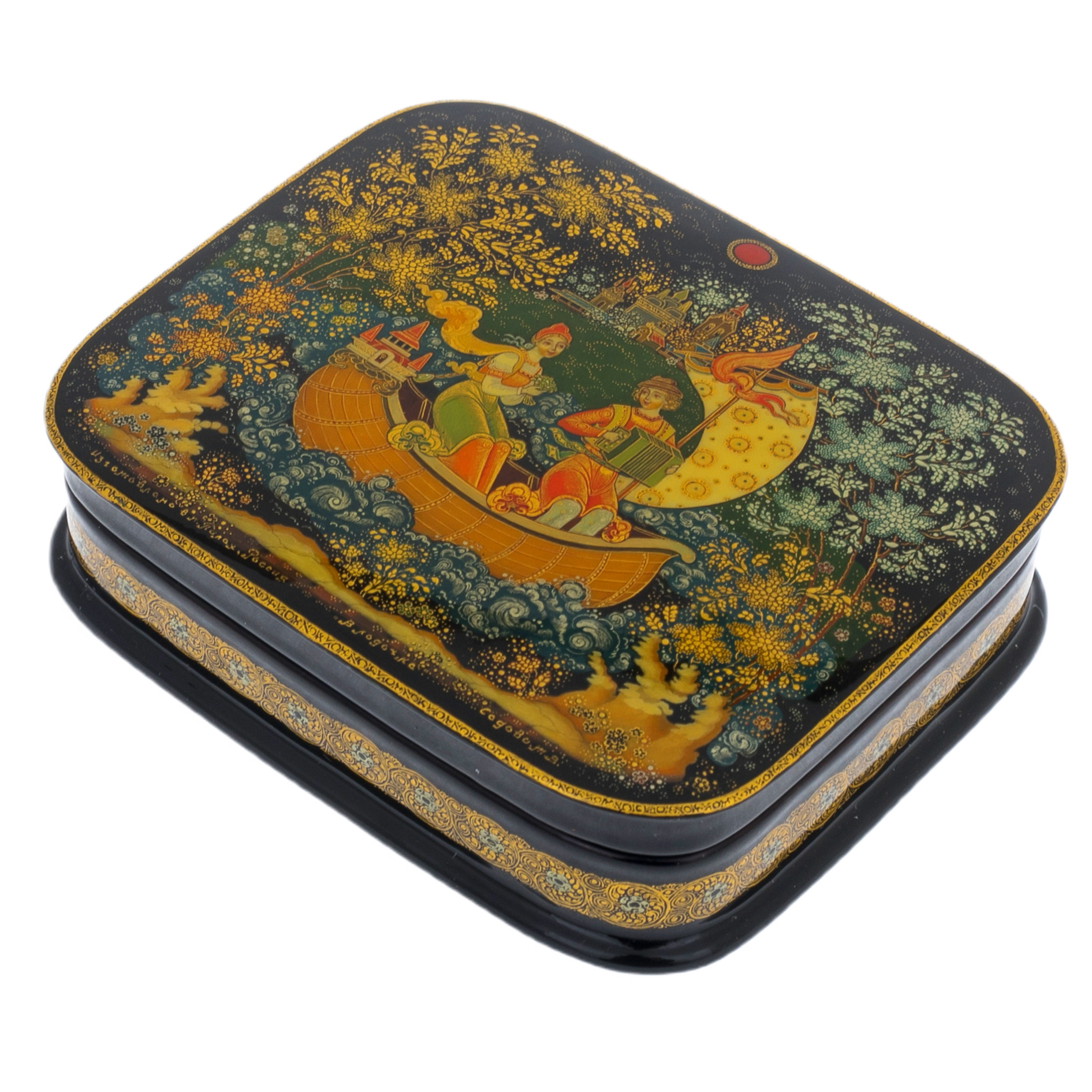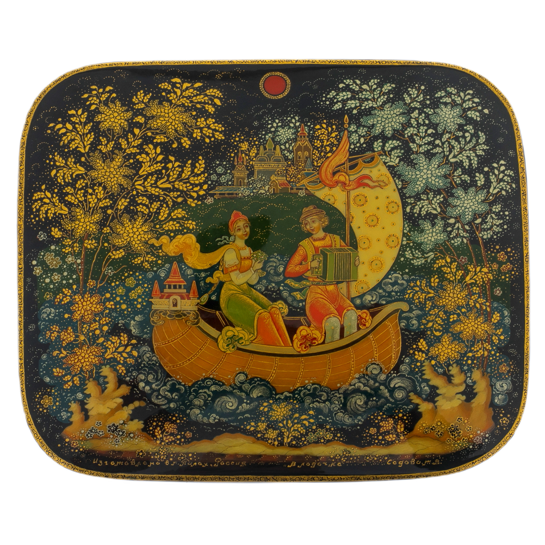 На крышке шкатулки представлена сцена, напоминающая иллюстрацию к сказочному эпосу. Герои в изысканных одеждах плывут по спокойным волнам на чудесной лодке, где каждая деталь отражает их статус и благородство. Плавные линии композиции передают движение воды, окружённой золотым сиянием и переливами лесной зелени. Луна, покоящаяся на корме в виде волшебного украшения, излучает мягкий свет, подчёркивая сказочную атмосферу. Фон, где зелёные кроны деревьев переплетаются с мерцающими звёздами, усиливает ощущение волшебного мира, изолированного от суеты.