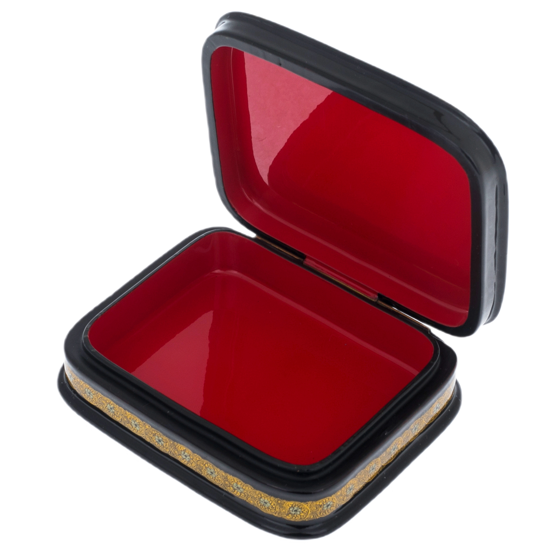 Внутреннее пространство шкатулки, выкрашенное в насыщенный алый цвет, воплощает страсть и тепло, спрятанные за внешним спокойствием. Гладкая поверхность лака манит прикоснуться к себе, создавая идеальное место для хранения самых ценных предметов, будь то ювелирные украшения, семейные реликвии или личные воспоминания.