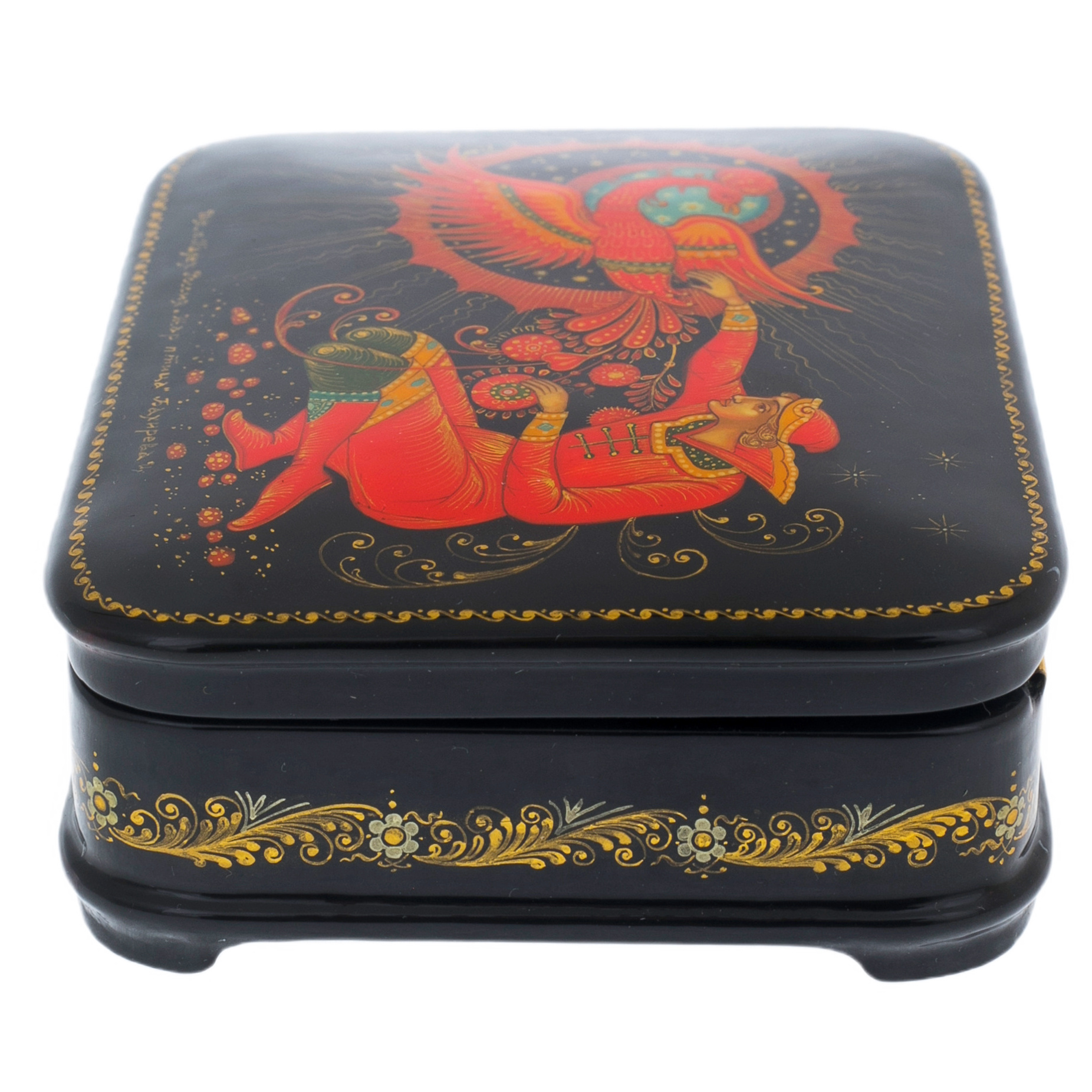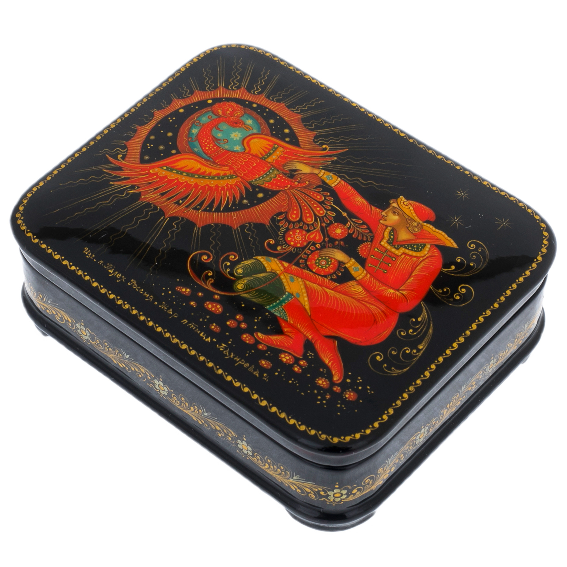 Золотое обрамление, украшающее края шкатулки, выполнено с тончайшей филигранной точностью. Оно подобно блеску звёздного неба, которое окружает жар-птицу, подчёркивая её мистический характер и величие.