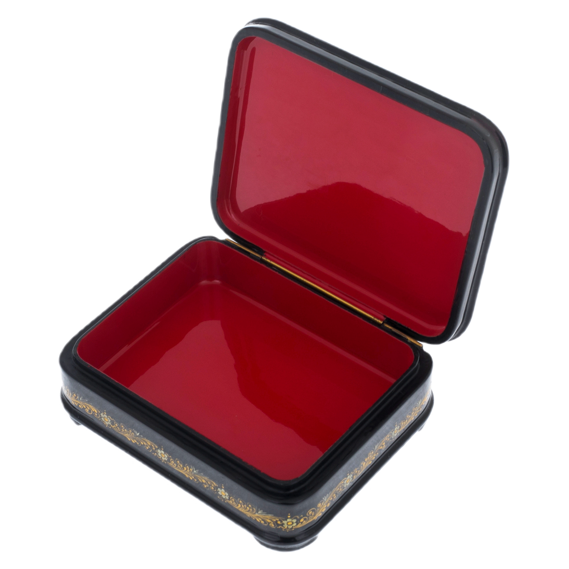 Внутреннее пространство, покрытое насыщенным алым лаком, говорит о страсти, богатстве и величии. Этот яркий цвет становится хранилищем для драгоценностей, символизируя тепло и душевное богатство, спрятанные внутри. Гладкость поверхности дарит тактильное наслаждение, делая каждое прикосновение к шкатулке моментом соприкосновения с искусством.