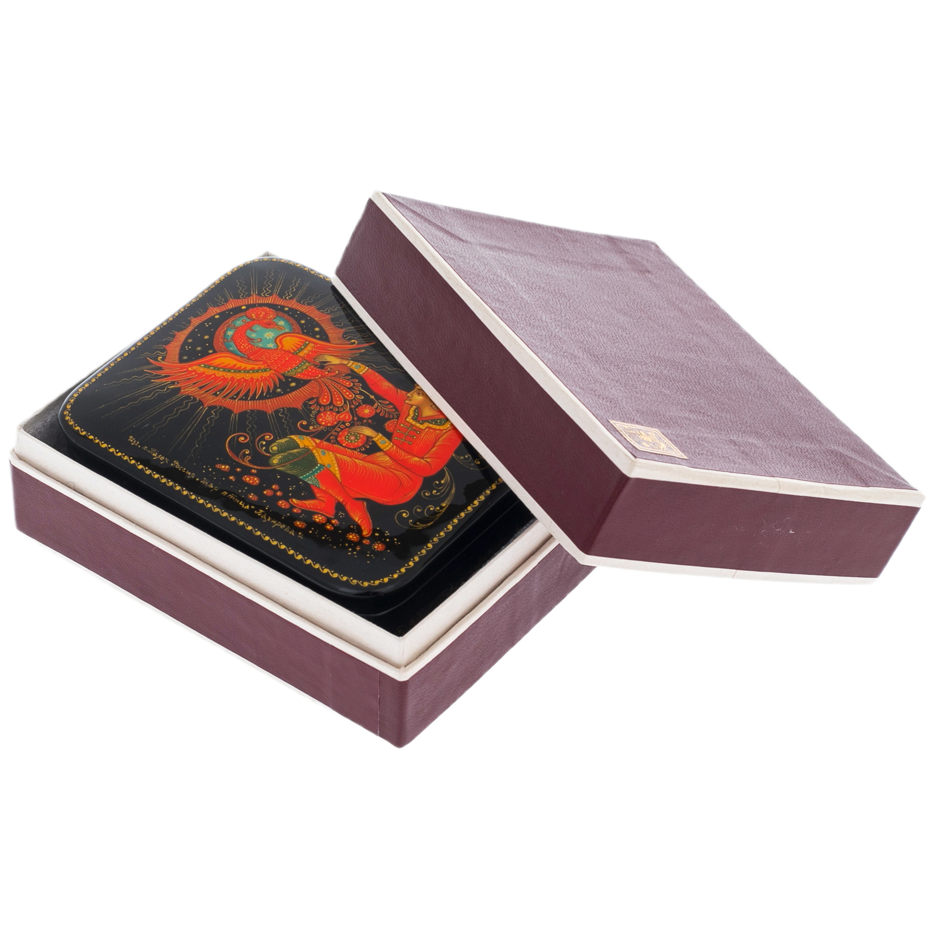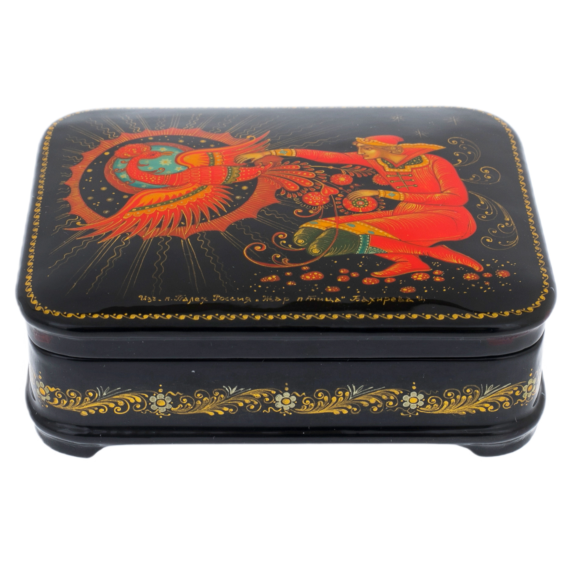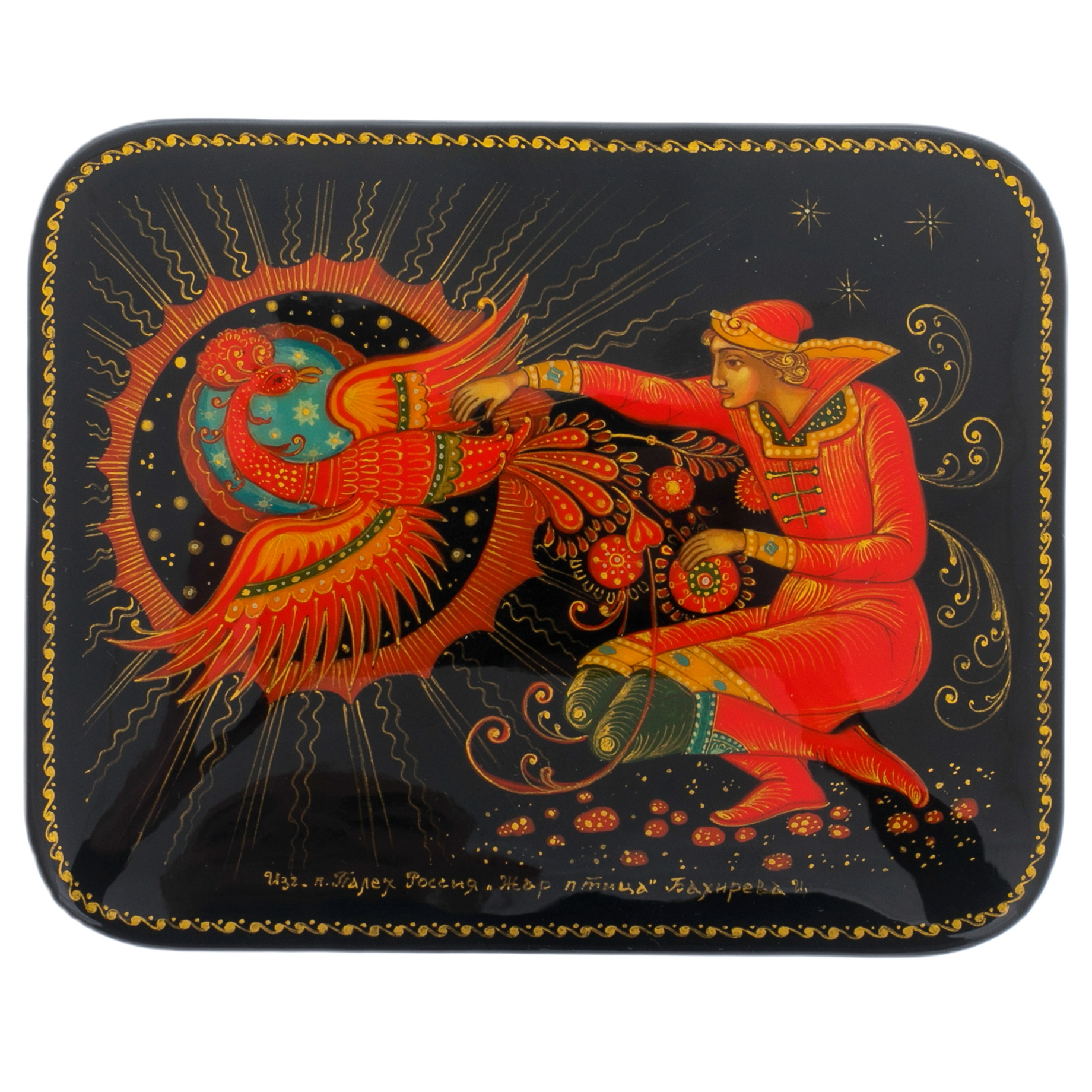 Шкатулка "Жар-птица" из Палеха — это настоящее воплощение волшебства и символа стремления к недостижимому, запечатлённое в изысканной лаковой миниатюре. Её форма, строгая и утончённая, подчёркивает изящество рисунка и гармонию общей композиции, создавая эффект безупречного равновесия.