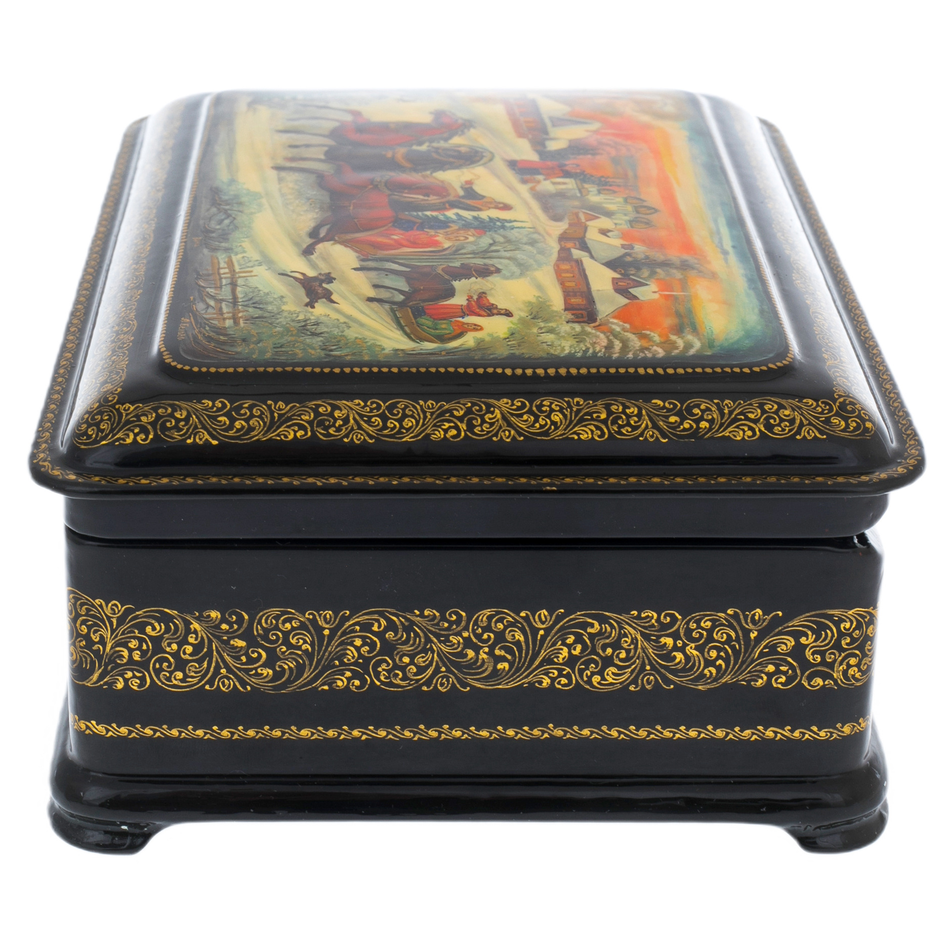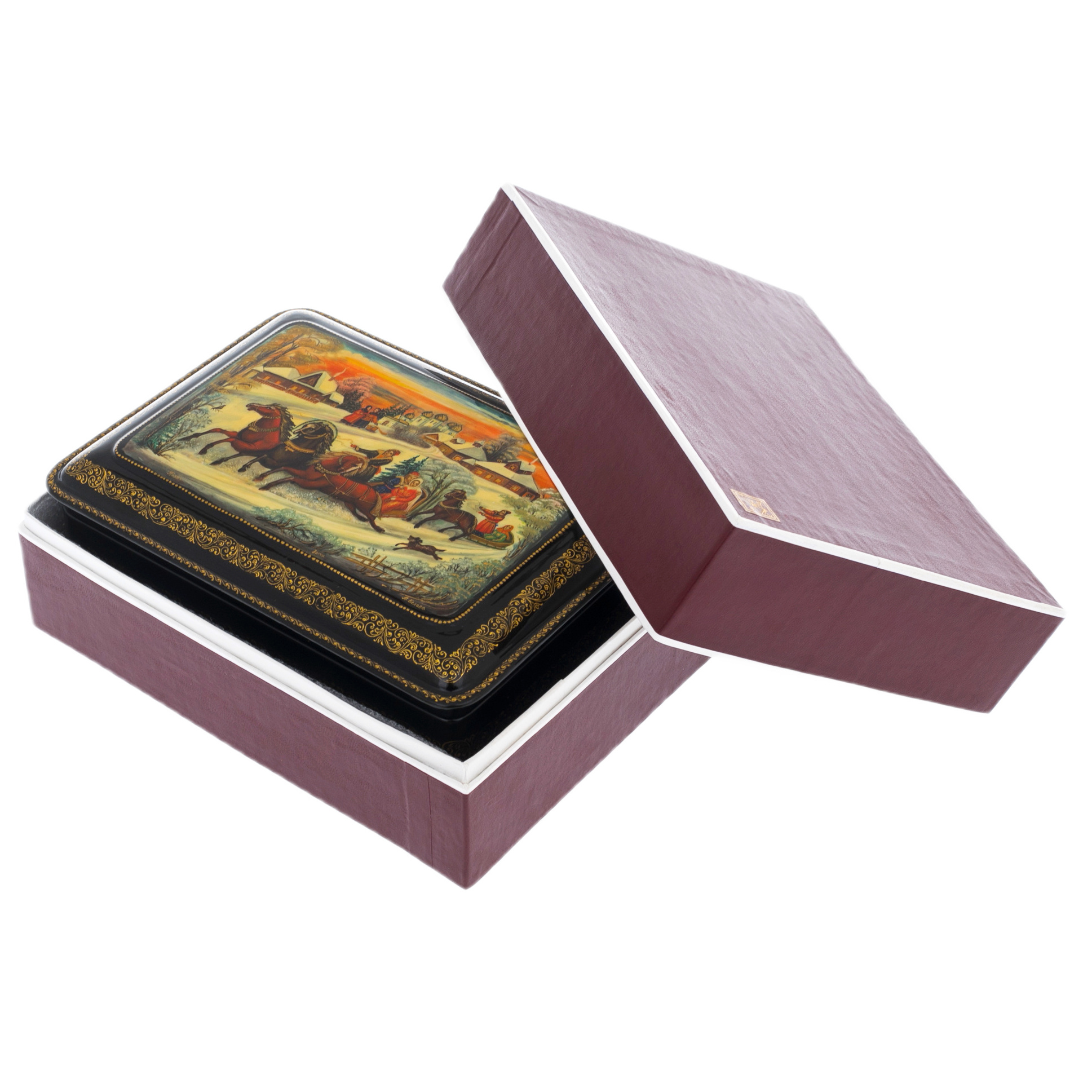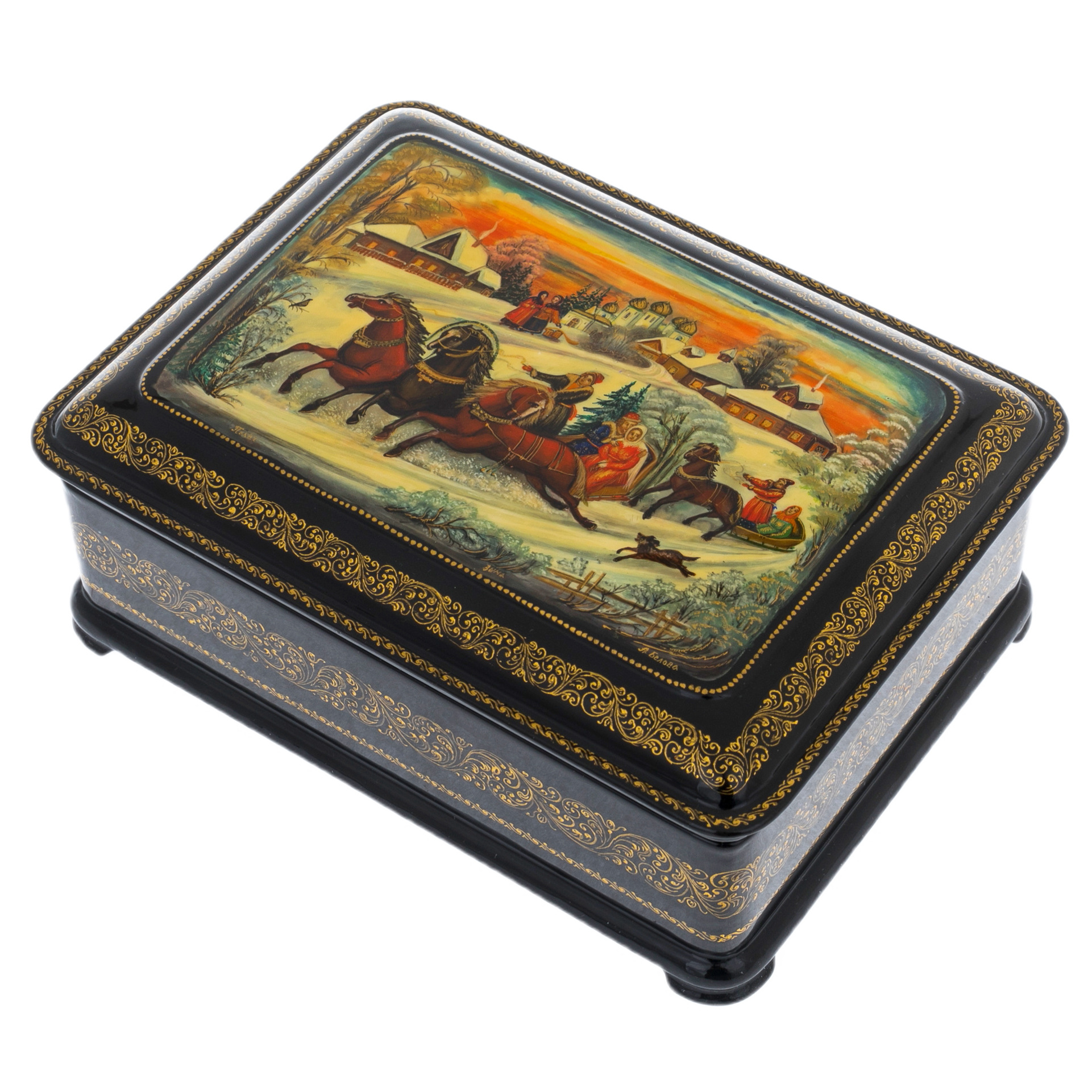 На крышке изображена стремительная тройка, прорезающая морозный воздух, символизируя неукротимую энергию и величие русского характера. Заснеженные деревни, уютные дома с дымящимися трубами и багровое небо на горизонте создают образ зимнего заката, где природа застыла в моменте. Герои, укутанные в меха, везут праздник, радость и свет через холодные просторы, даря ощущение тепла даже в леденящий мороз. Каждая деталь этой сцены, от блеска лошадей до золотых отблесков снега, оживает под кистью мастера, превращая шкатулку в галерею сказочной жизни.