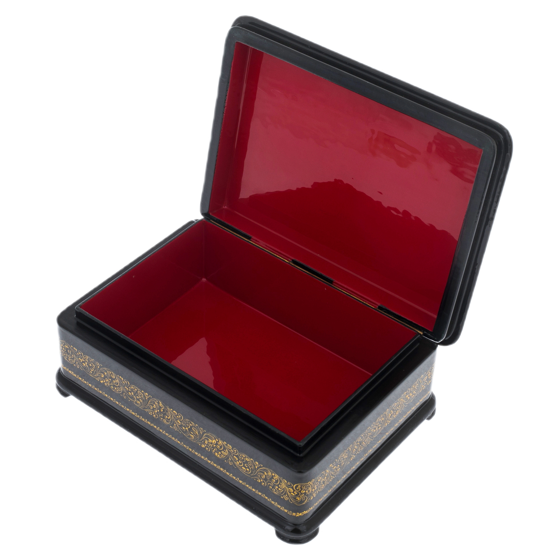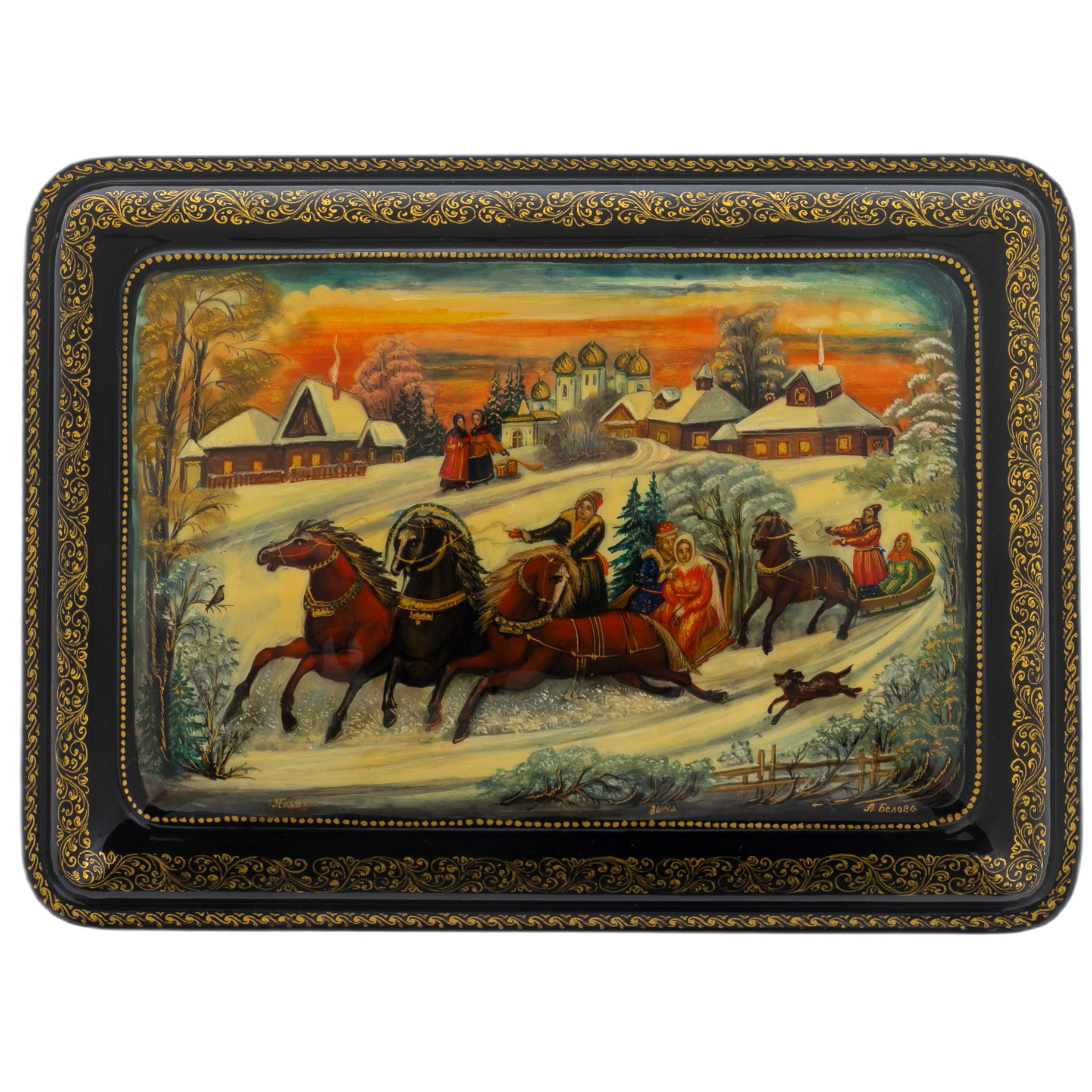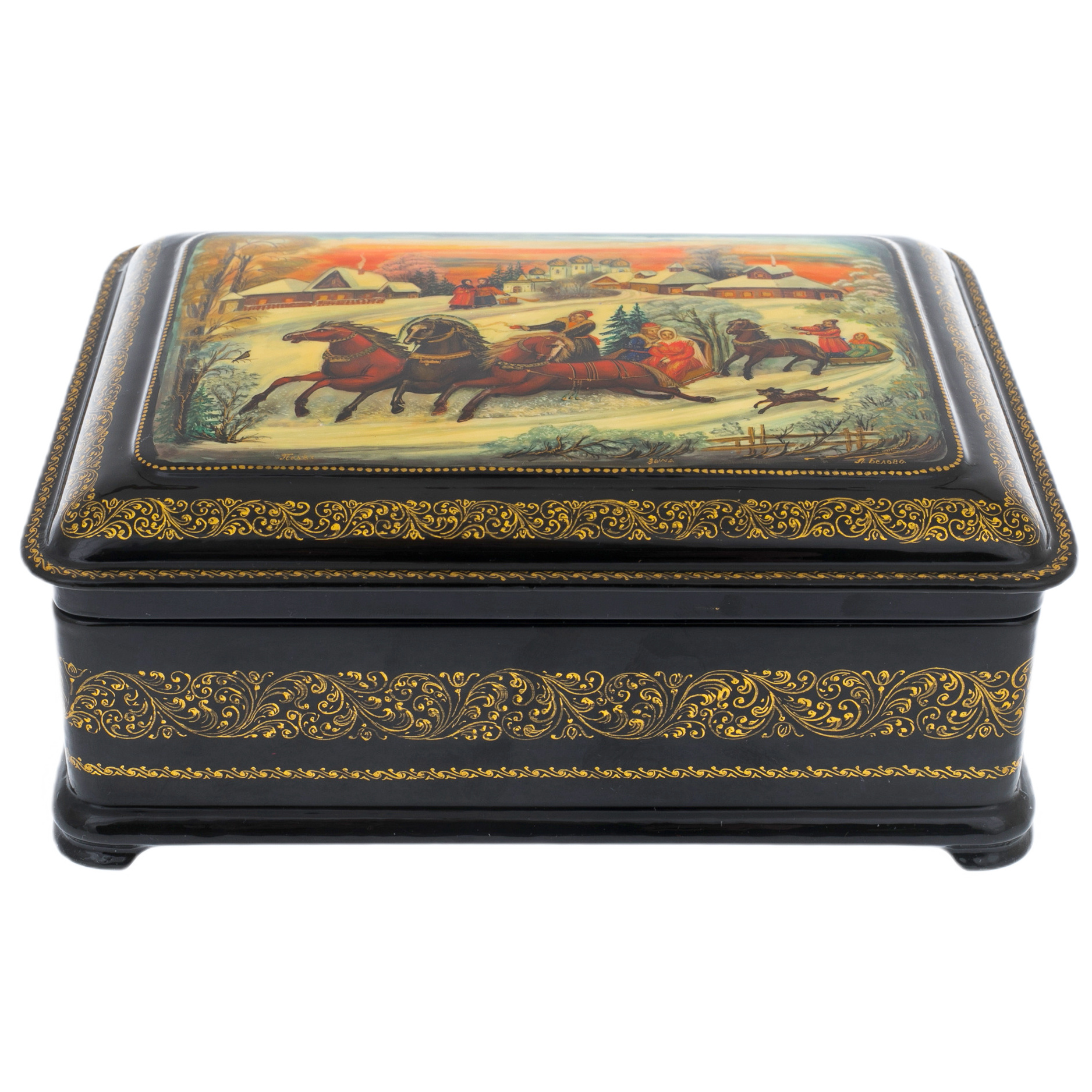На крышке изображена стремительная тройка, прорезающая морозный воздух, символизируя неукротимую энергию и величие русского характера. Заснеженные деревни, уютные дома с дымящимися трубами и багровое небо на горизонте создают образ зимнего заката, где природа застыла в моменте. Герои, укутанные в меха, везут праздник, радость и свет через холодные просторы, даря ощущение тепла даже в леденящий мороз. Каждая деталь этой сцены, от блеска лошадей до золотых отблесков снега, оживает под кистью мастера, превращая шкатулку в галерею сказочной жизни.