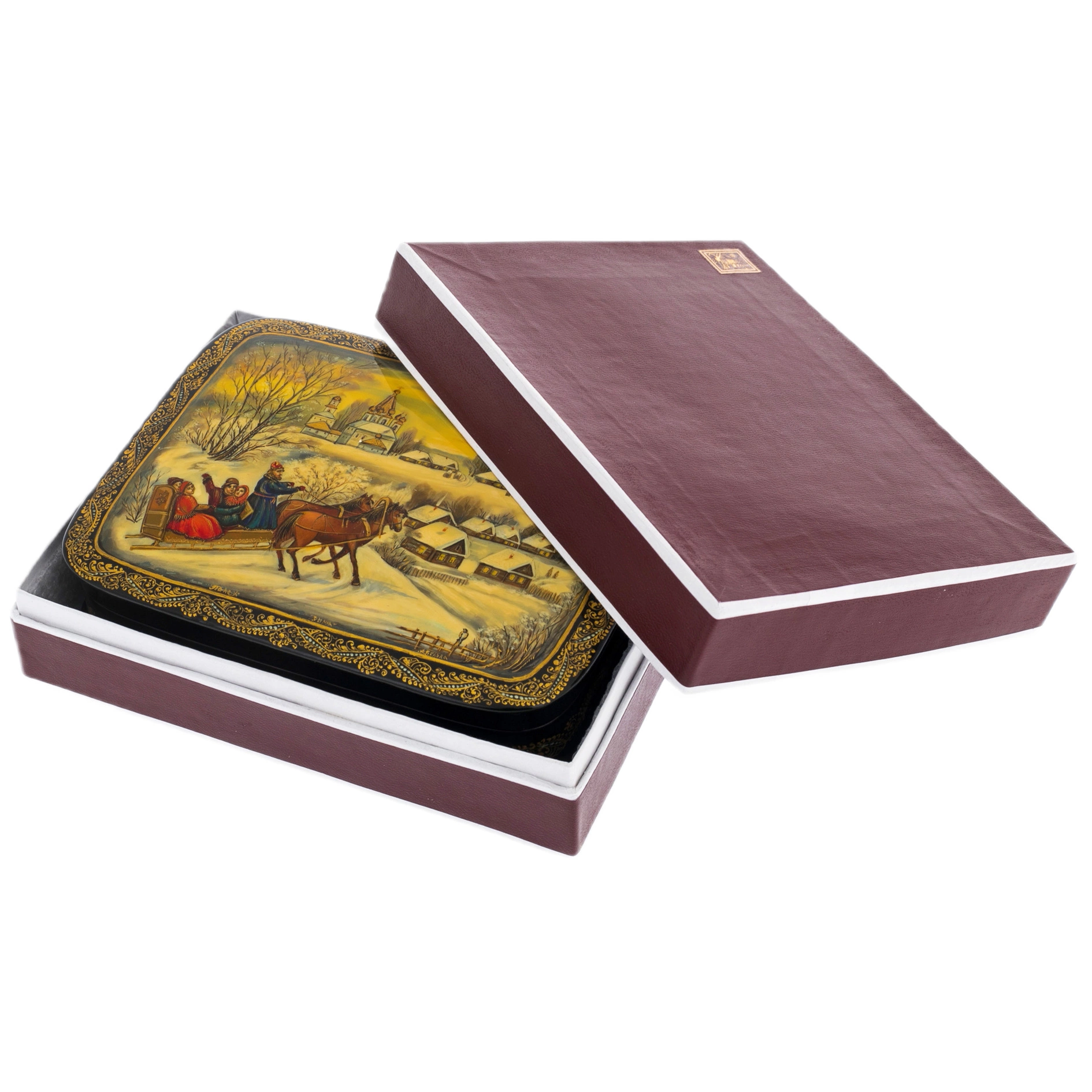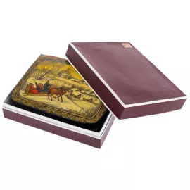 Это произведение палехских мастеров, выполненное в технике традиционной лаковой миниатюры, изначально создававшейся для самых взыскательных ценителей русского искусства. Корпус шкатулки формируется из прочной папье-маше, проходящего многоступенчатую сушку и покрываемого глубоким чёрным лаком, создающим эффект бездонной глянцевой поверхности. Внутреннее пространство выстлано густым красным лаком, контрастирующим с тёмным внешним блеском и подчёркивающим ощущение камерной драгоценности.