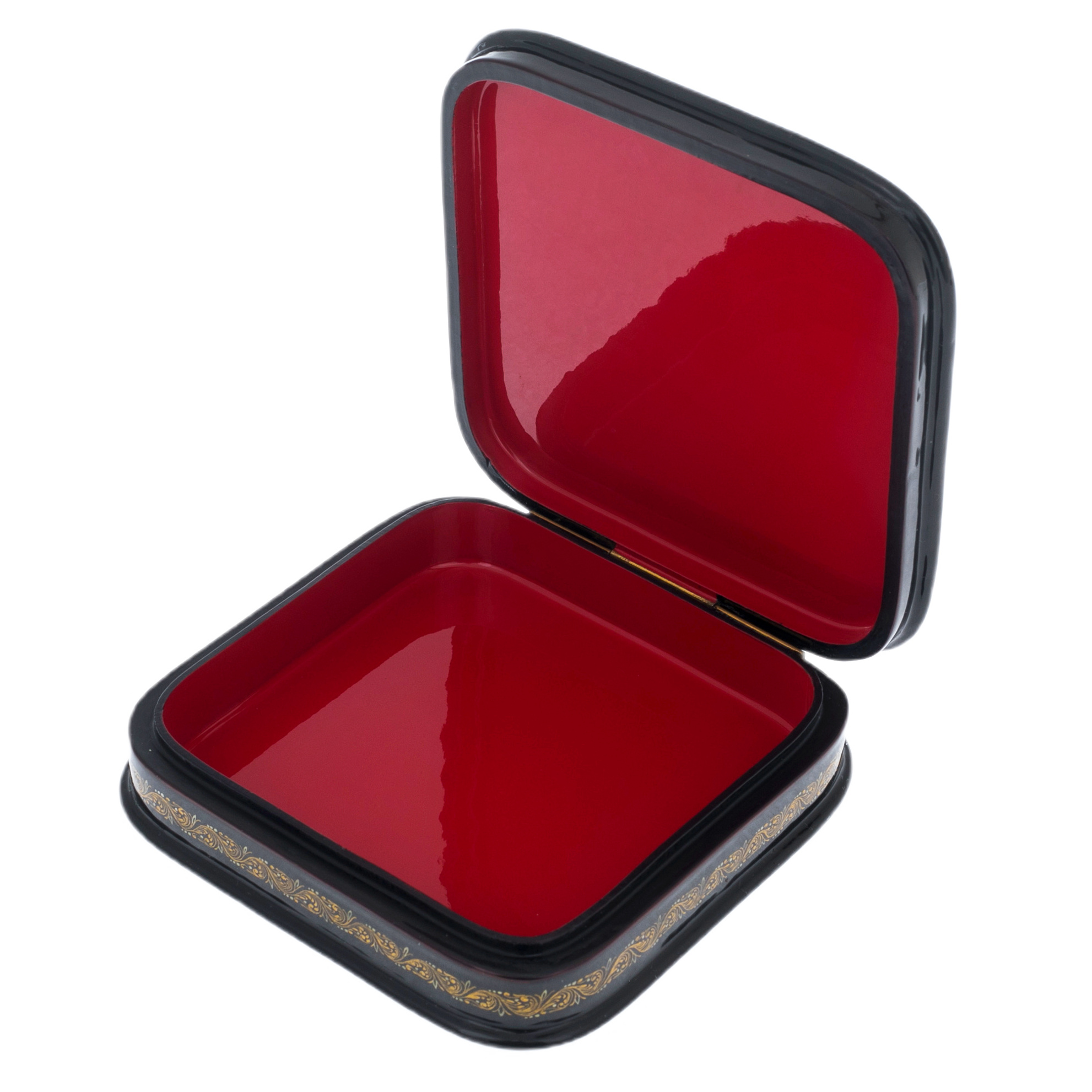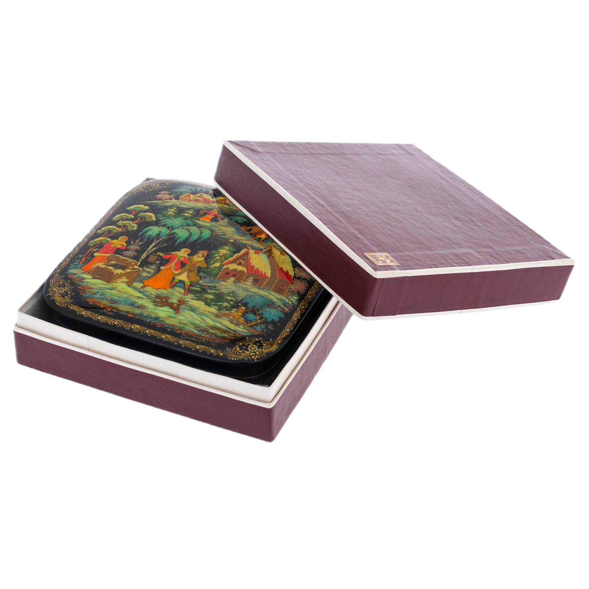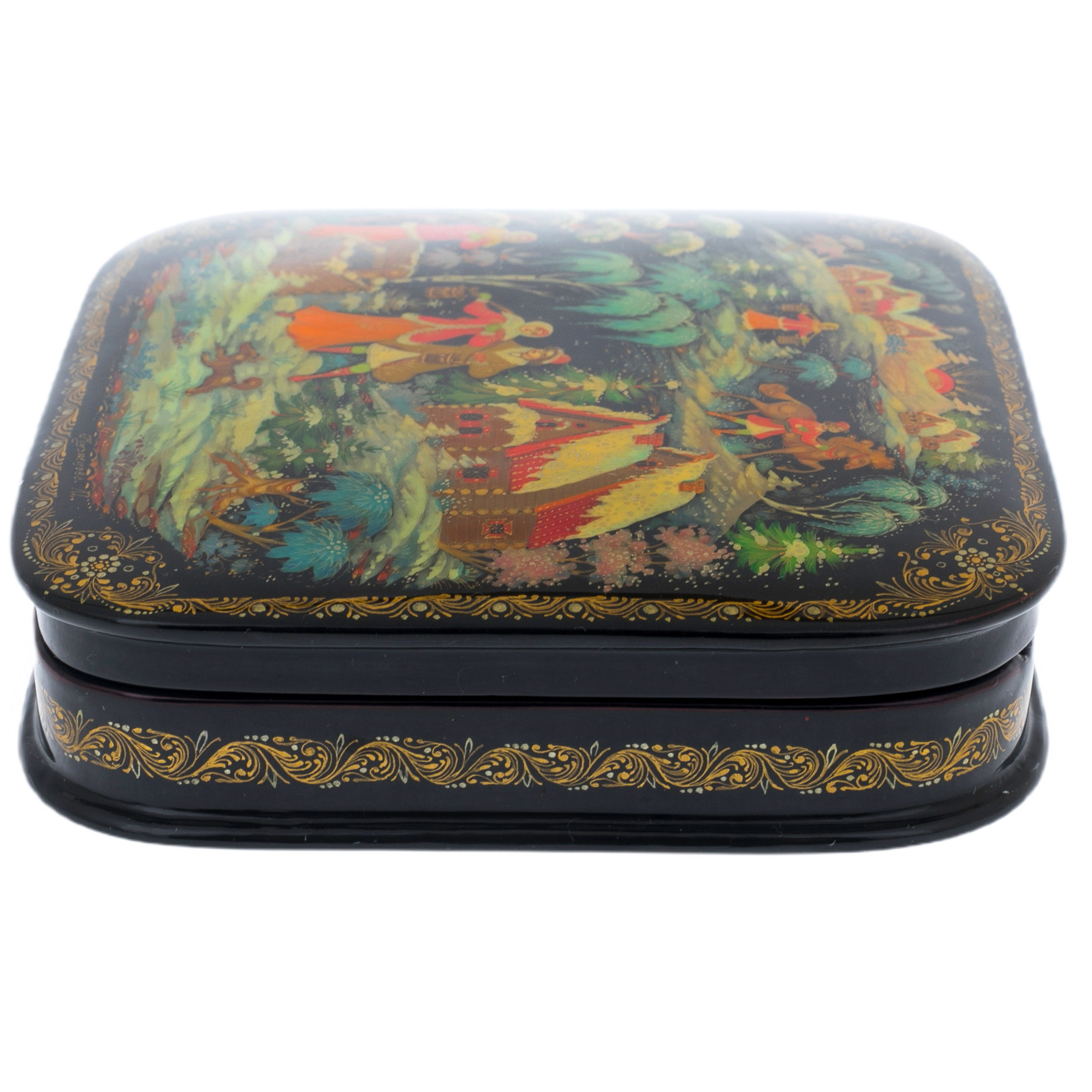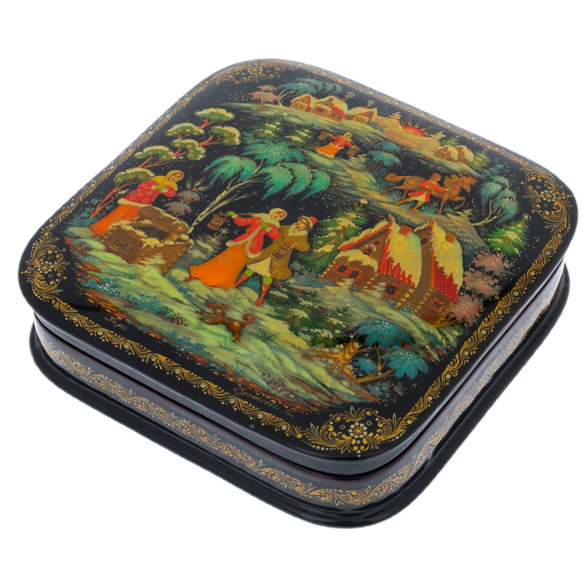 В этом изделии, словно в кристаллической капсуле, заключена сущность зимы: ледяная прозрачность, снежная чистота и таинственная магия морозного сияния. Палехские мастера, как волшебники, перенесли на поверхность шкатулки деревенский зимний пейзаж. Каждый мазок, каждая линия — это поэтическая метафора, символизирующая течение времени, изменчивость и вечность.