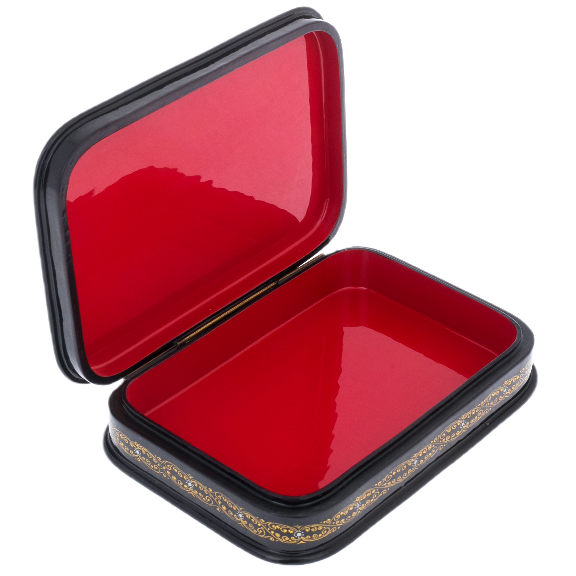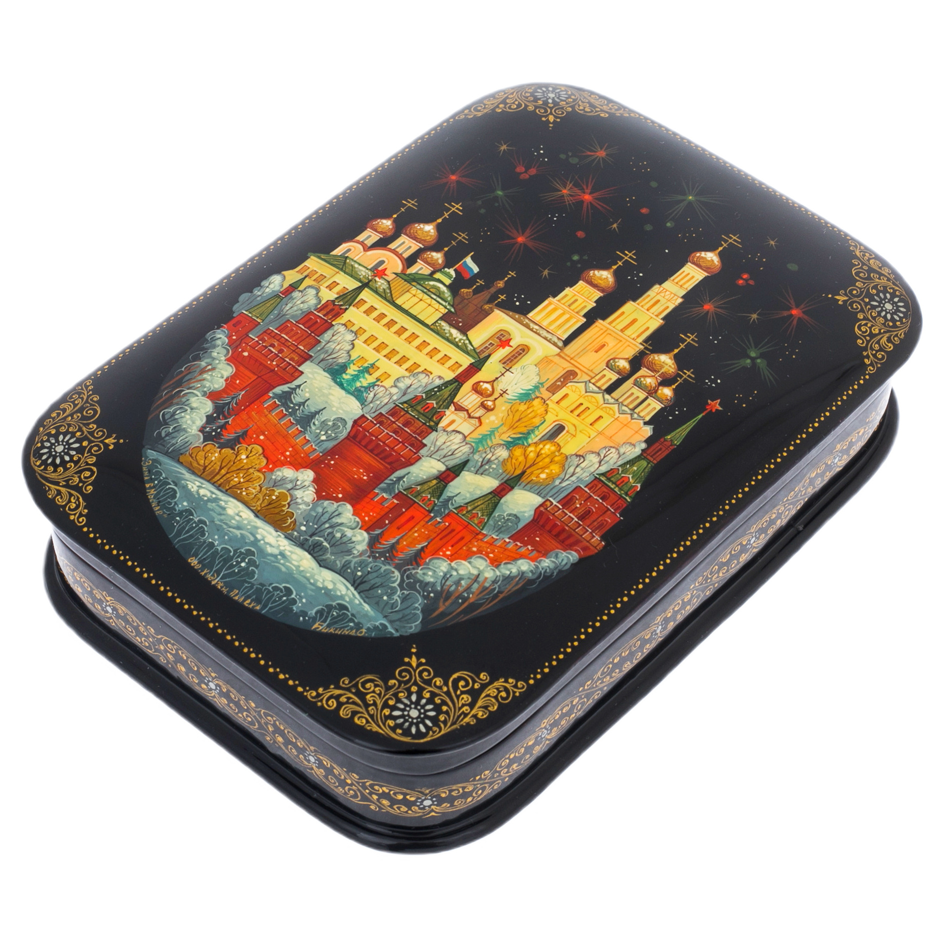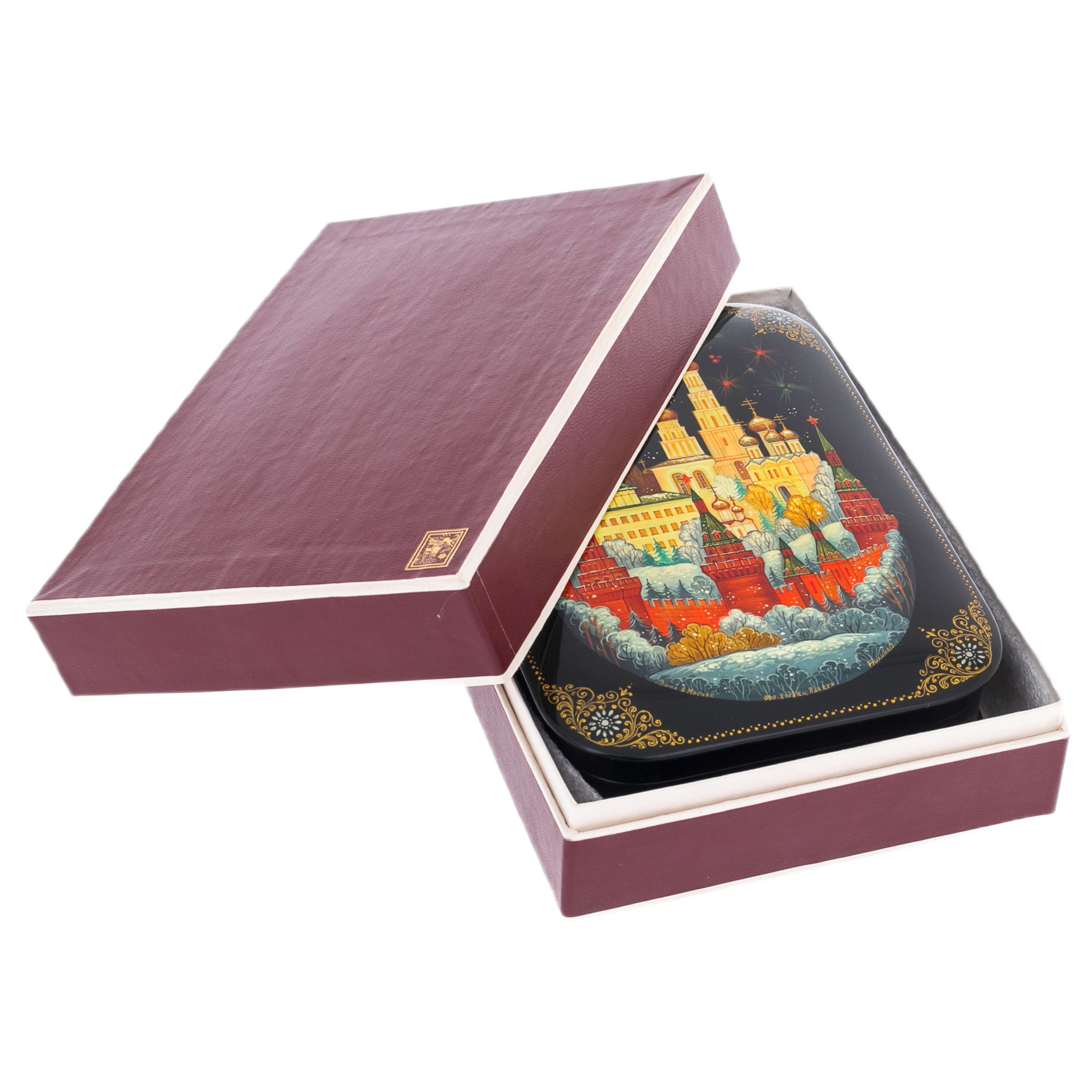 Шкатулка "Зимняя Москва" — настоящая находка для ценителей искусства и утончённого стиля. Изготовленная из прессованного высококачественного древесного картона (папье-маше), пропитанного горячим льняным маслом, она является символом статуса и изысканности. Нанесённый грунт, состоящий из льняного масла, сажи и глины, создаёт прочную и долговечную основу, на которую нанесён великолепный черный масляный лак, придающий изделию загадочность и глубину.
