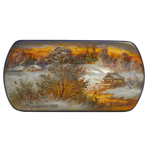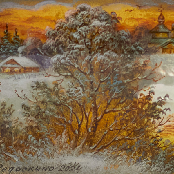 Отличительная черта Федоскинской миниатюры — реализм, достигнутый с помощью сложной многослойной масляной живописи. На эту живописную базу наносятся нежные отблески сусального золота, серебра, перламутра, создавая эффект свечения и глубины. Каждый штрих становится частью величественной композиции, оживающей в плавных переходах света и тени, подчеркивающих тончайшие детали.