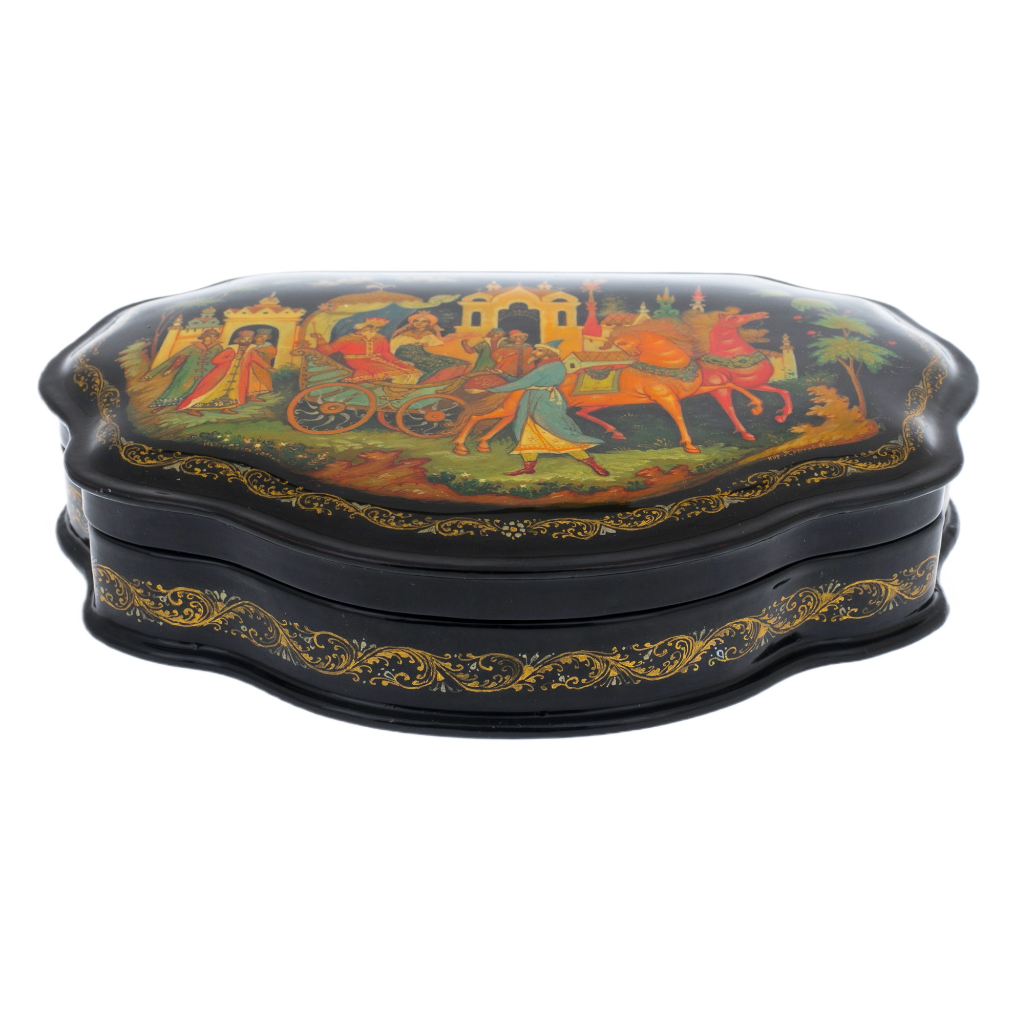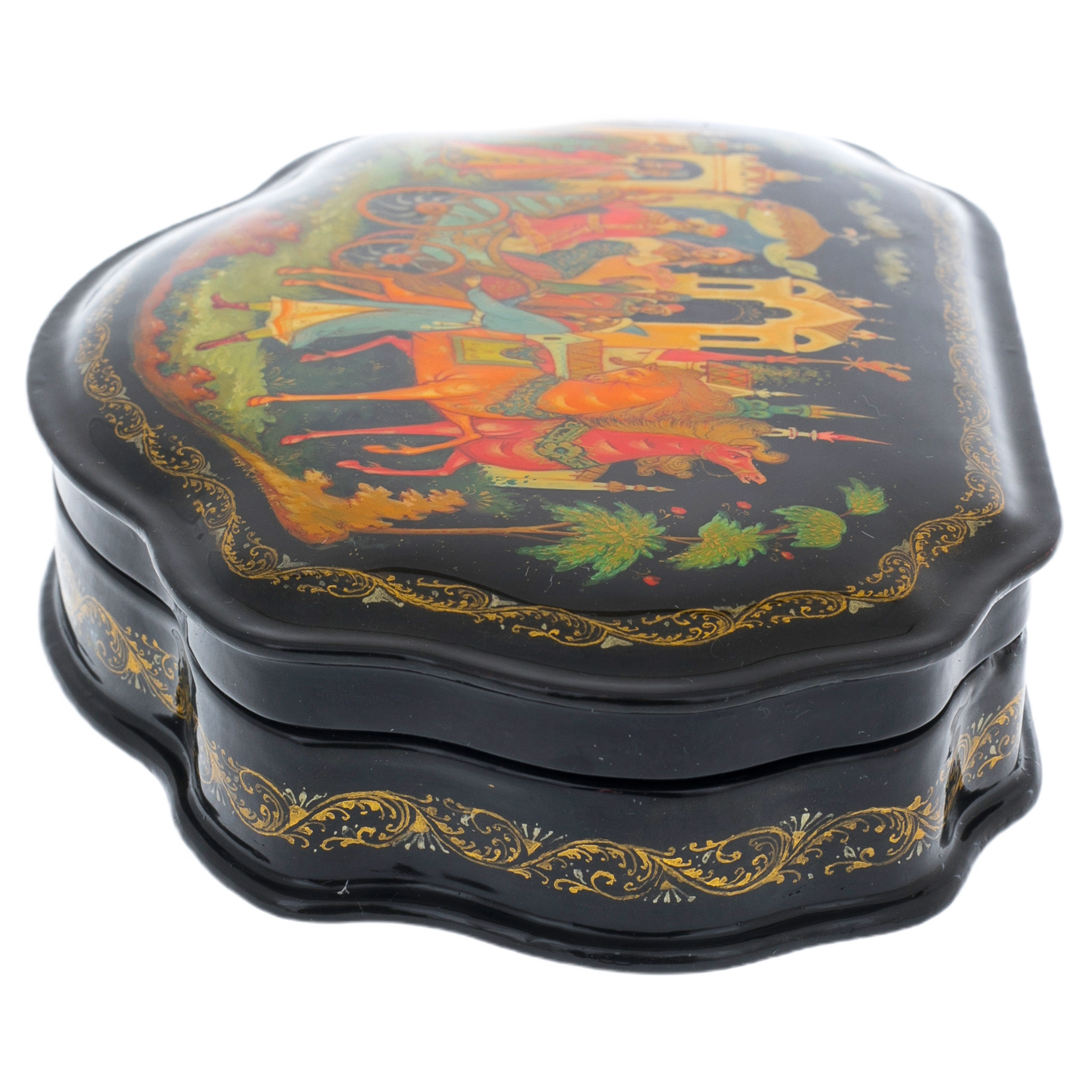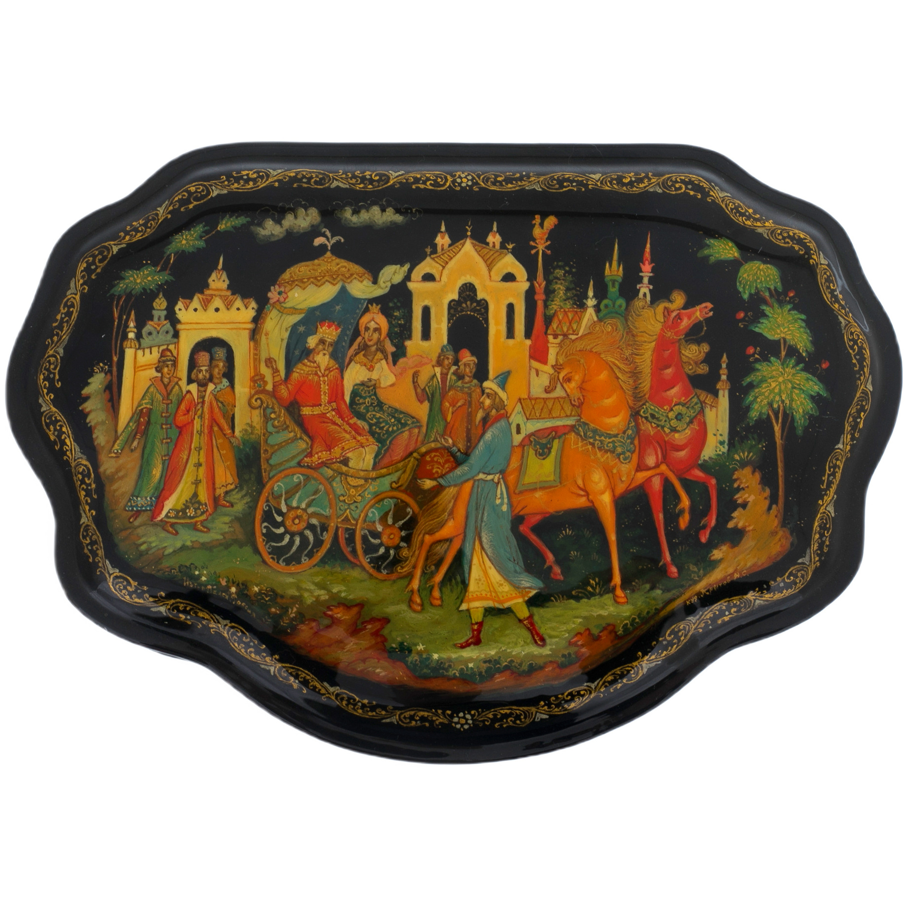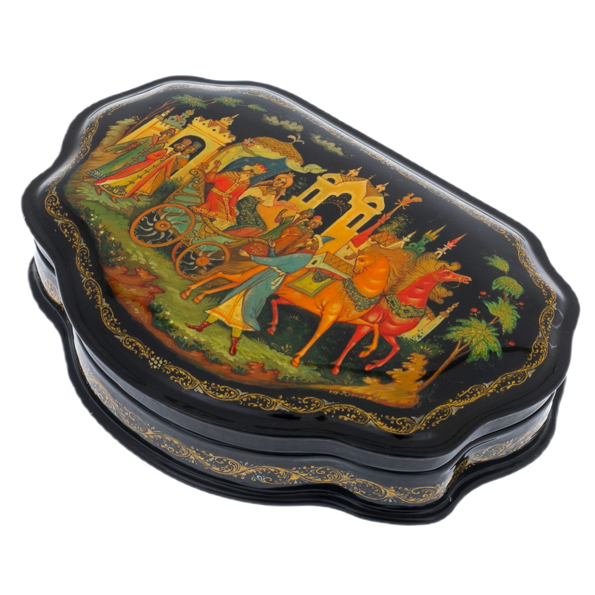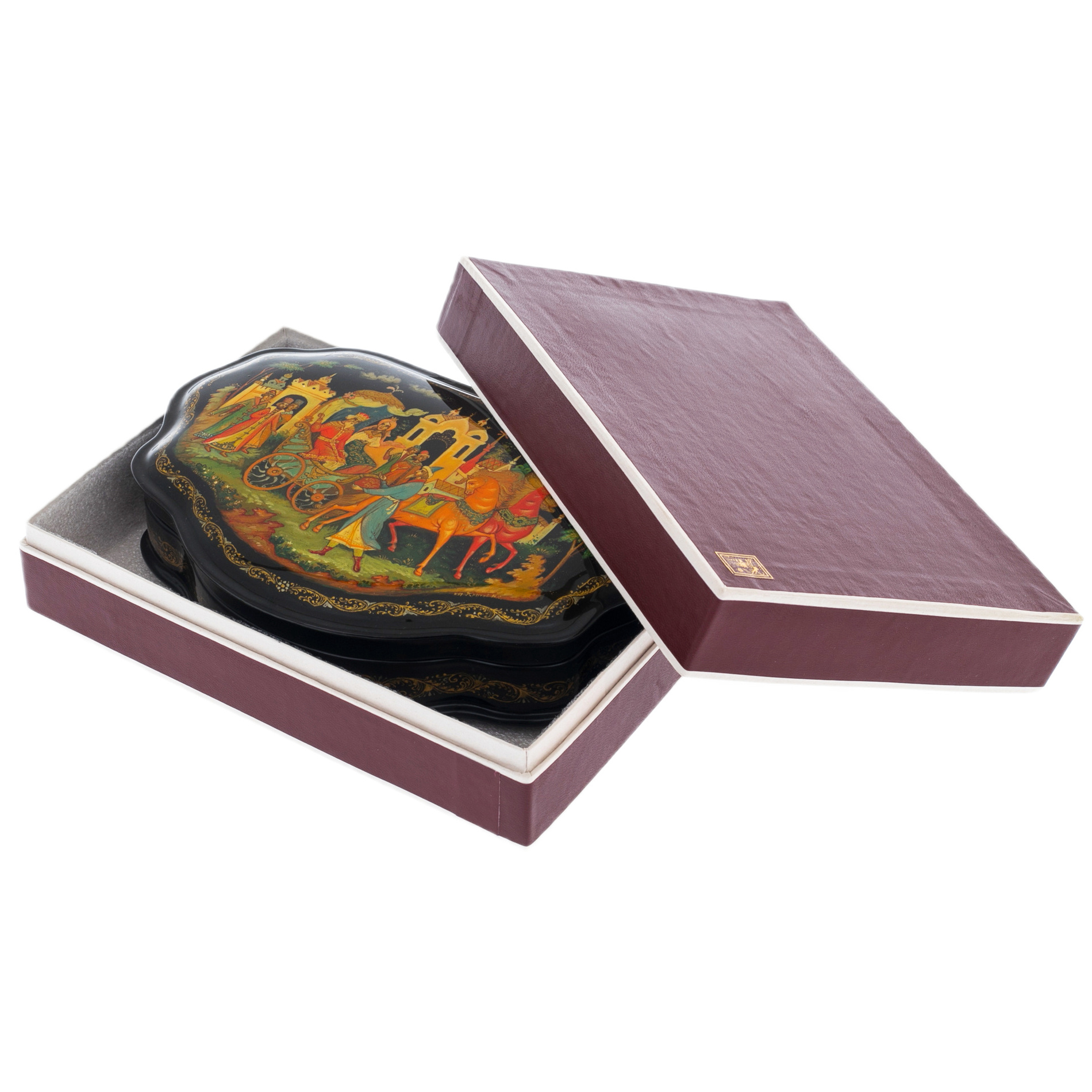 Крышка, покрытая лаковым блеском, рассказывает историю из сказки о золотом петушке, пробуждая детские воспоминания и восхищение древними преданиями. Под кистью художника оживает картина триумфа и торжества, где царские колесницы, запряжённые лихими скакунами, устремляются навстречу величию и судьбе. Персонажи словно сошли со страниц старинных рукописей: их наряды, украшенные золотыми нитями и яркими красками, говорят о богатстве и царственной гордости. Каждая линия, от тончайших контуров до сложного орнамента, сияет светом, наполняя композицию живой энергией. Золотое обрамление, вплетённое в сюжет, усиливает ощущение сказочной реальности, позволяя зрителю стать частью этой истории.