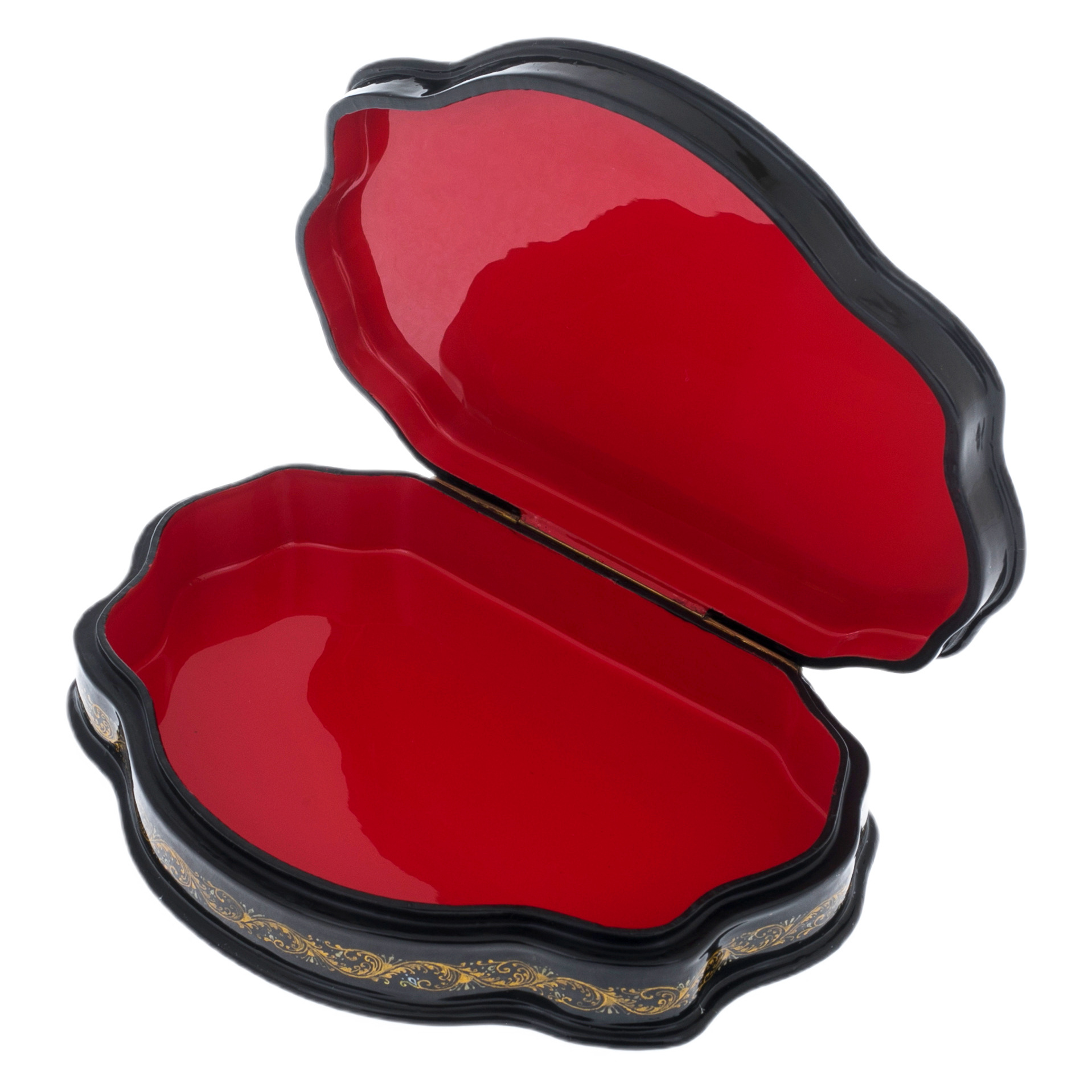 Внутренняя отделка алым лаком символизирует страсть и торжество, наполняя шкатулку не только эстетической ценностью, но и глубоким смыслом. Этот насыщенный цвет манит своей теплотой и обещает сохранить драгоценности, будь то редчайшие украшения или маленькие знаки внимания, в обстановке абсолютной роскоши. Безупречная отделка каждой грани говорит о мастерстве, отточенном до совершенства, а изгибы стенок придают шкатулке ощущение мягкости и текучести.