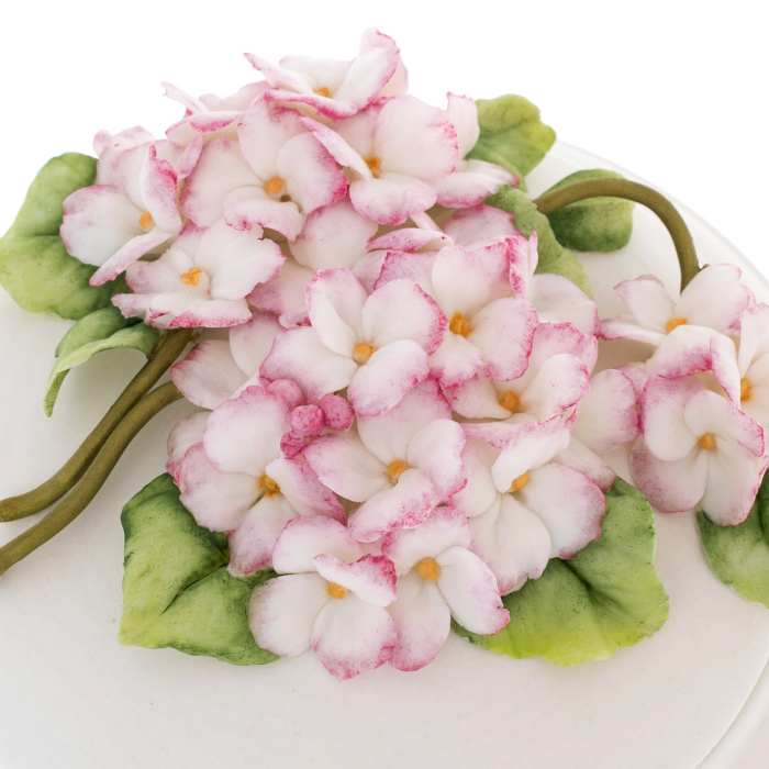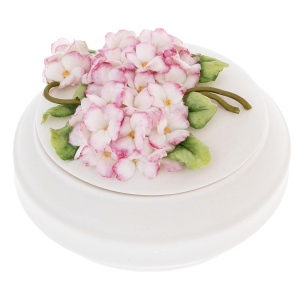Фарфоровая шкатулка «Надежда. Гортензия» создана как камерный объект, несущий в себе утончённую поэзию ручной работы. Классическая округлая форма подчёркивает чистоту белоснежного фарфора, излучающего мягкий матовый свет. Верхняя часть украшена композицией из гортензий — миниатюрных цветков с тончайшими переходами от снежного белого к нежно-розовому, словно собранных на рассвете, когда лепестки ещё сохраняют прохладную свежесть. Каждая прожилка на листьях и каждый изгиб стеблей тщательно прорисованы, создавая иллюзию живого растения, которого коснулась рука художника, обладающего особым чувством формы и цвета.