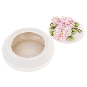Вся композиция основана на идее естественной лёгкости, достигаемой за счёт идеально выверенной пластики фарфора. Гладкая поверхность корпуса создаёт благородный контраст с рельефной цветочной группой, а приглушённые зелёные и розовые оттенки вносят деликатное ощущение тепла. Крышка прилегает мягко, без усилий, подчёркивая собранность и завершённость предмета. Внутреннее пространство аккуратно скрыто за лаконичной формой, позволяя хранить дорогие сердцу мелочи или драгоценные аксессуары в окружении эстетической тишины.