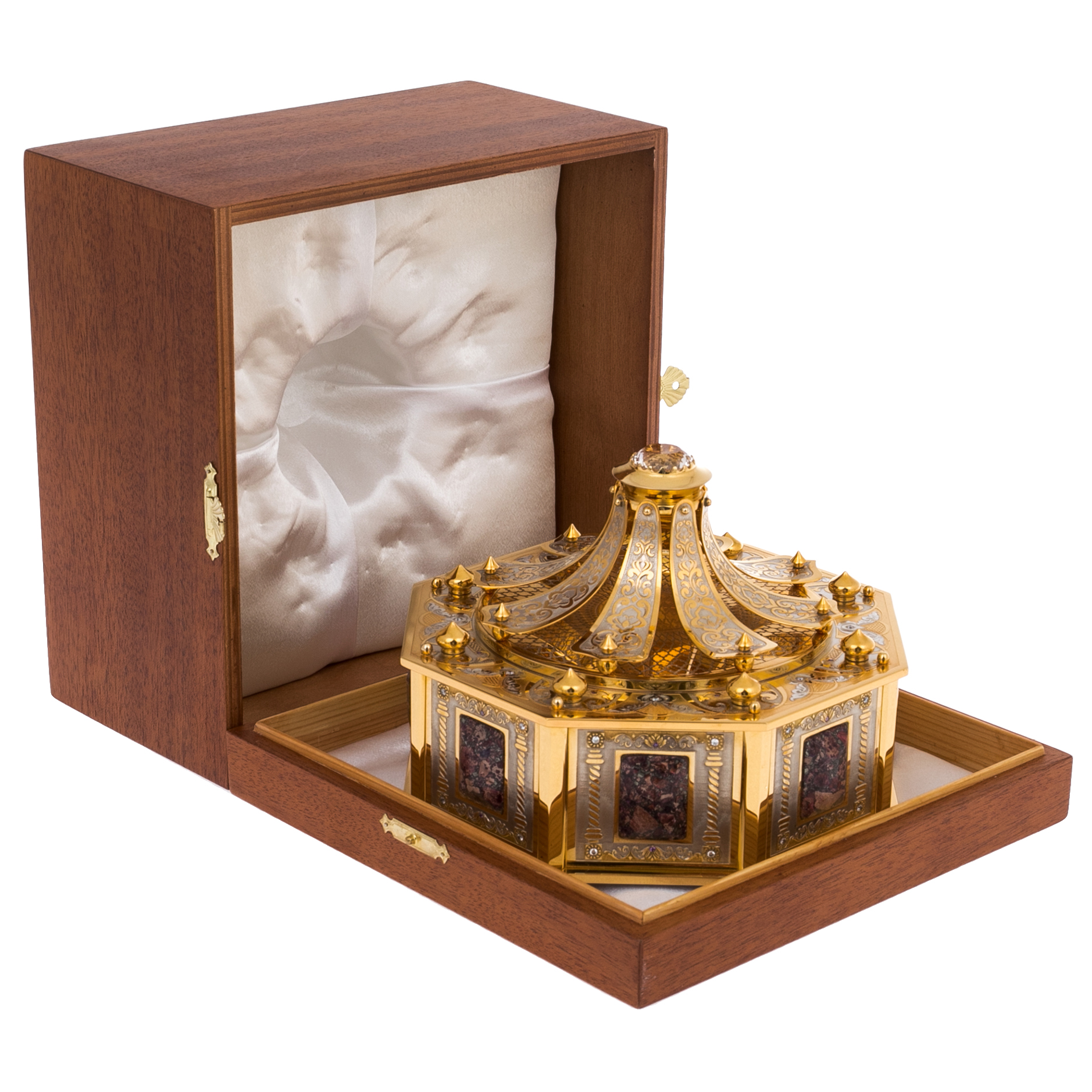 Как архитектурный образ восточной сказки, эта шкатулка поражает своим великолепием. Её форма повторяет очертания шатра — символа покоя, уединения и внутреннего богатства. Купол словно парит над основанием, поддерживаемый изящными арками, покрытыми тончайшей гравировкой и изысканным орнаментом.