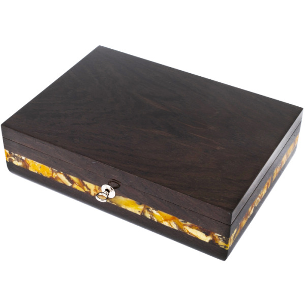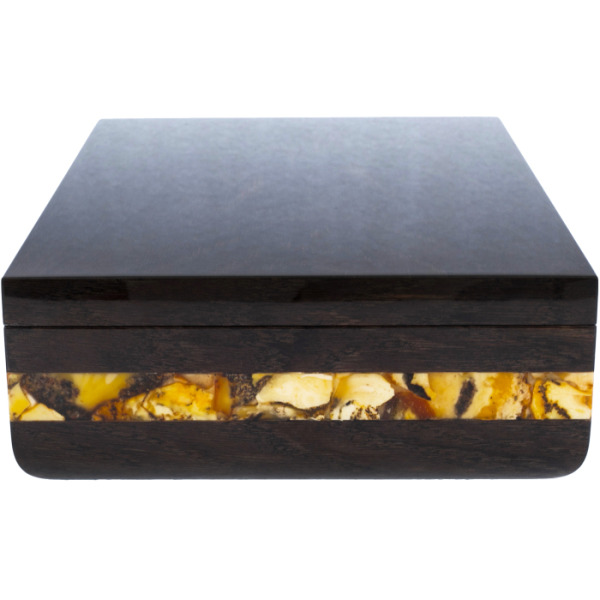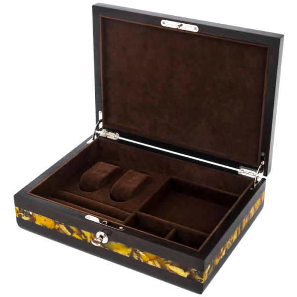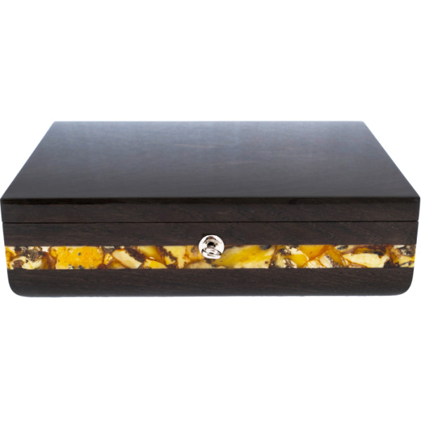 Шкатулка для часов из янтаря "Мемори"Шкатулка для часов из янтаря "Мемори"Потрясающе элегантная шкатулка выполнена из дерева и украшена янтарным орнаментом. На верхней поверхности изделия можно увидеть резную композицию в форме часового механизма с вставками из натурального янтаря. Шкатулка раздвигается в стороны, и внутри обнаруживается стеклянный ларец с ложементом и валиками из бежевого бархата.