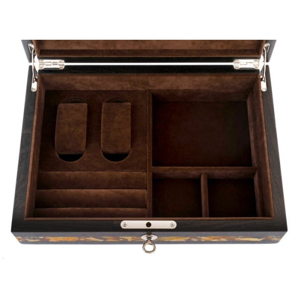 Этот оригинальный сувенир можно рассматривать очень долго. Приятно прикасаться к шкатулке, любуясь ее текстурой с естественным природным рисунком. Хочется остановить взгляд на резной часовой механике с шестеренками и пружинами. Так и тянет бережно разложить дорогие часы на мягком бархате. Роскошная шкатулка будет оценена по достоинству в качестве подарка, особенно если выгравировать оригинальное поздравление на шильде.