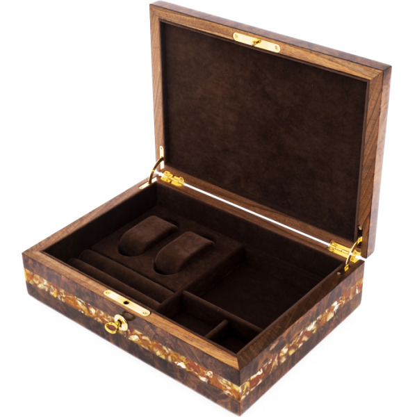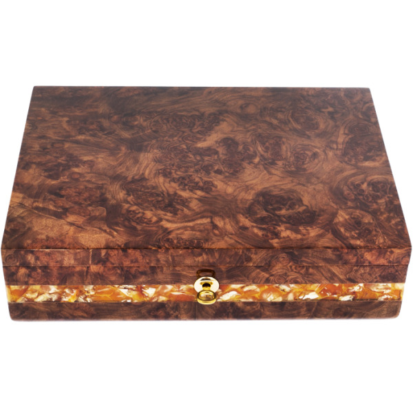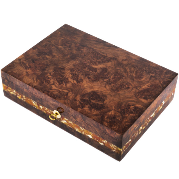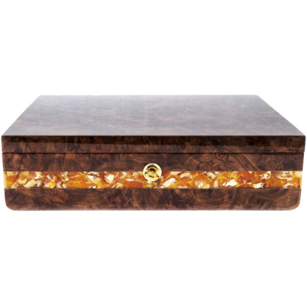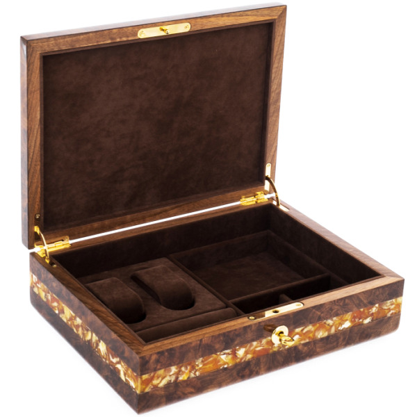 Шкатулка для часов сделана вручную из корня ореха и украшена декоративной вставкой из янтарного композита.