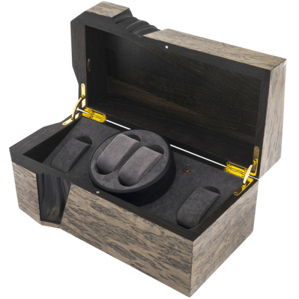 Внутри она отделана бархатом с подушечками для хранения часов и крутящейся подставкой в центре. Это желанный сувенир для тех, кто коллекционирует дорогие часовые механизмы и влюблен в магию точной механики. Шкатулка оживет, если украсить ее дарственной надписью со смыслом.