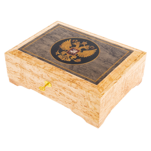 Шкатулка из мореного дуба и янтаря "Россия"Шкатулка из мореного дуба и янтаря "Россия"Шкатулка из морёного дуба с янтарной инкрустацией "Россия" — произведение прикладного искусства, отражающее государственную силу и вечные ценности. Лаконичные формы корпуса подчёркнуты выразительным контрастом фактур: массивный дуб с тонкой ручной резьбой по бокам, благородная глянцевая полировка крышки и насыщенная текстура мягкой бархатистой отделки внутри. Центральным элементом композиции выступает рельефный двуглавый орёл — герб России, выложенный янтарём и слоновой костью. Замок с ключом и надёжная фурнитура цвета старинного золота завершают образ исключительного по уровню изделия. Поставляется в индивидуальном кейсе с ручкой.