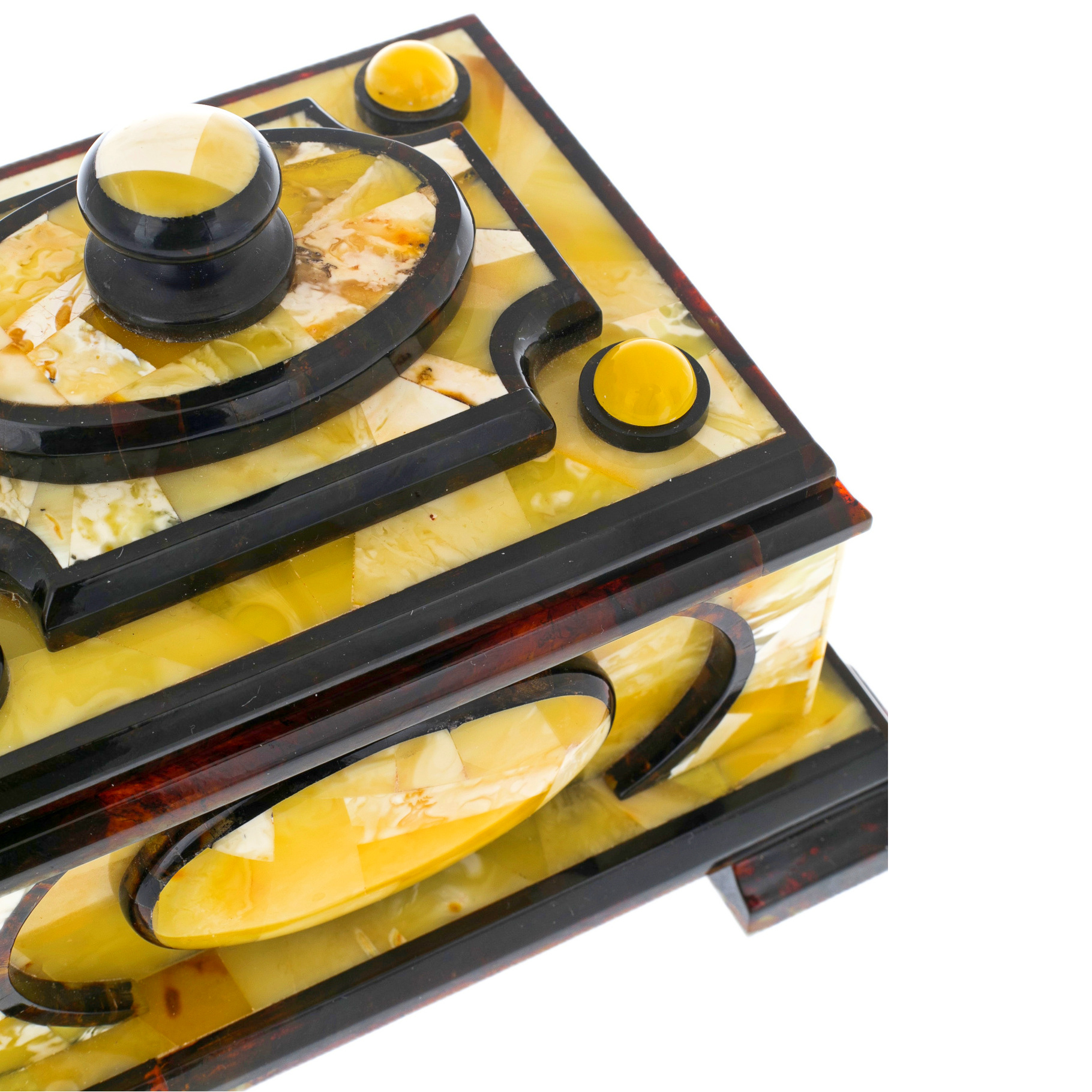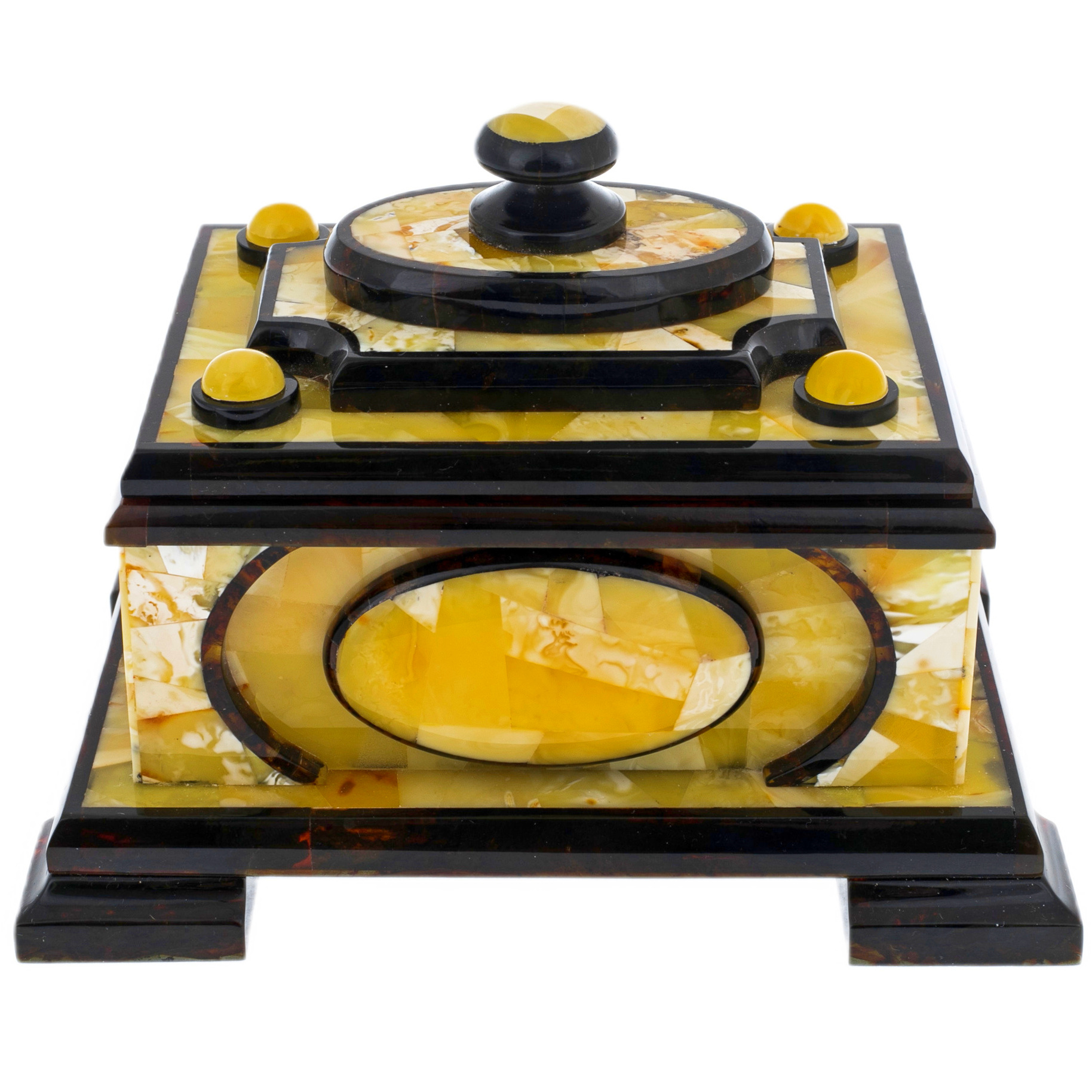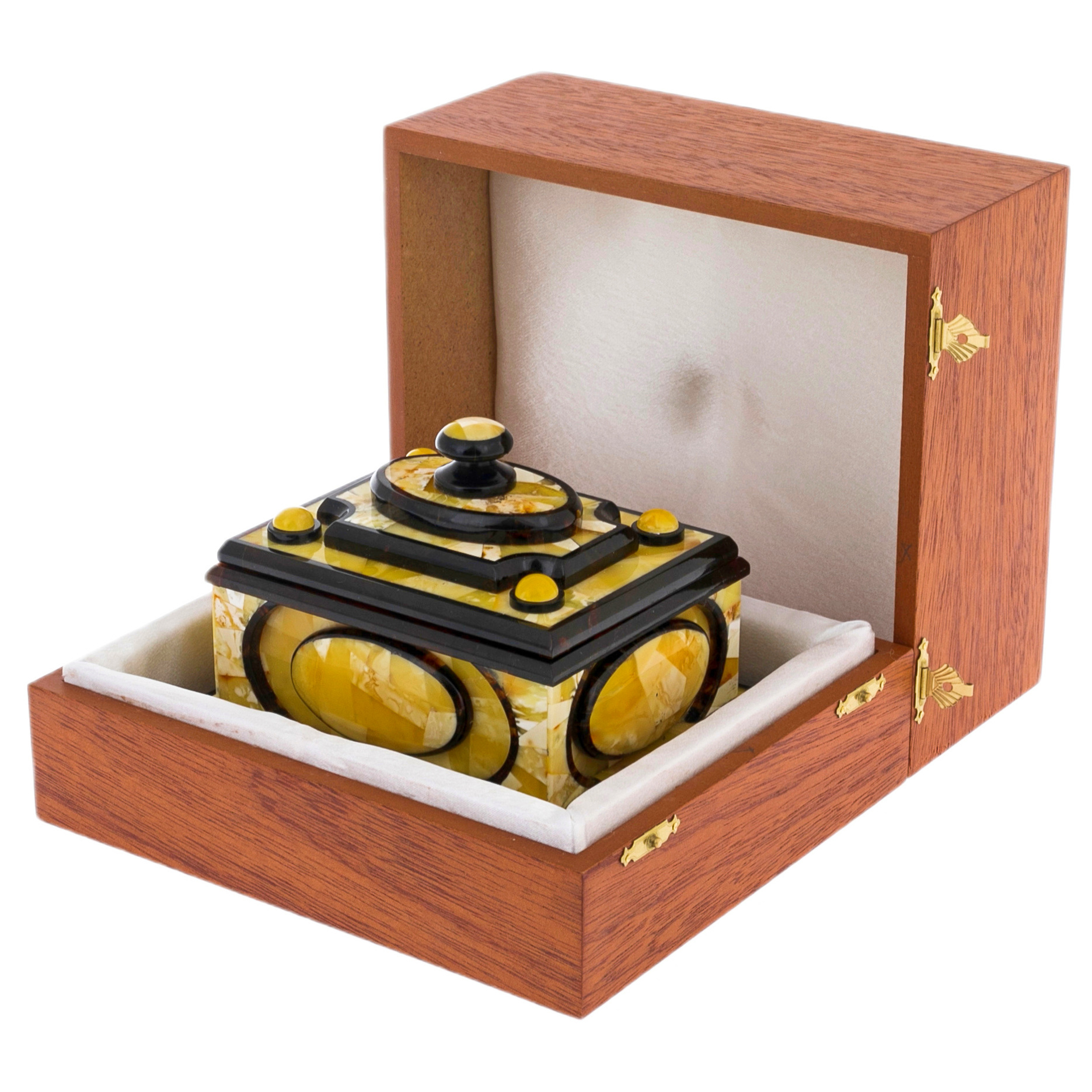 Янтарь, использованный в создании этой шкатулки, обладает теплым золотистым оттенком, что придает изделию особое очарование и элегантность. Янтарь издавна ценился за свои целебные свойства и магическую силу, его красота и сияние символизируют солнечную энергию и жизненную силу.