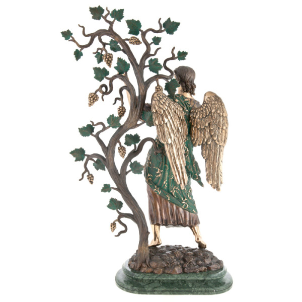Фигура ангела, выполненная с невероятной точностью и мастерством, завораживает своей утонченной грацией и величественной силой. Его поза — спокойная, но полная скрытой энергии, словно он только что сотворил чудо на ваших глазах. Взгляд ангела направлен на виноградную лозу, которую он бережно поддерживает, собирая спелые гроздья с благоговейной заботой. Этот момент — символ небесного урожая, символ труда, который приносит плоды, символ того, что каждое усилие вознаграждается щедростью небес.