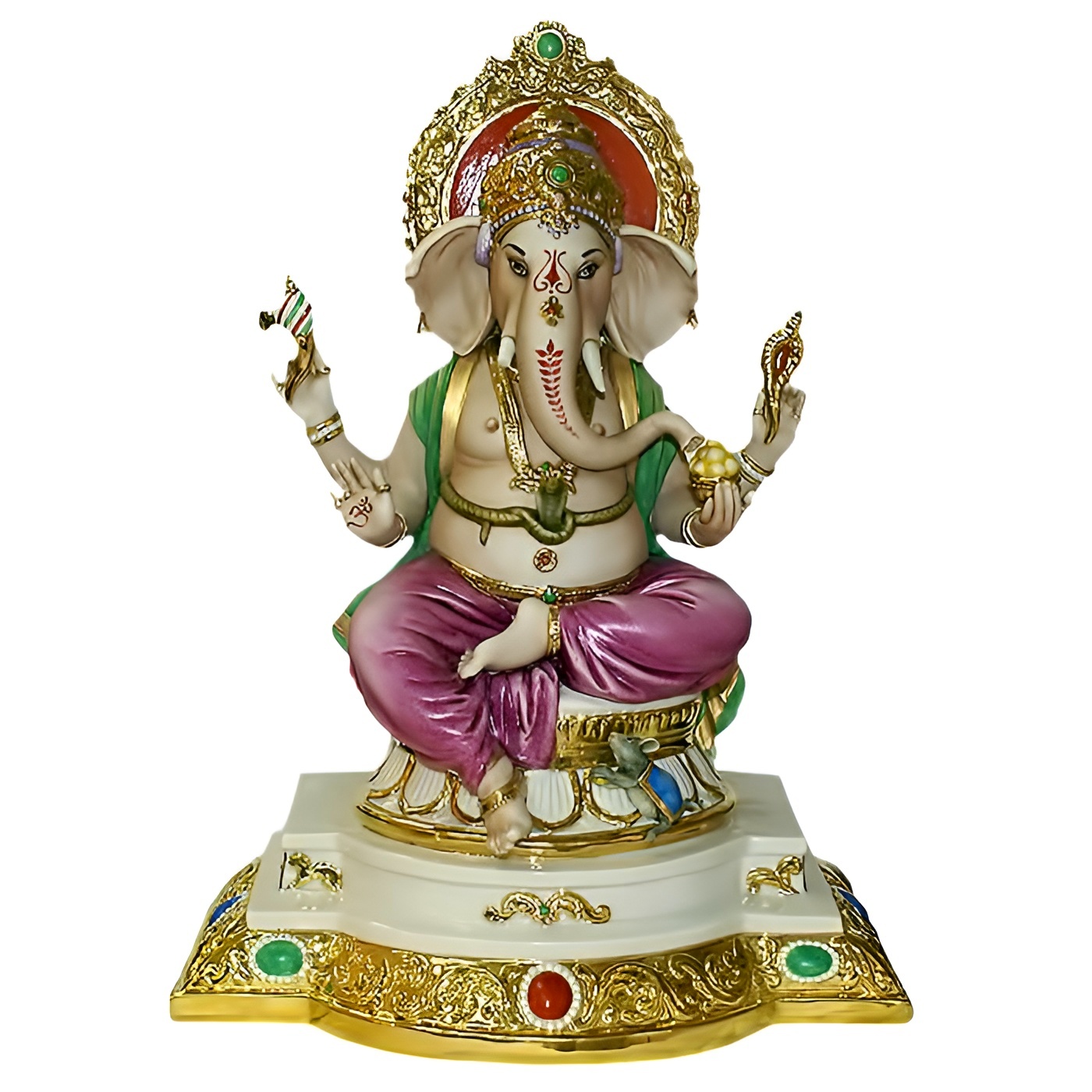 Фарфоровая статуэтка Ганеши — это не просто образ божества, а скульптурное воплощение древней мудрости, защищённой традицией и усиленной декоративной выразительностью. Изображённый в позе падмасаны, Ганеша — бог благополучия, процветания и устранения препятствий — восседает на лотосовом пьедестале, украшенном вставками из разноцветных камней и золотыми рельефами. Его четыре руки символизируют управление разными аспектами жизни: одна держит ладу (сладость, знак изобилия), другая — оберегающий жест, третья — символ разрушения иллюзий, четвёртая — ритуальный атрибут.