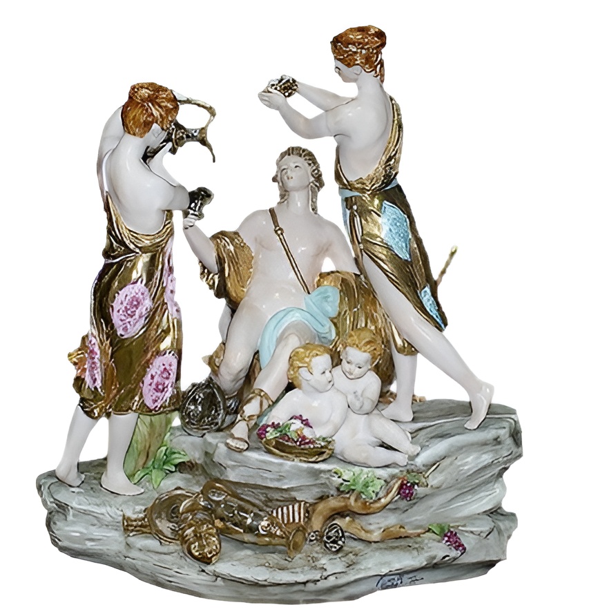 Фарфоровая статуэтка «Триумф Бахуса» — театральная аллегория из мира античной мифологии, в которой воплощена победа наслаждения над мерой, праздника над повседневностью. В центре композиции — юный Бахус, полубог вина и безудержной радости, восседающий на скале с жезлом в руке, в обрамлении двух менад, украшающих его венками и черпающих напиток из рога изобилия. У подножия расположены амуры, играющие с фруктами, — символами земных даров и удовольствий. Всё действие разворачивается в пространстве вне времени, где царствует культ тела, природы и чувственного бытия.