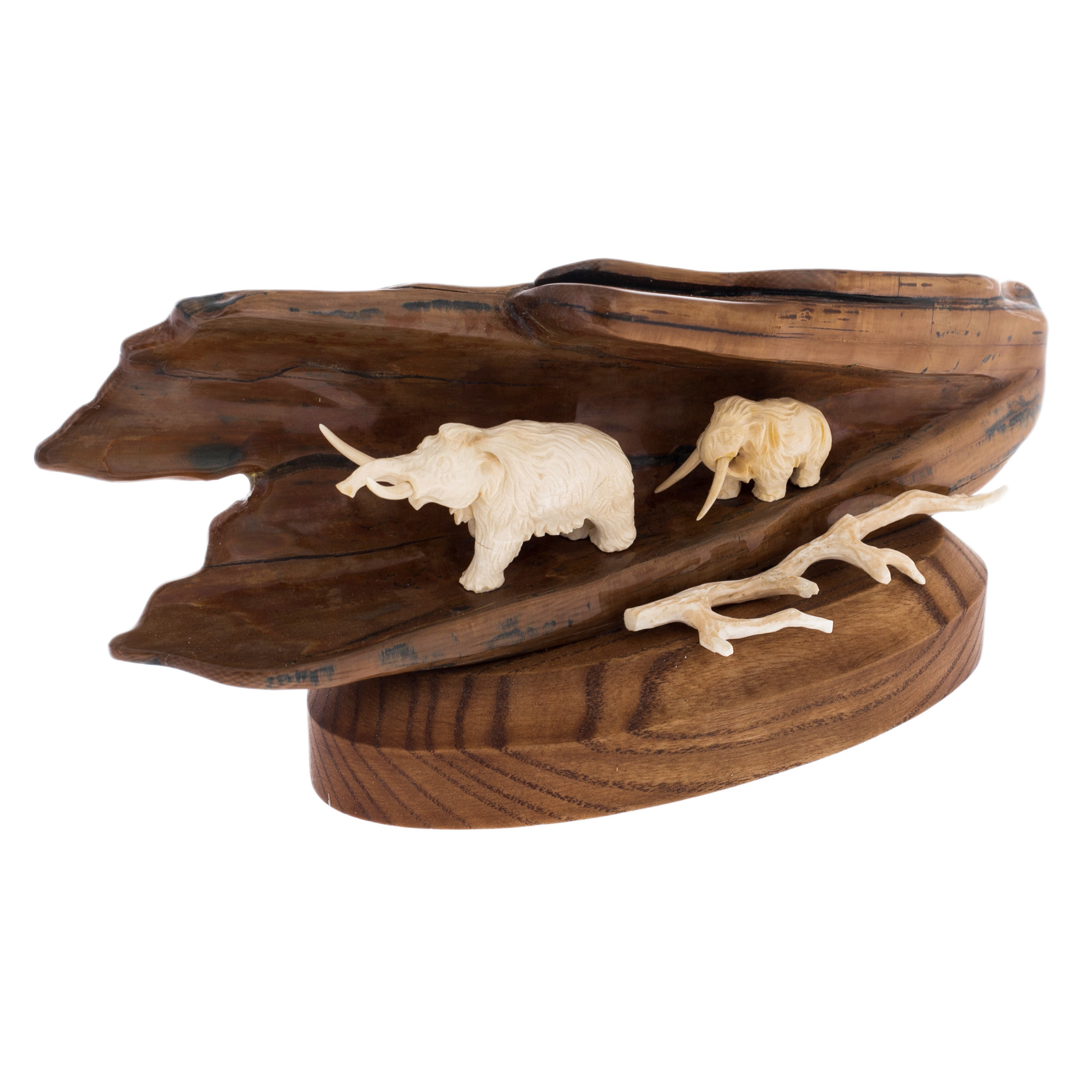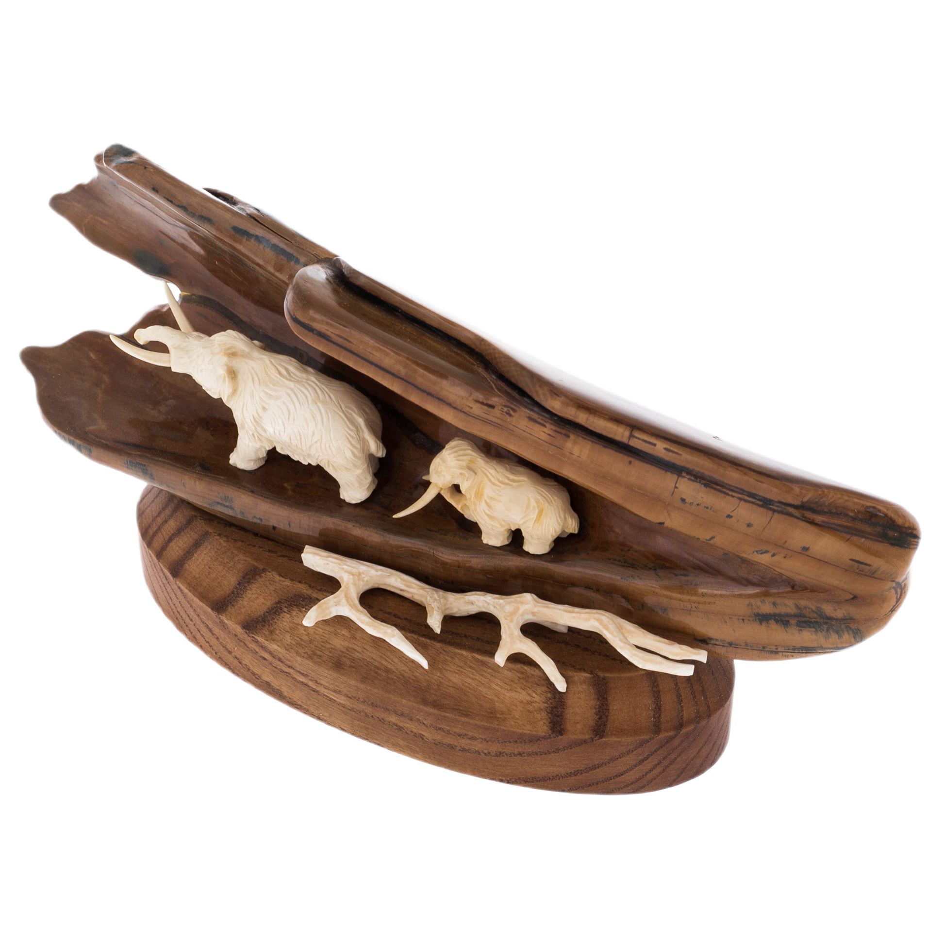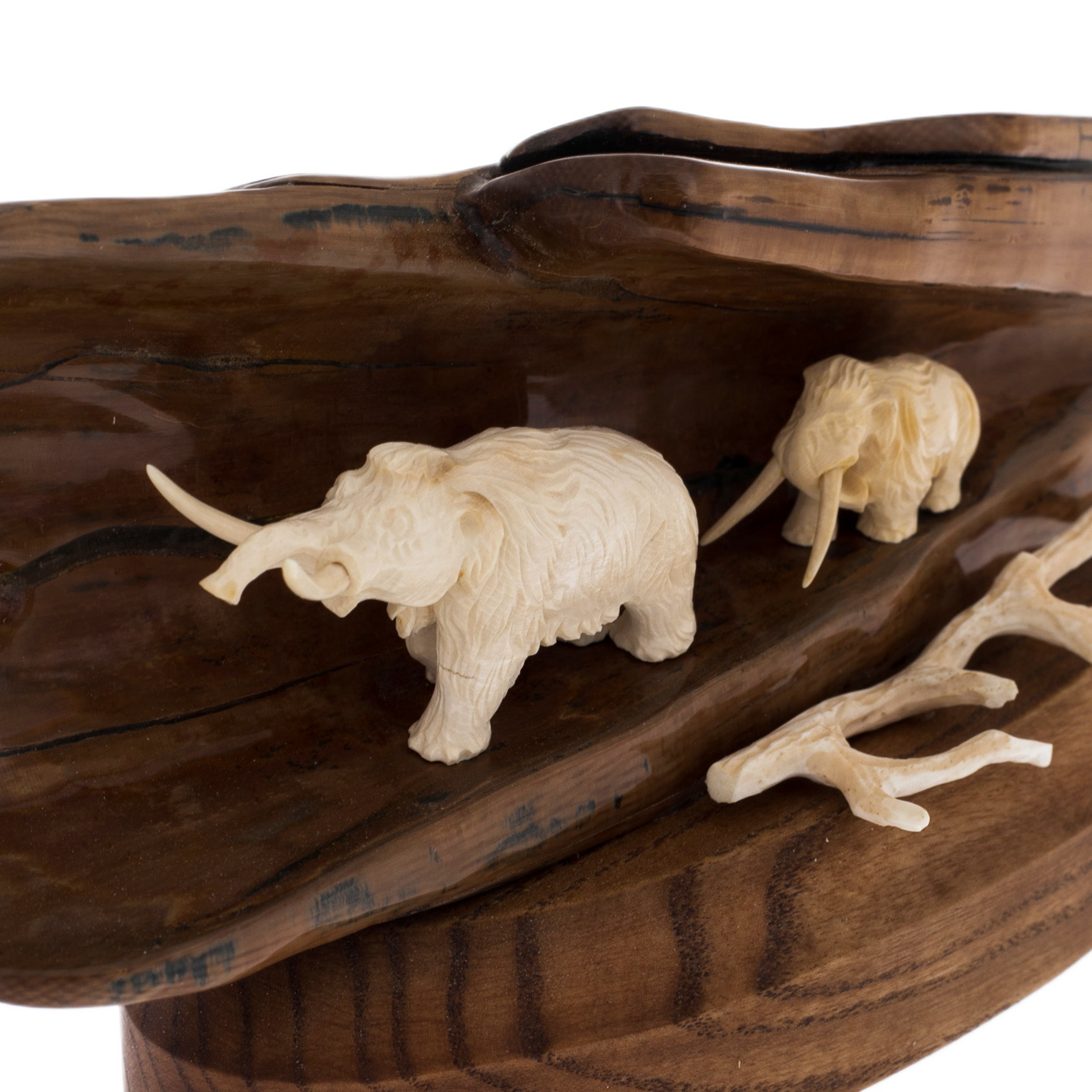 Скульптура из бивня мамонта и дуба "Два мамонта в пещере на подставке"