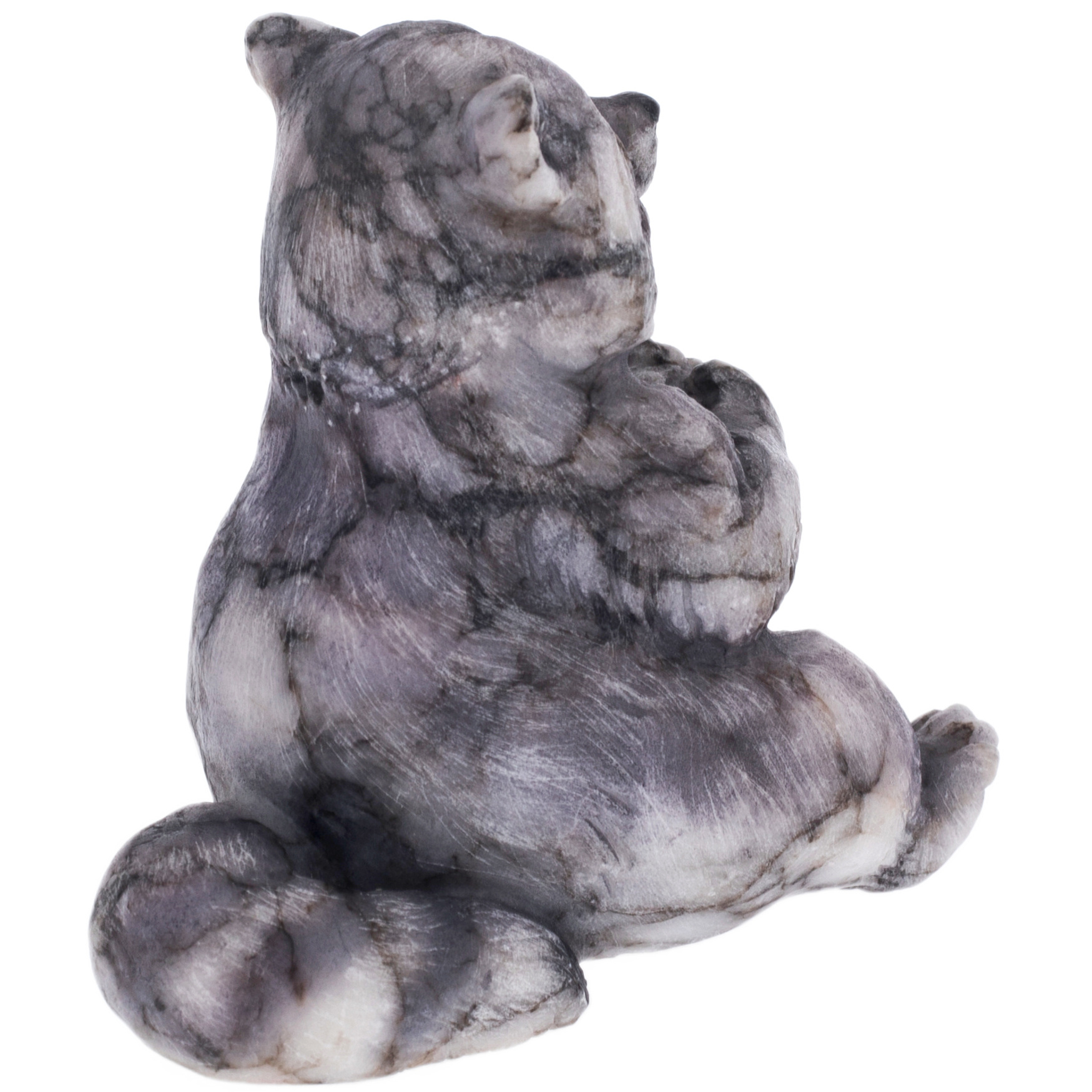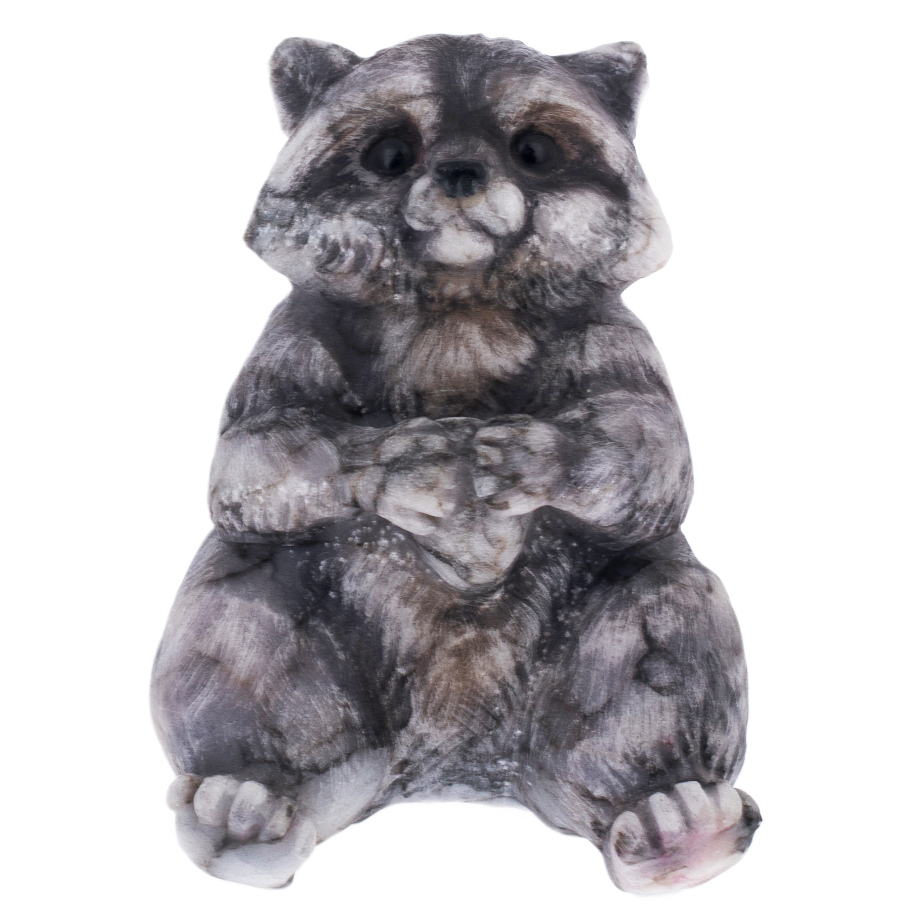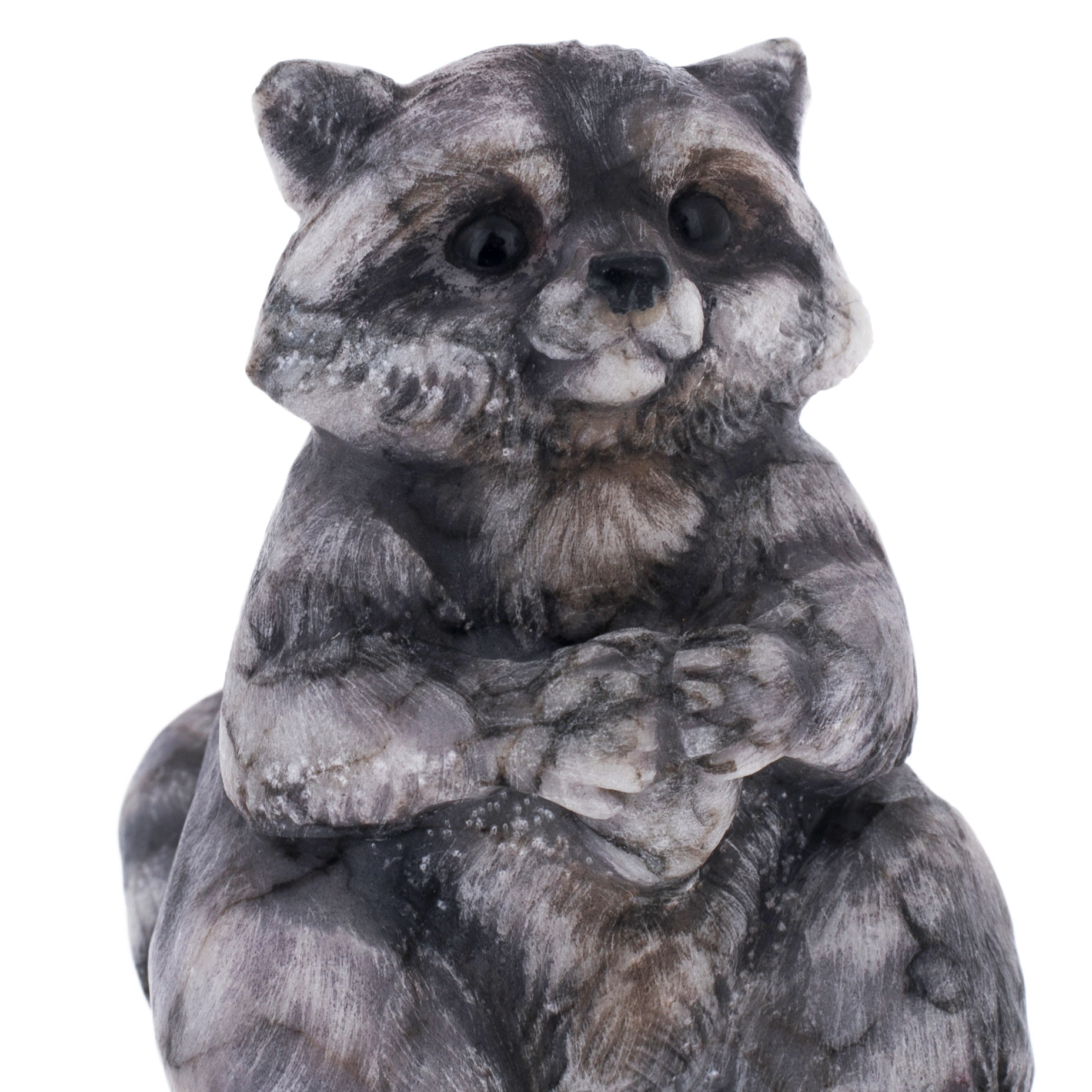 Енот, высеченный из натурального камня, поражает своей текстурой, передающей мягкость меха и глубину природных оттенков. Его лапки, сложенные в доверчивом жесте, создают ощущение неподдельной наивности и дружелюбия. Глаза, искусно выточенные и отполированные, отражают не только свет, но и характер животного — любопытство, доброту и тонкий намек на озорство.