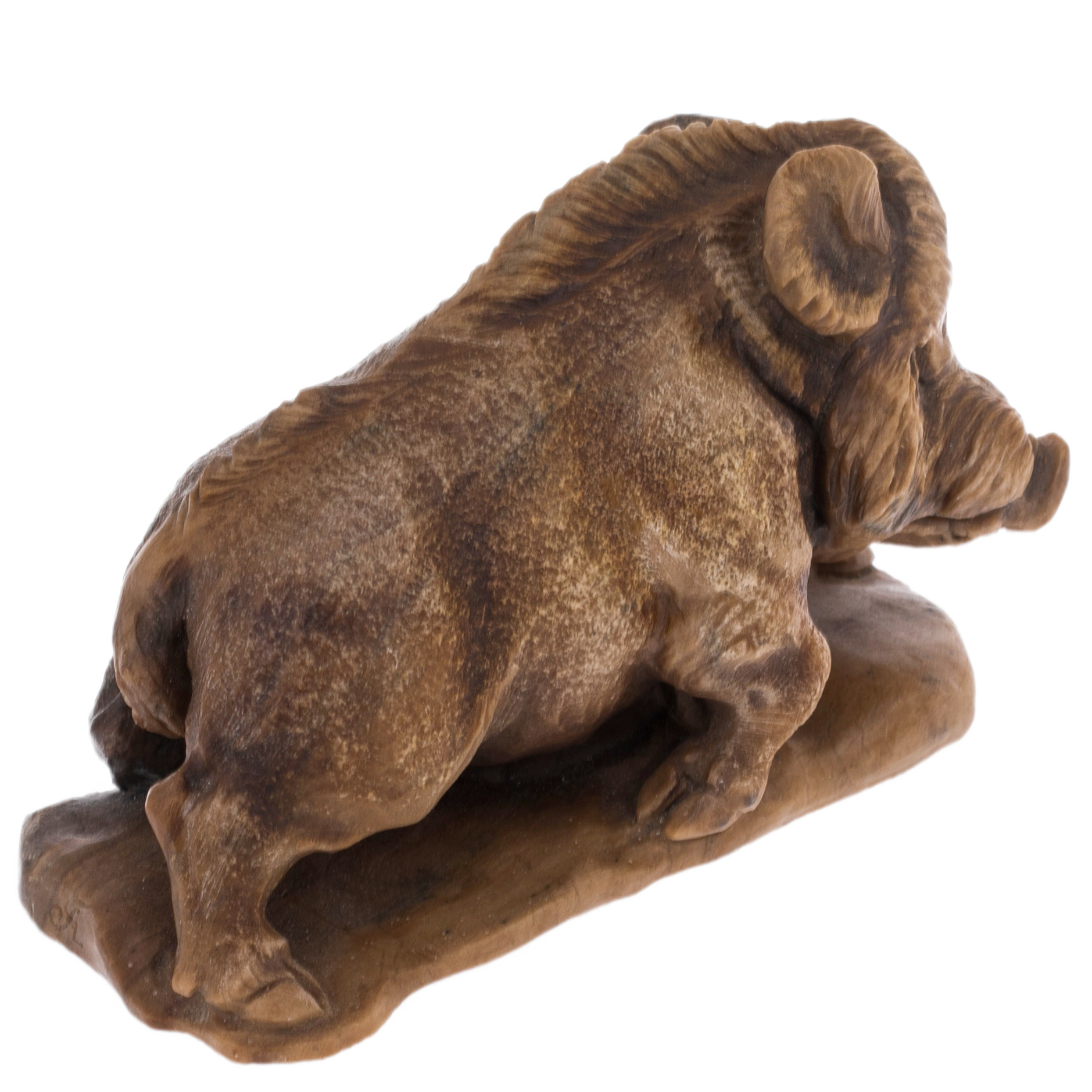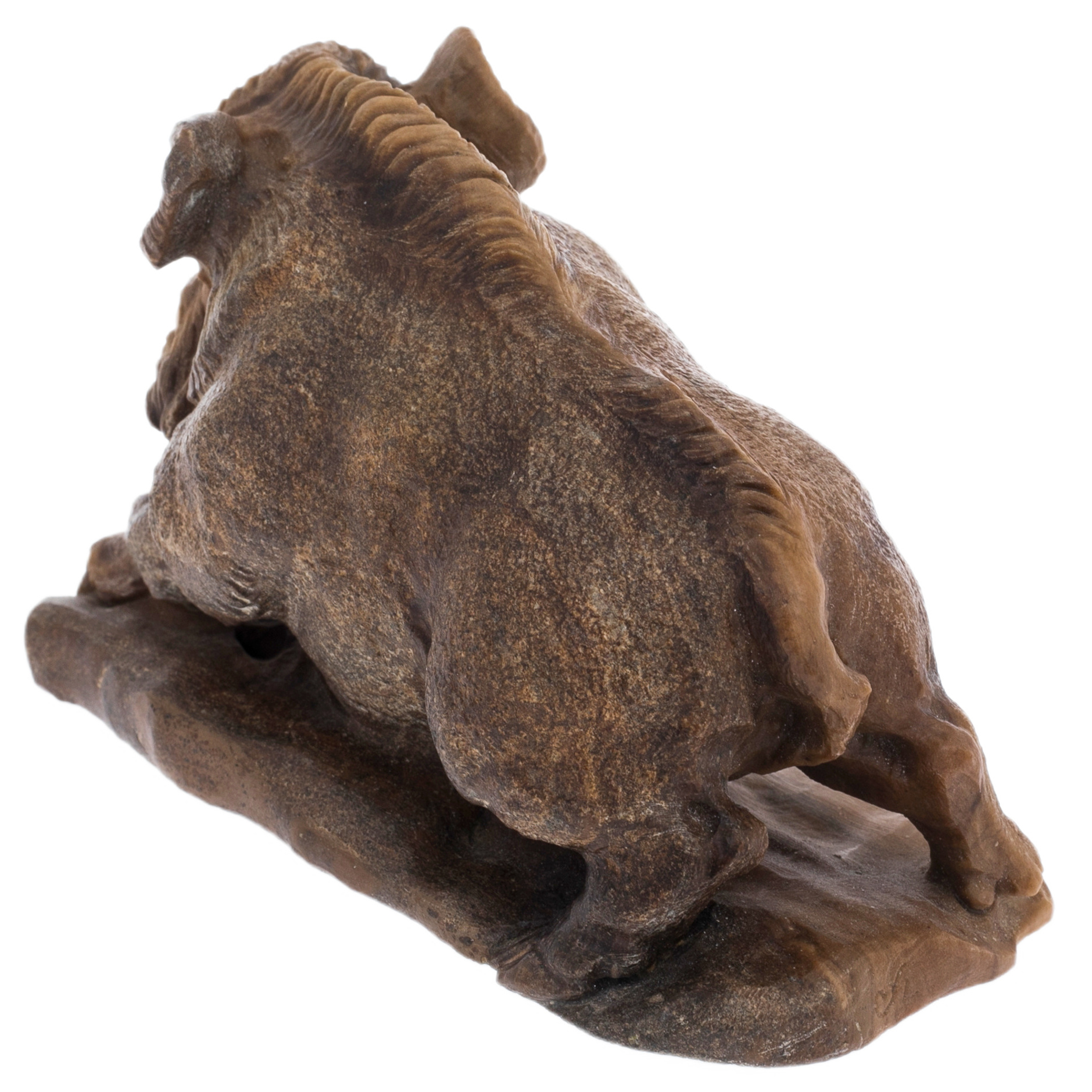 Изделие создано из камня, прошедшего тщательную обработку вручную — каждый элемент отшлифован, но при этом сохранён эффект естественности. Линии композиции лаконичны и выразительны, а поза кабана выражает готовность к движению, что придаёт фигуре живость и напряжённую энергию. Основание, как продолжение формы, усиливает целостность образа, делая акцент на центральной фигуре без излишнего декора. В зависимости от освещения, поверхность камня играет разными оттенками, добавляя работе глубины и пластичности.