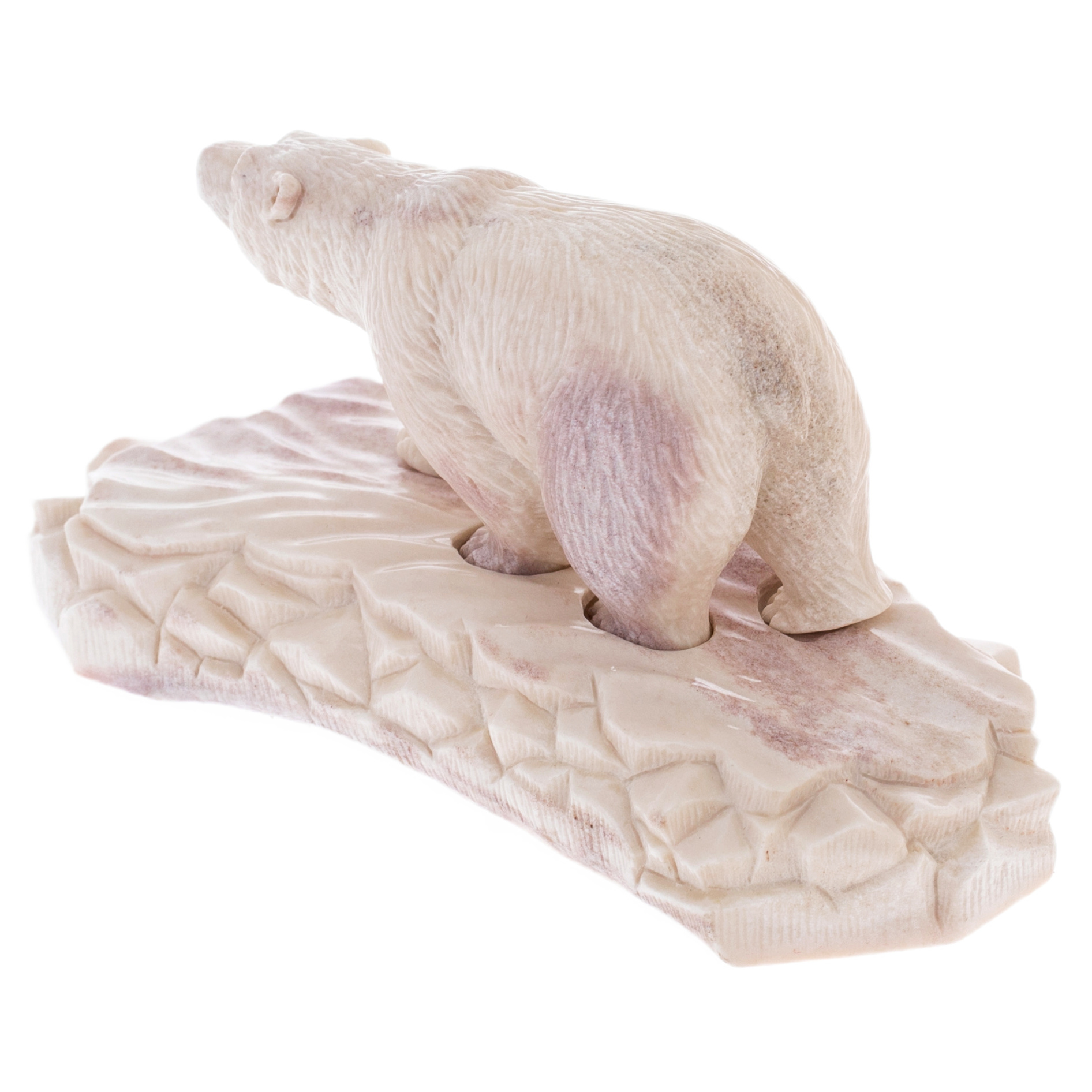 Его лапы, вырезанные с поразительной точностью, касаются поверхности, напоминающей застывшую симфонию зимы, будто сама природа запечатлела миг своей вечности. Легкий розовый оттенок на роге напоминает о закатах, отражающихся в ледяных зеркалах, и о том, что даже в холоде есть место теплу. А в выразительных глазах медведя, созданных искусным мастером, читается древняя мудрость, несущая тайны тысячелетий.