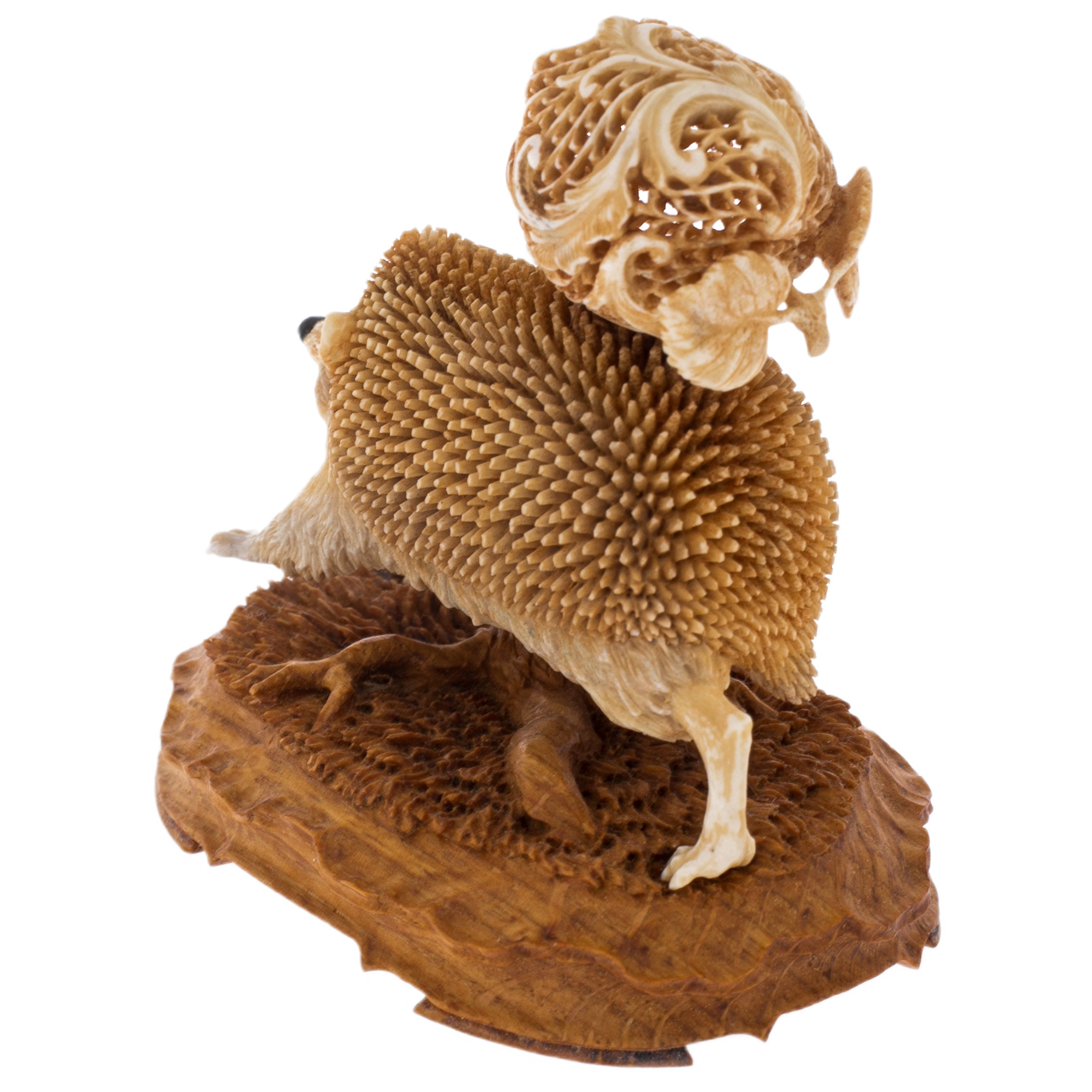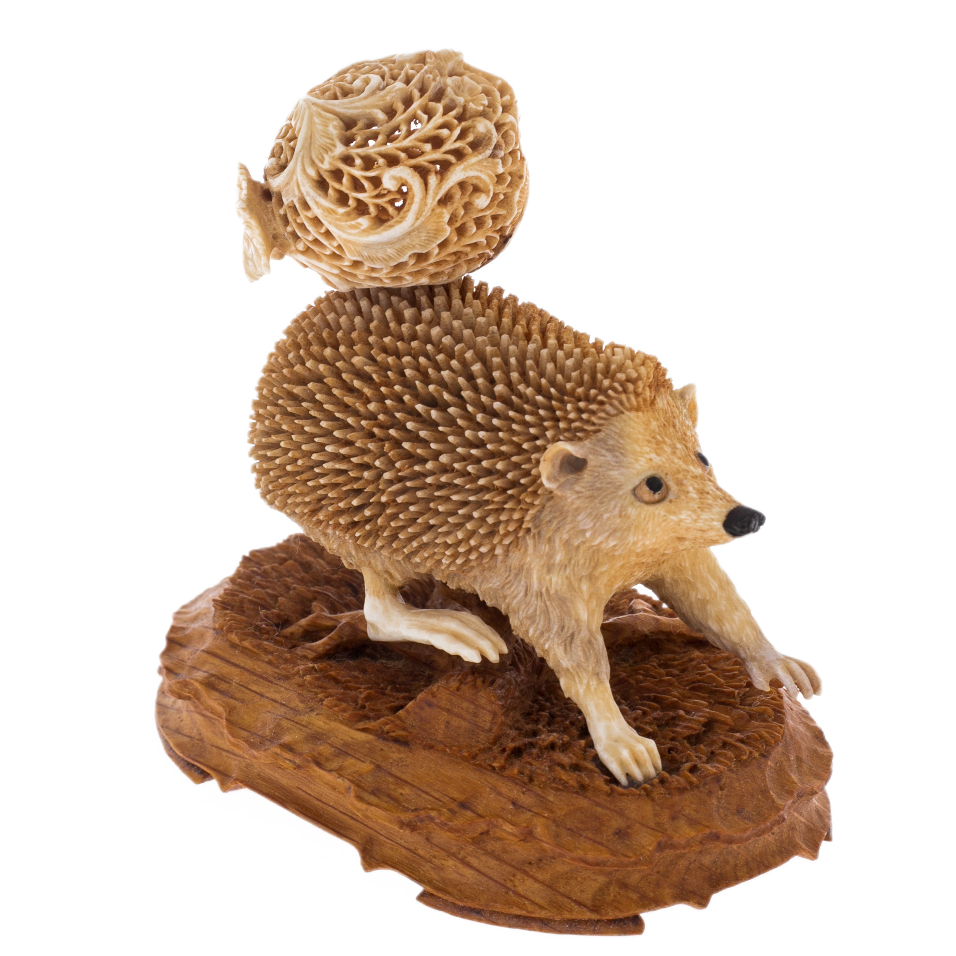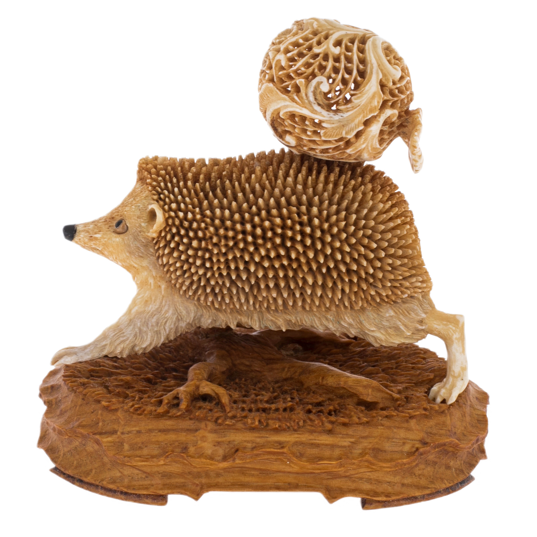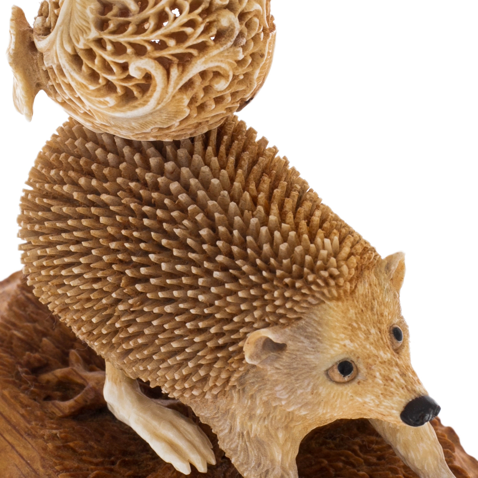 Ёж, вырезанный из рога лося, застыл в мгновении движения, оставляя впечатление почти живого присутствия. На его спине возвышается тончайшая резная композиция в форме яблока, выполненная в технике сквозной резьбы. Каждое острие иголок тщательно очерчено, передавая иллюзию мягкости и остроты одновременно. Взгляд зверька наполнен тихой решимостью — он будто спешит сквозь лес, унося на спине символ изобилия. Основание из дерева с естественной текстурой коры задаёт изделию прочную опору и завершённость, органично связывая его с природным ландшафтом.