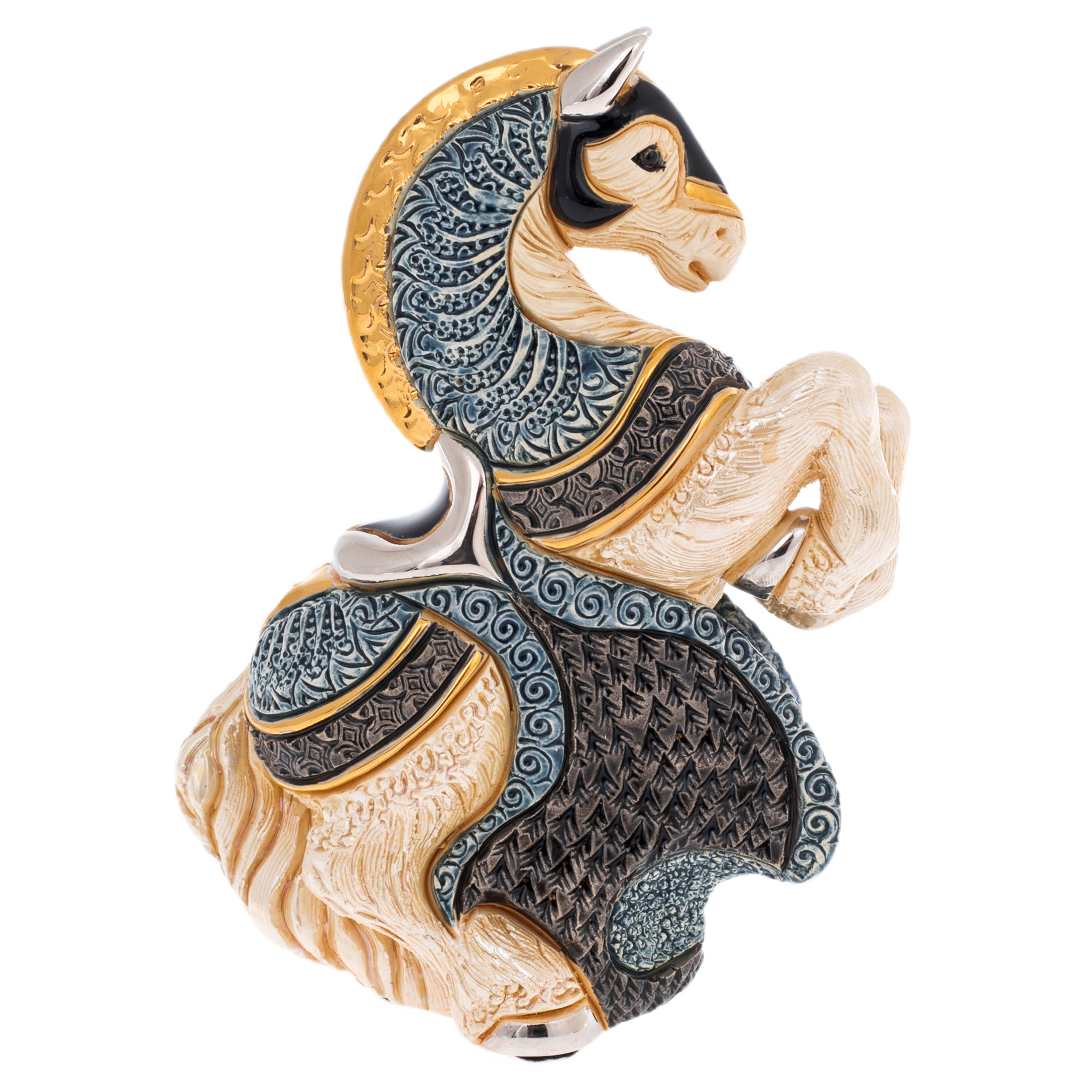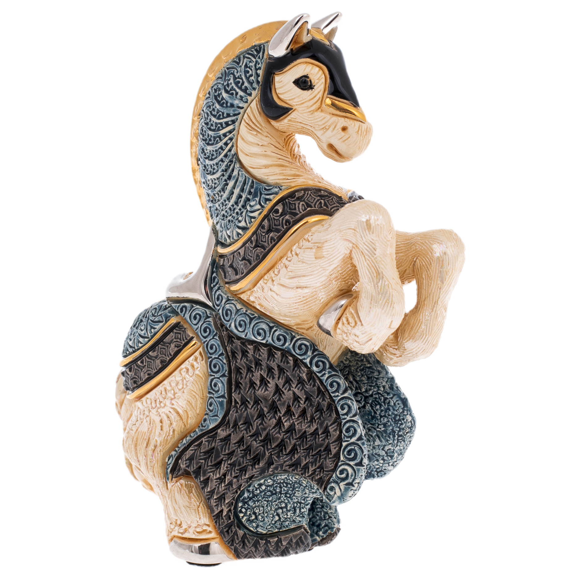 Керамическая статуэтка лошади в попоне — эффектный интерьерный акцент, сочетающий динамику движения и выразительную силу образа. Фигура изображает момент вздыбленного порыва: лошадь встала на задние ноги, высоко закинув передние, корпус изогнут в мощном напряжении, а шея вытянута вперёд. Скульптор точно уловил момент энергии и стремления, передав через пластику форм ощущение силы, отваги и благородного нрава. Поверхность изделия матовая, с изящными глянцевыми акцентами, подчёркивающими элементы убранства и придающими фигуре выразительное сияние.