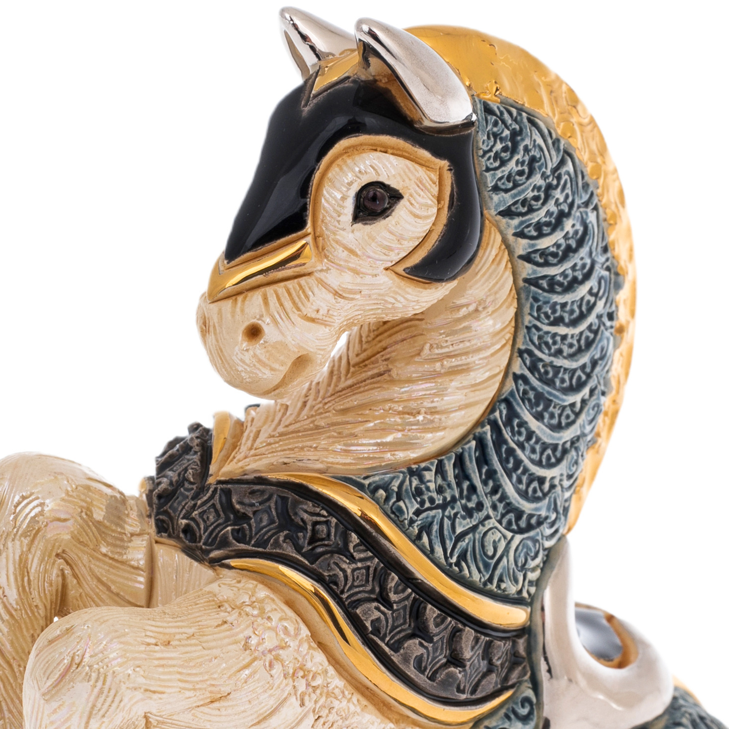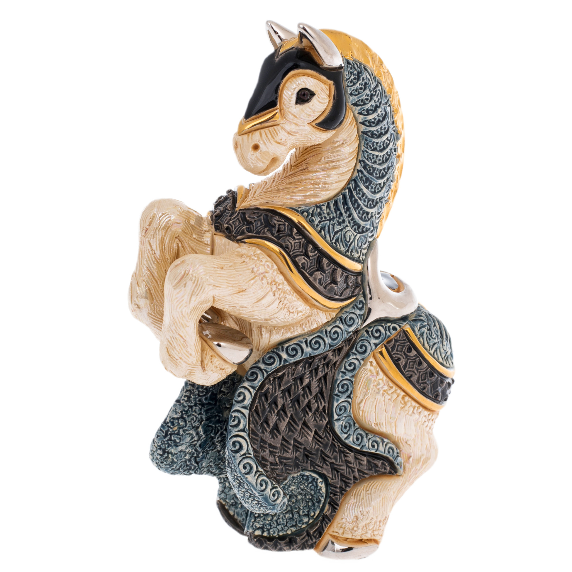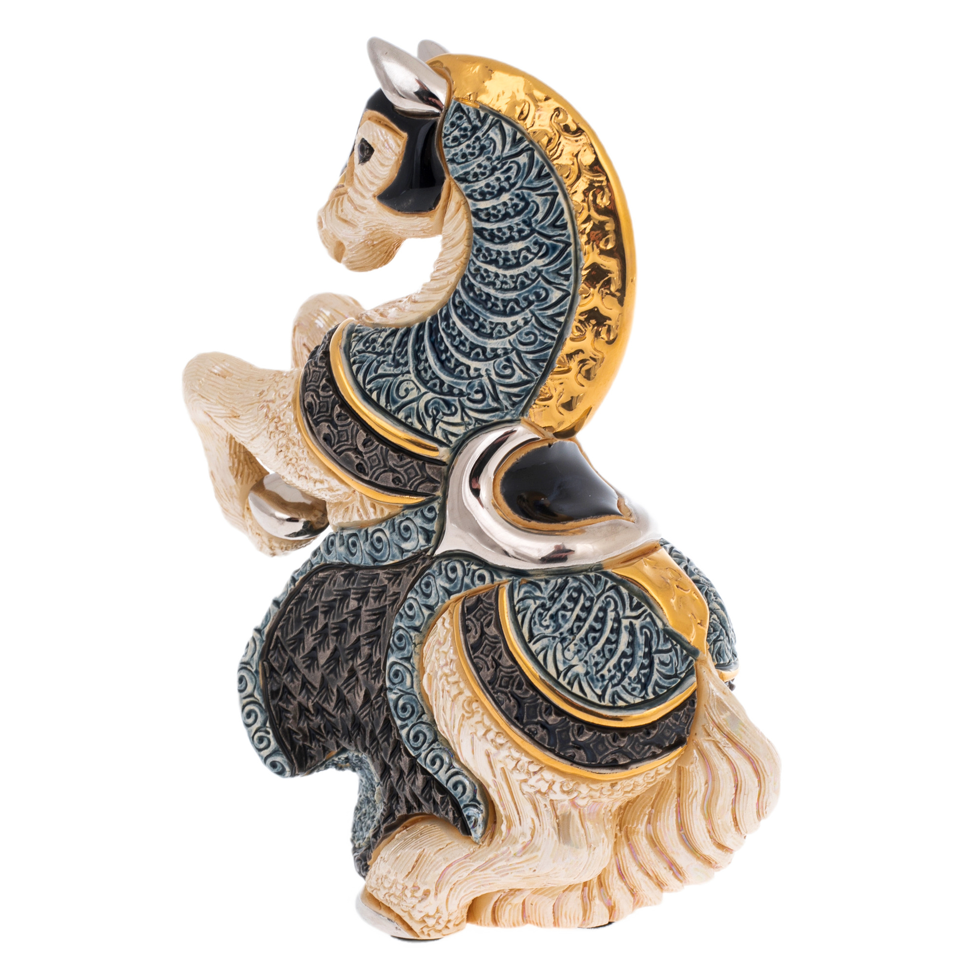 Керамика как материал позволяет достичь изысканного сочетания прочности и художественной выразительности. Ручная работа придаёт каждой детали живость и характер — ни один экземпляр не повторяет другой буквально. Особое внимание уделено драпировке попоны: она ложится мягкими складками, подчёркивая гордую стать животного и создавая живописный контраст с гладкостью корпуса. Обжиг при высокой температуре обеспечивает долговечность и стойкость покрытия, позволяя сохранять насыщенность цвета и целостность формы на протяжении многих лет.
