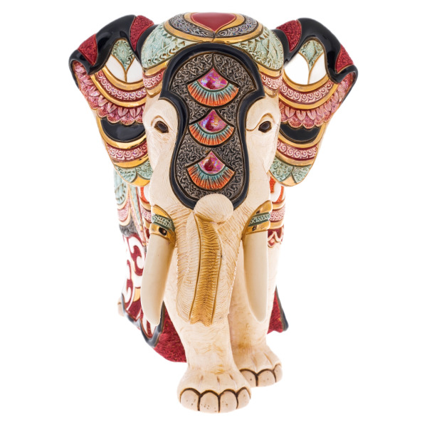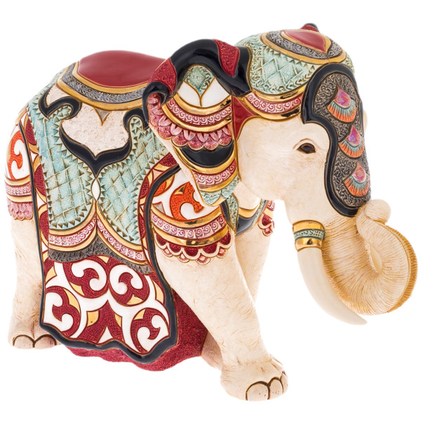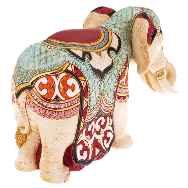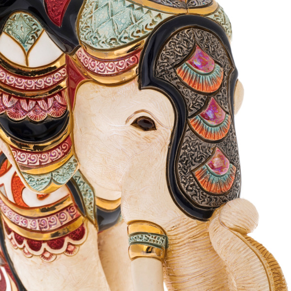 Изготовленная из высококачественной керамики, скульптура поражает своей детализацией. Слон, изображенный в царственном величии, выполнен с таким мастерством, что каждый изгиб его могучего тела, каждое прикосновение к ним передает ощущение силы и утонченной элегантности. Прекрасно проработанные детали, включая изысканные рельефные узоры и роскошные украшения, подчеркивают царственный статус этого великолепного животного.