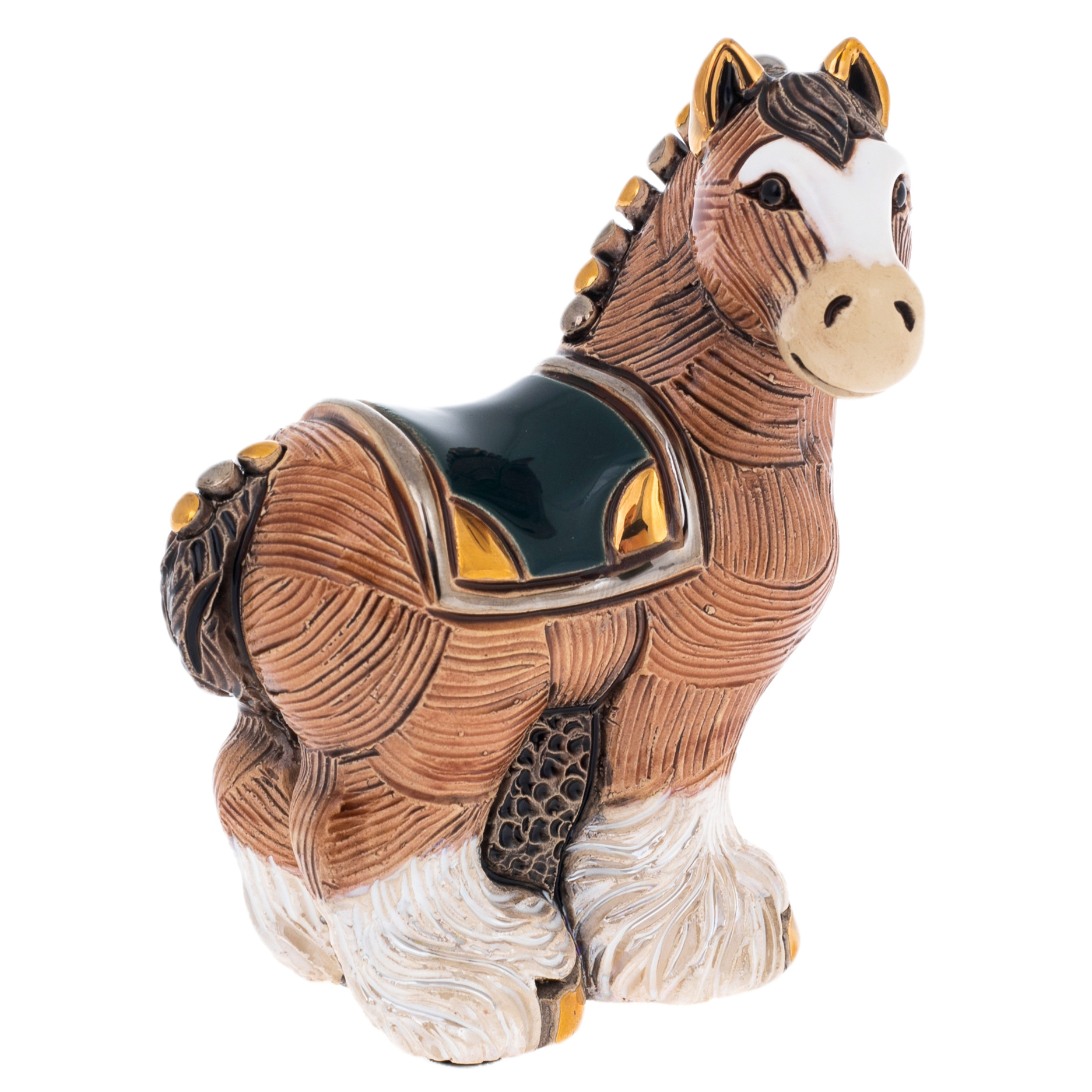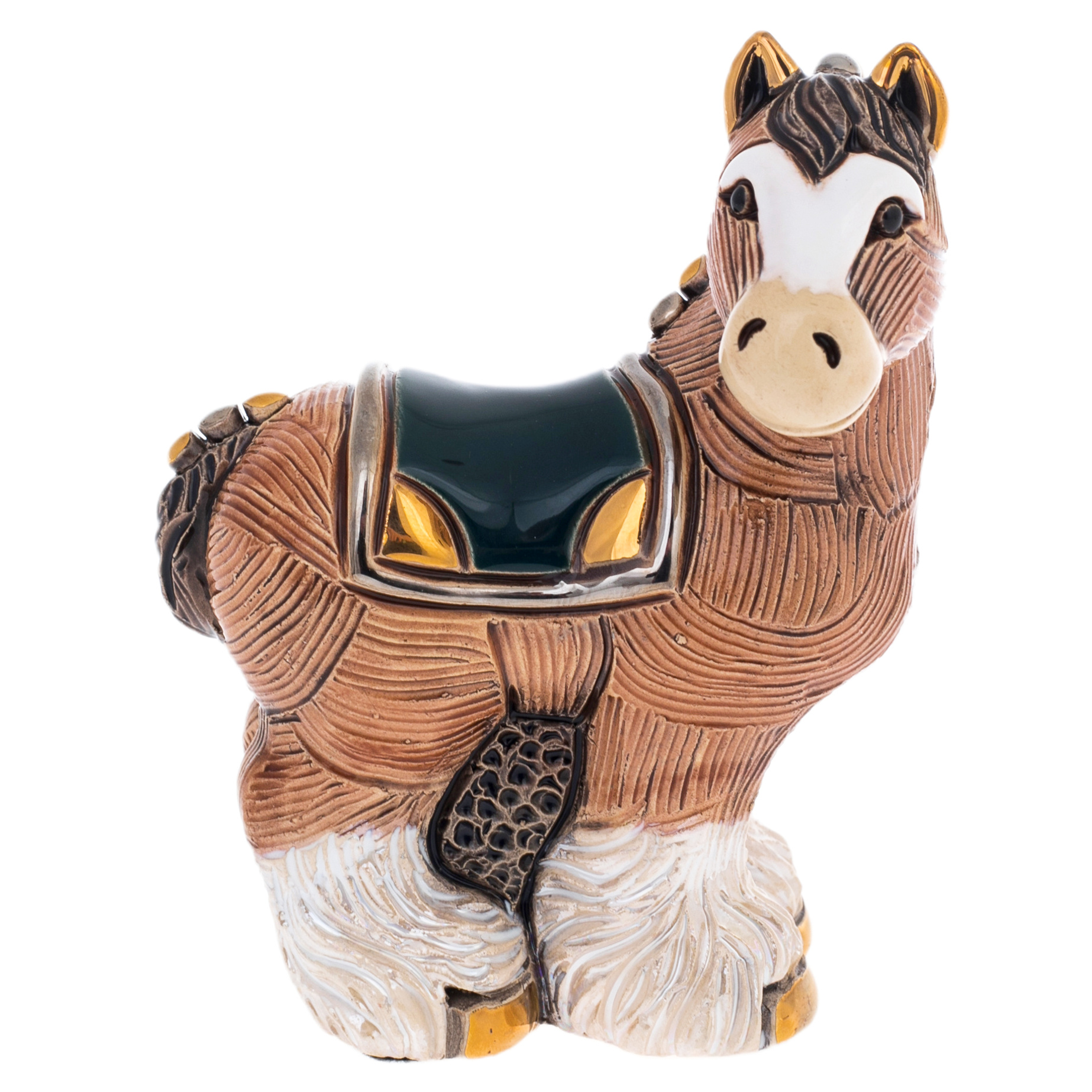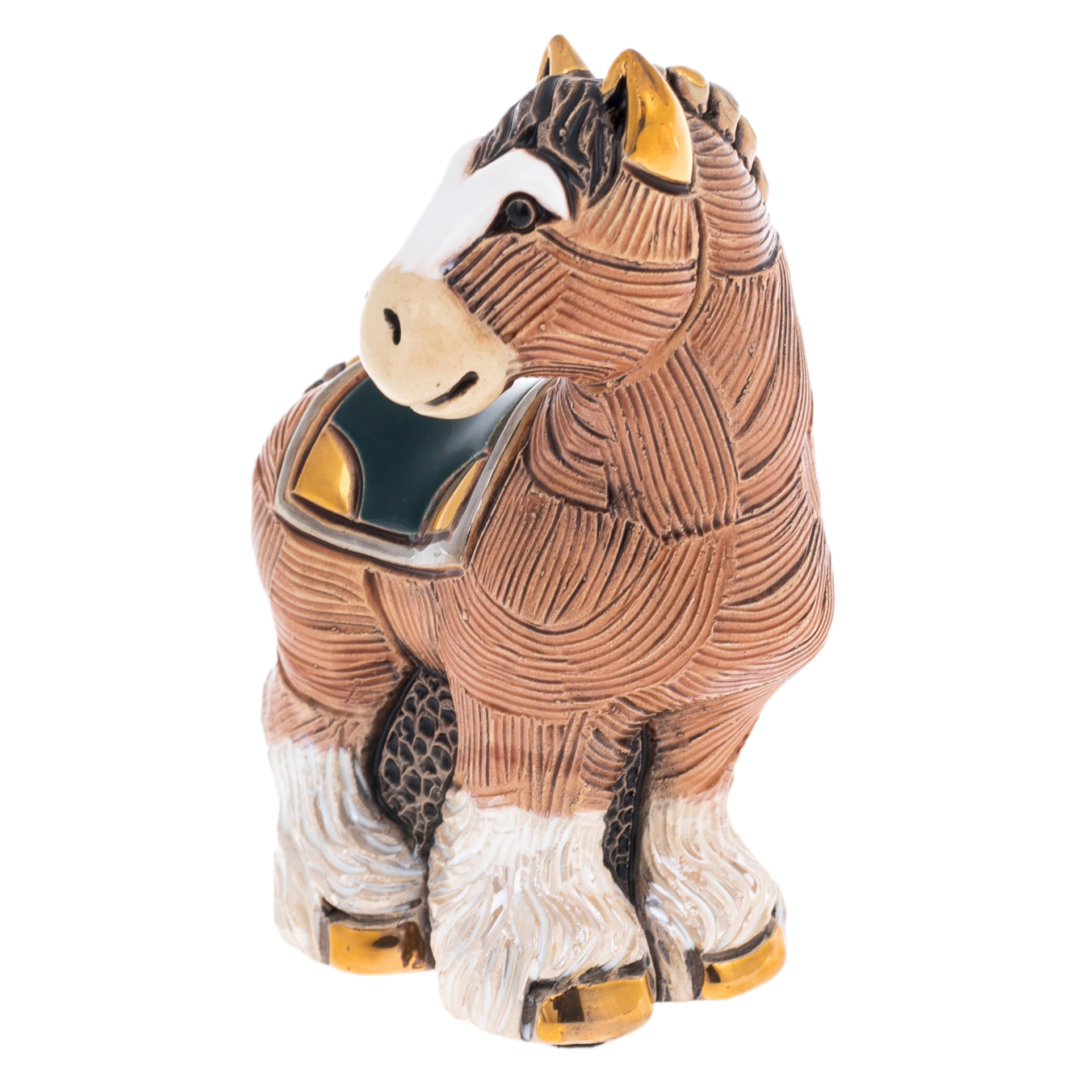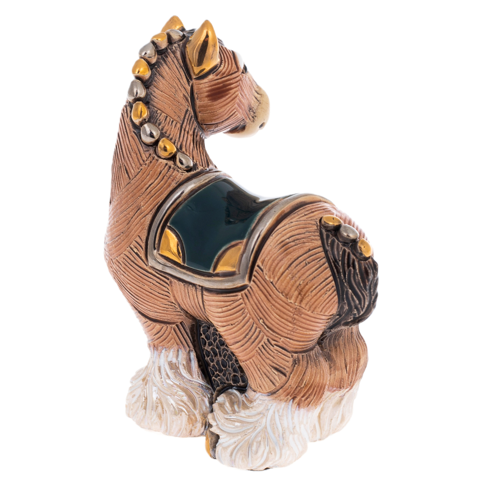 Статуэтка лошади из керамики с эмалью — очаровательный предмет коллекционного и декоративного значения, наполненный символикой силы, упорства и благородства. Образ мощного рабочего коня выполнен в стилизованной форме, с преувеличенно широким корпусом и крупными копытами, подчёркивающими устойчивость и надёжность. Поверхность корпуса имитирует текстуру густой шерсти, выразительно проработанной вручную. Особое внимание привлекает седло, покрытое эмалью глубокого тёмно-зелёного оттенка с золотыми вставками, плавно переходящими в оправу из металла с зеркальным блеском.