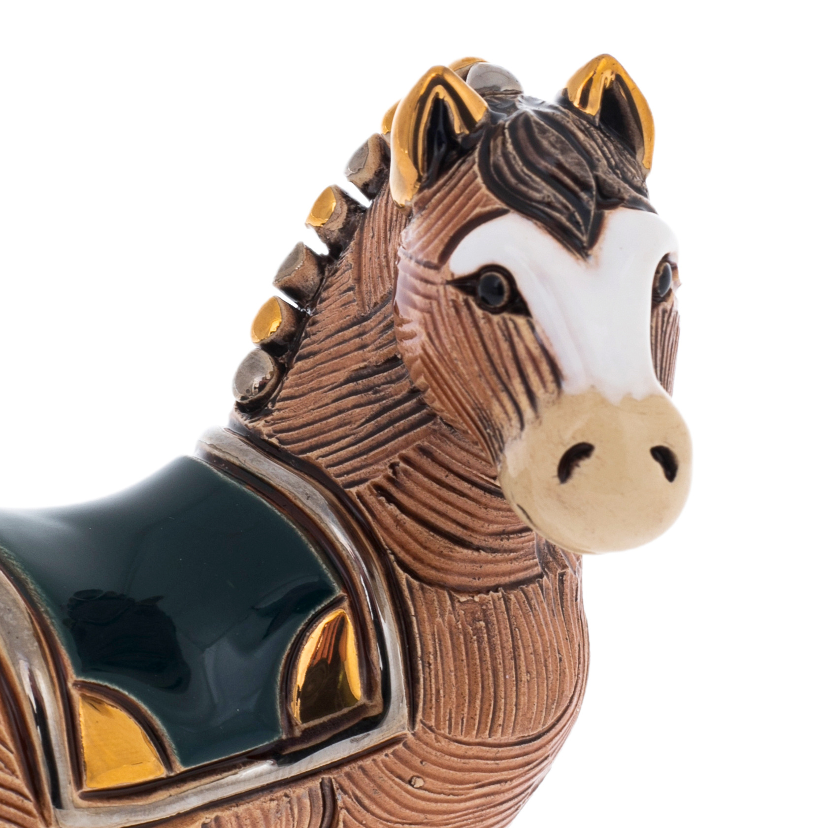 Украшения на гриве, крупе и хвосте дополнены мельчайшими деталями с применением полупрозрачной глазури и золотого покрытия. Такие элементы изготавливаются с использованием традиционных эмалевых техник, требующих обжига при высокой температуре, благодаря чему изделие приобретает насыщенные цвета и стойкий блеск. Работа мастера ощущается в каждой детали — от рельефных узоров до плавности силуэта и выразительного взгляда лошади, наделённой почти человеческой теплотой. Эффектный контраст между матовой керамической основой и глянцевыми эмалевыми акцентами создаёт ощущение живого движения.