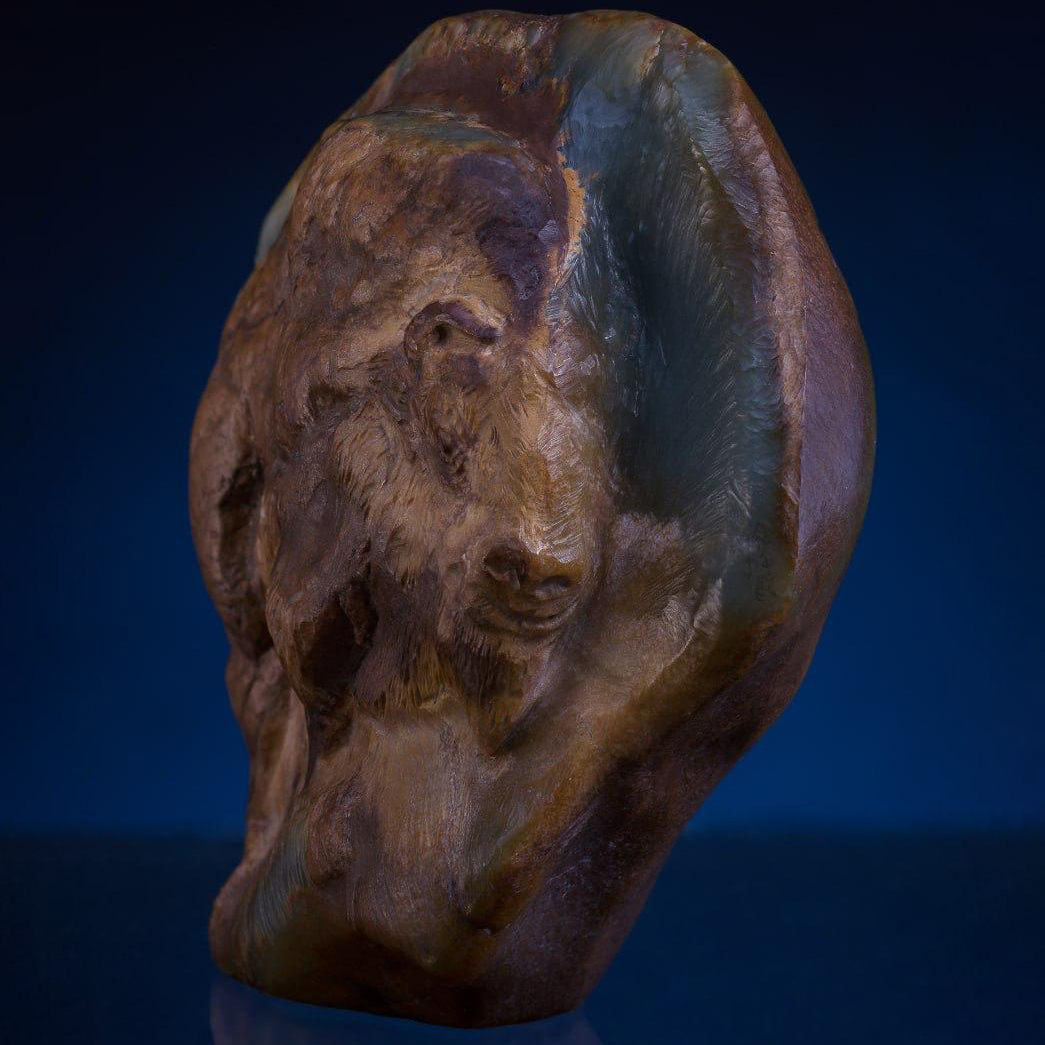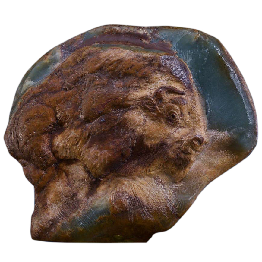 Массивная авторская скульптура из нефрита, изображающая голову могучего бизона, являет собой шедевр, воплощающий природную силу и непоколебимую уверенность. Каждая линия, вырезанная из глубоких зелёных недр камня, словно рассказ о величии дикой степи, где властвует этот символ неукротимого духа.