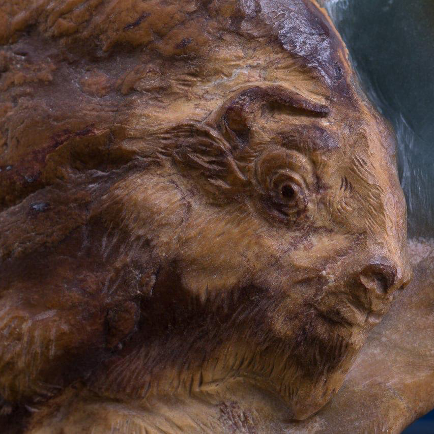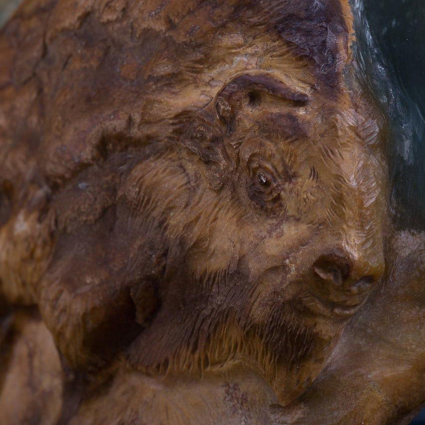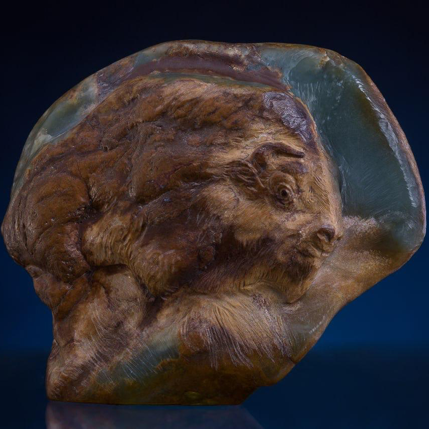 Нефрит, насыщенный оттенками от густого изумрудного до прозрачного мха, был обработан с таким мастерством, что создаётся впечатление, будто бизон вот-вот оживёт, выпустив из своей груди громогласное рычание. Полированные поверхности сочетаются с рельефной текстурой, подчёркивая детали шерсти и резкие изгибы могучего лба, передавая не только физическую мощь, но и благородство древнего животного.