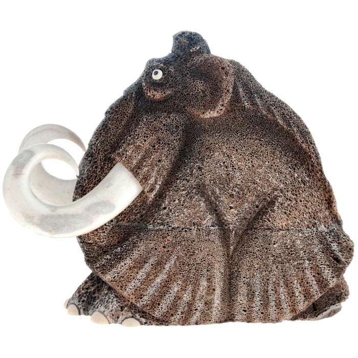 Скульптура «Чёрный мамонт» — редкий пример арт-объекта, в котором ироничный образ сочетается с глубоким уважением к ископаемой материи. Компактная по габаритам, но выразительная по пластике фигура выполнена из двух природных материалов, кардинально отличающихся по фактуре и тону. Основа вырезана из морщинистого, пористого сегмента позвонка кита, отполированного до шелковистого тактильного эффекта, но сохранившего свою органическую хаотичность. Массивные изогнутые бивни, точно вписанные в силуэт, выполнены из лосиного рога и придают фигуре особую завершённость. Глаза, акцентированные контрастными вставками, добавляют персонажу живости, делая его не абстрактным символом, а существом с характером и историей.
